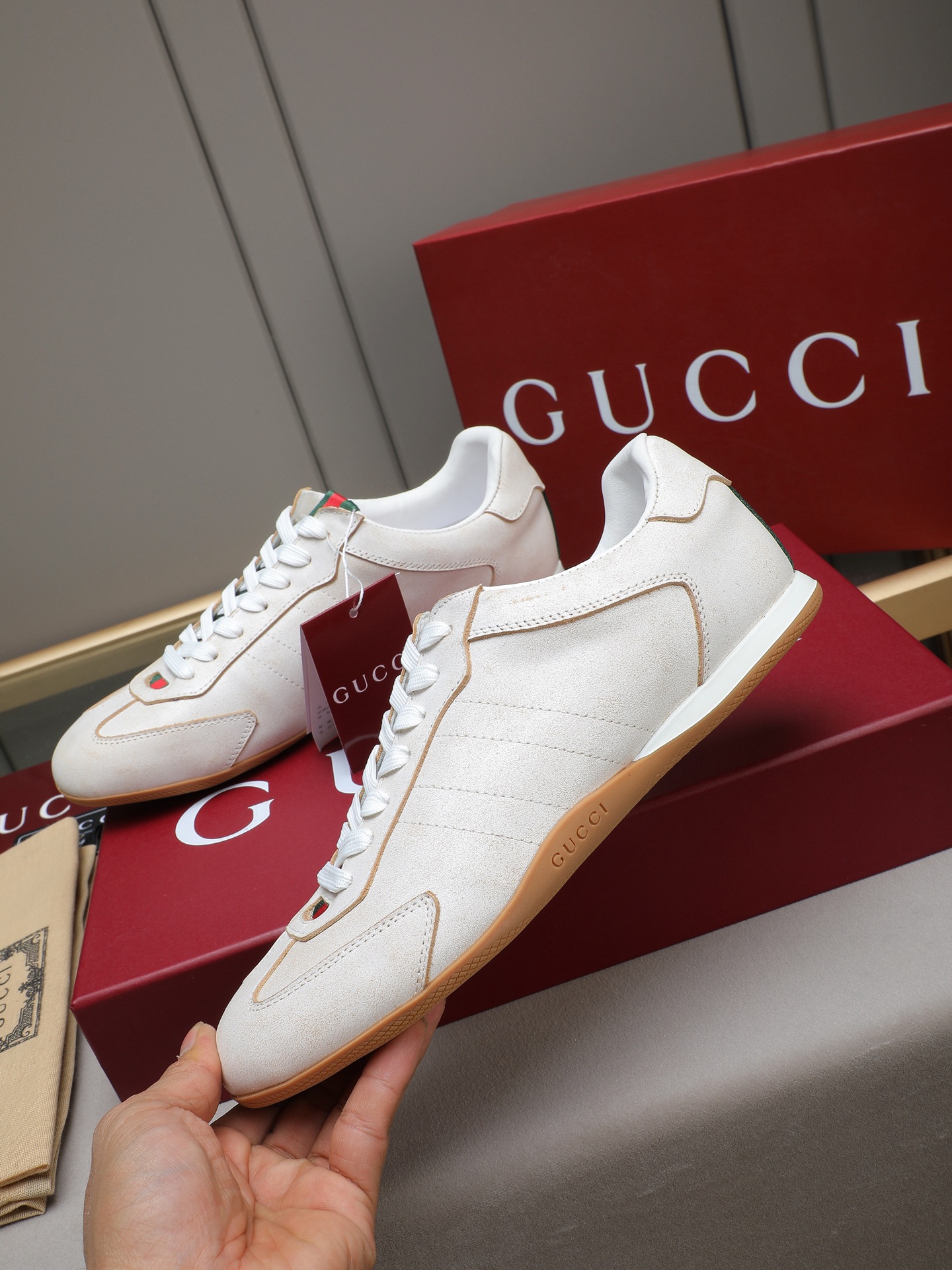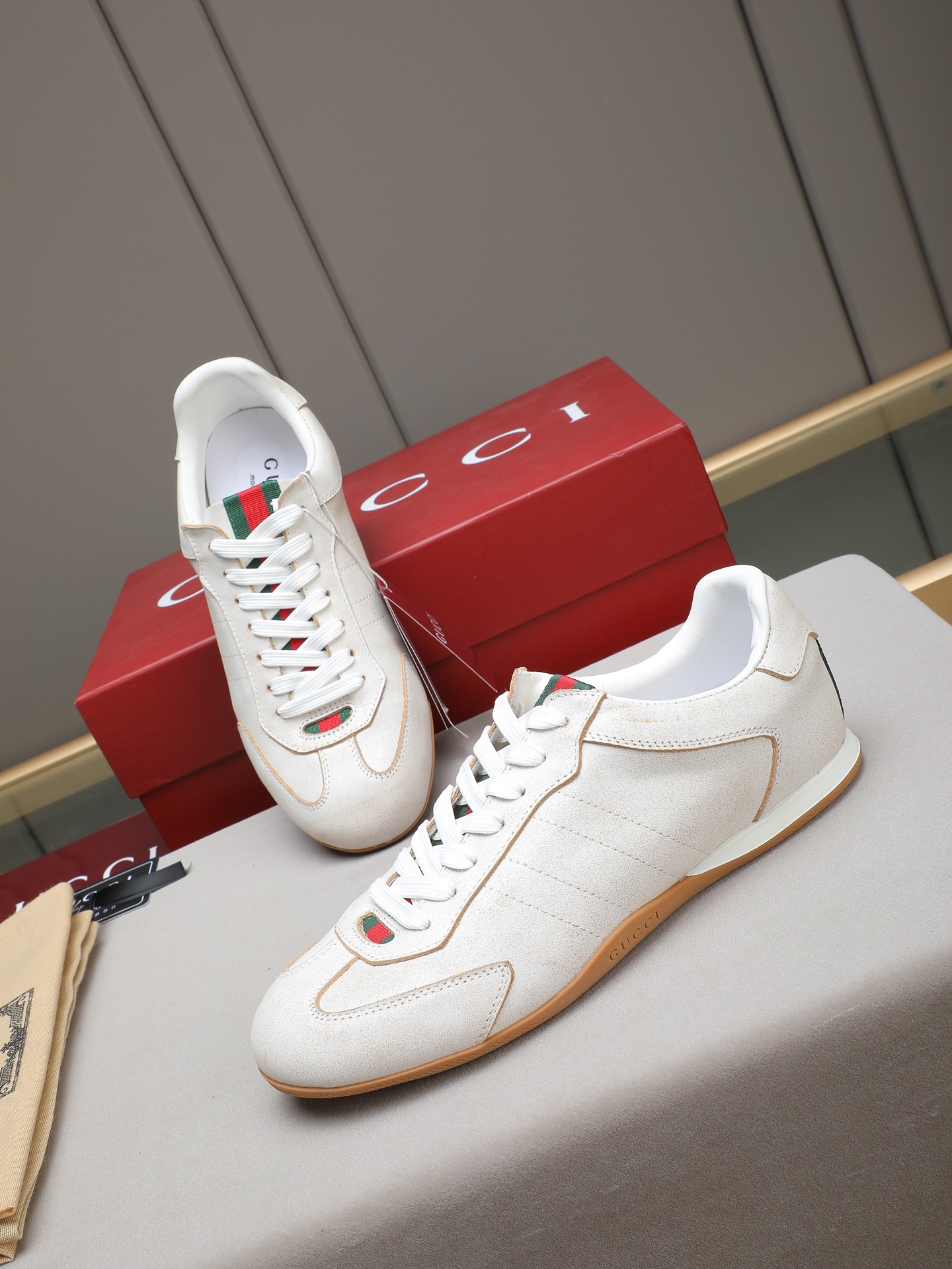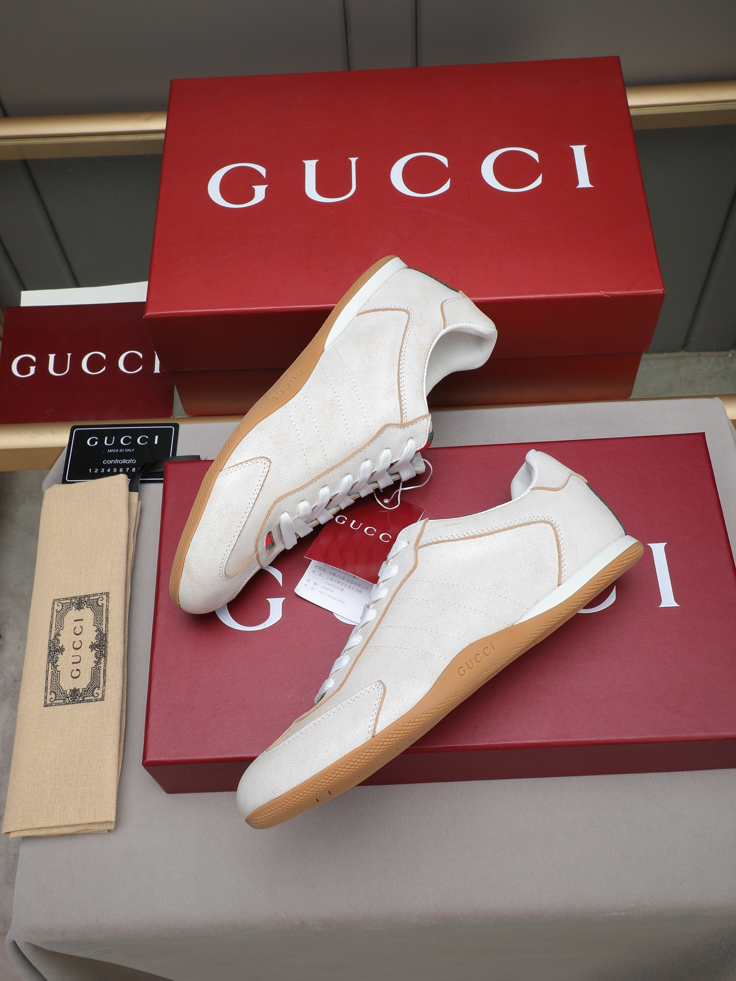 这款鞋子是AAAAA 1:1 质量 (非常棒). 使用了和原版一模一样的材料. 商标部分也保持了和古奇/Gucci一样. 图片拍摄是实物鞋子拍摄, 您所收到的实物保证和我们图片一模一样.