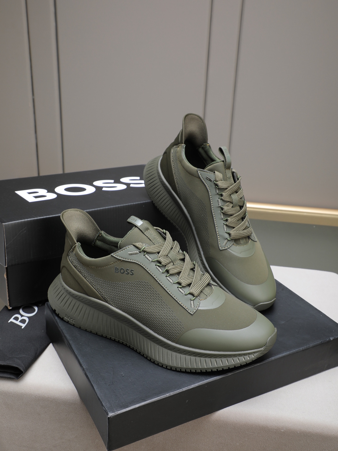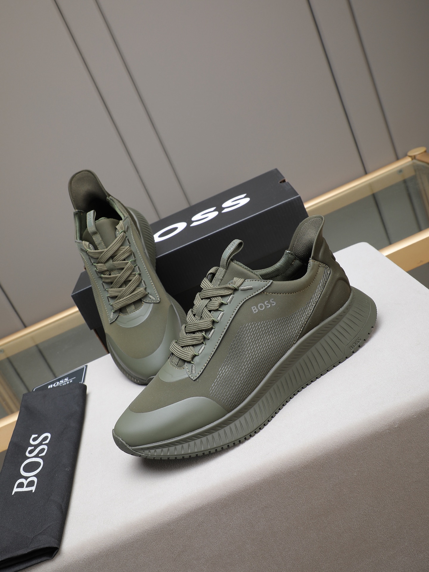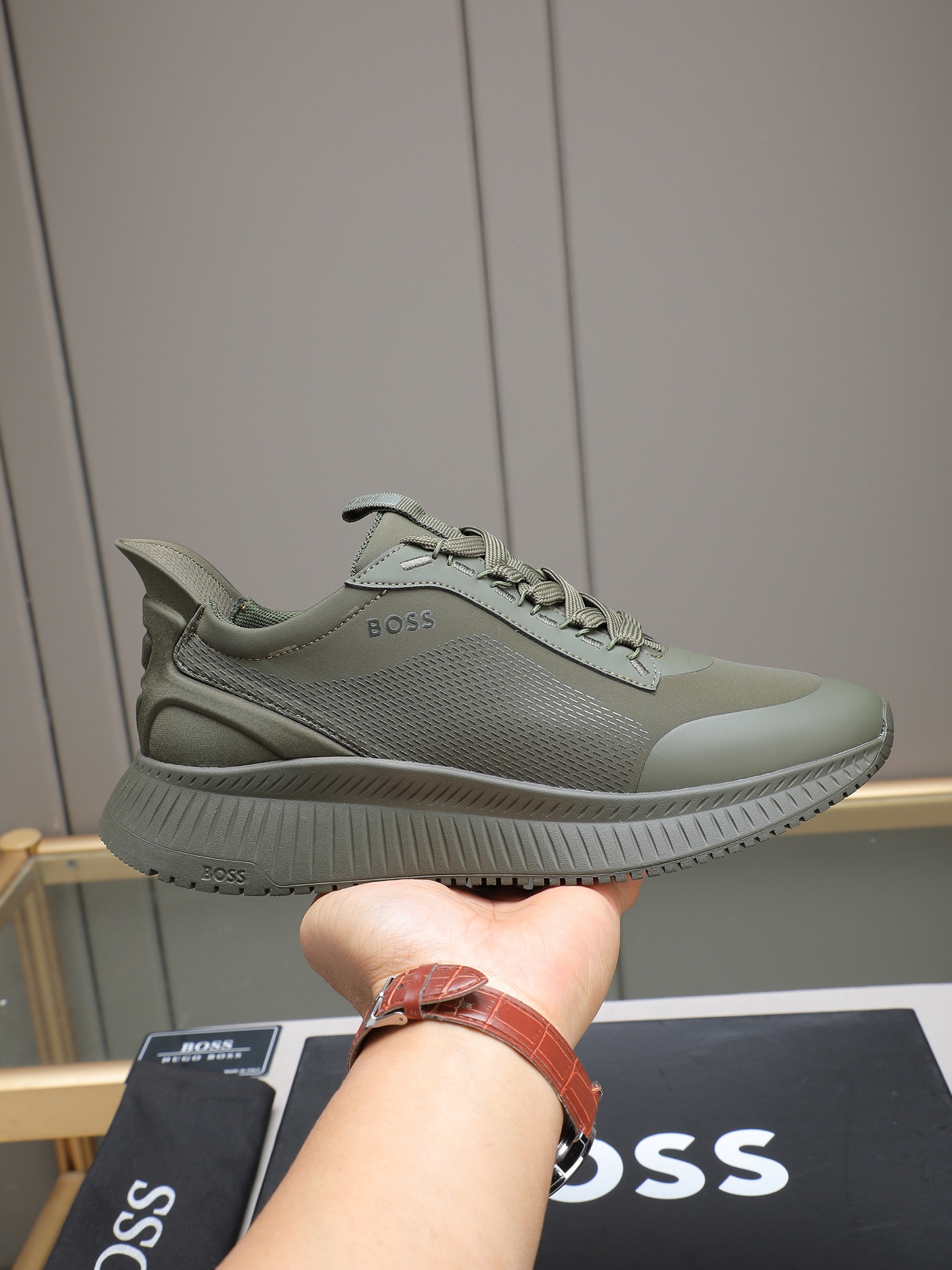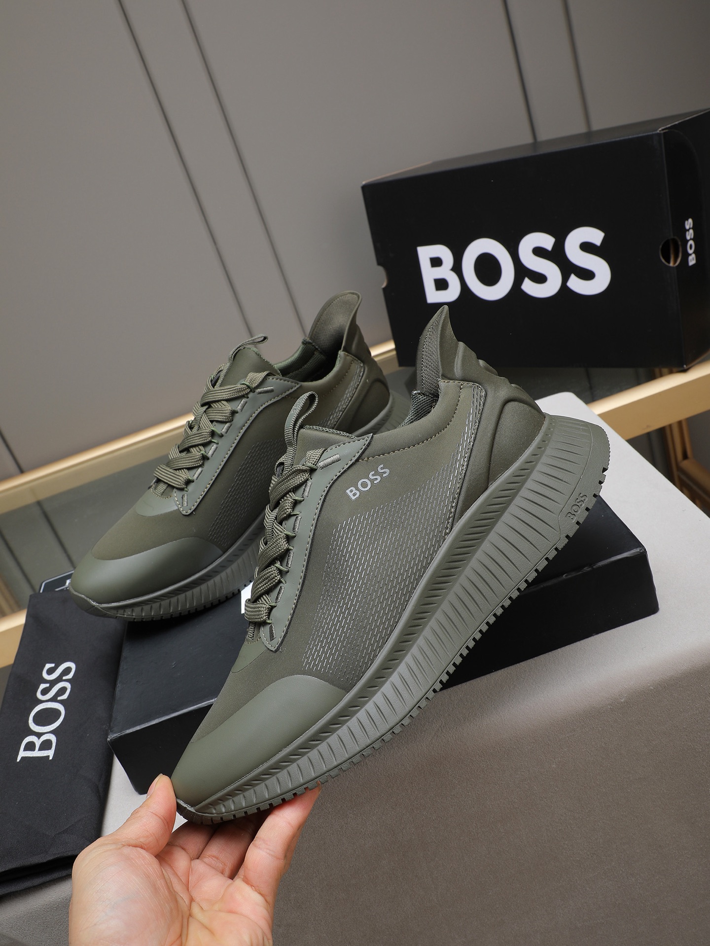 这款鞋子是AAAAA 1:1 质量 (非常棒). 使用了和原版一模一样的材料. 商标部分也保持了和BOSS一样. 图片拍摄是实物鞋子拍摄, 您所收到的实物保证和我们图片一模一样.
