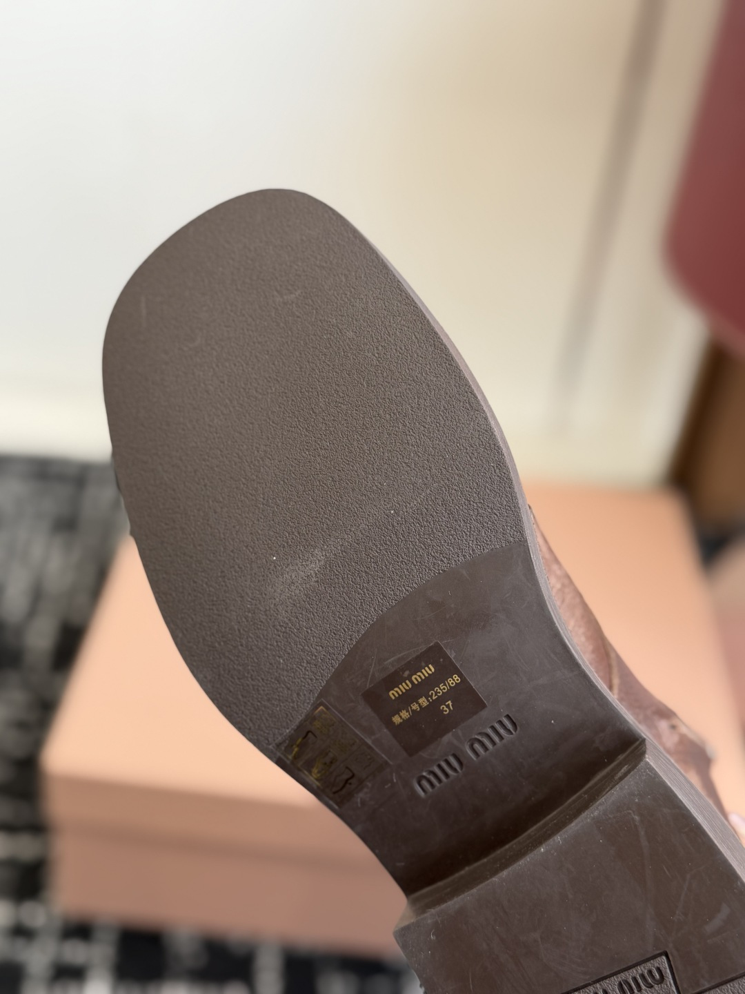 这款鞋子是AAAAA 1:1 质量 (非常棒). 使用了和原版一模一样的材料. 商标部分也保持了和缪缪/Miu Miu一样. 图片拍摄是实物鞋子拍摄, 您所收到的实物保证和我们图片一模一样.