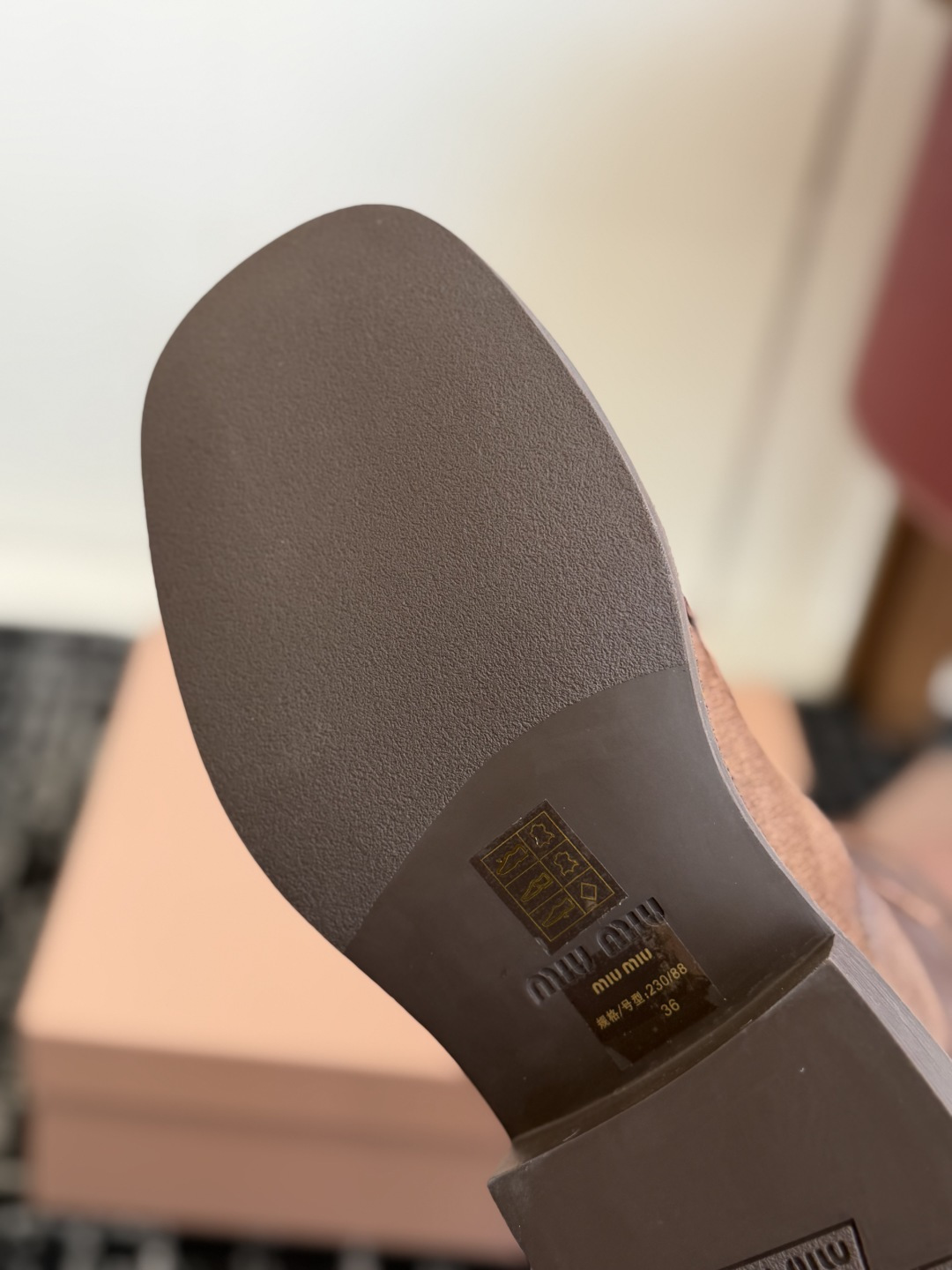 这款鞋子是AAAAA 1:1 质量 (非常棒). 使用了和原版一模一样的材料. 商标部分也保持了和缪缪/Miu Miu一样. 图片拍摄是实物鞋子拍摄, 您所收到的实物保证和我们图片一模一样.