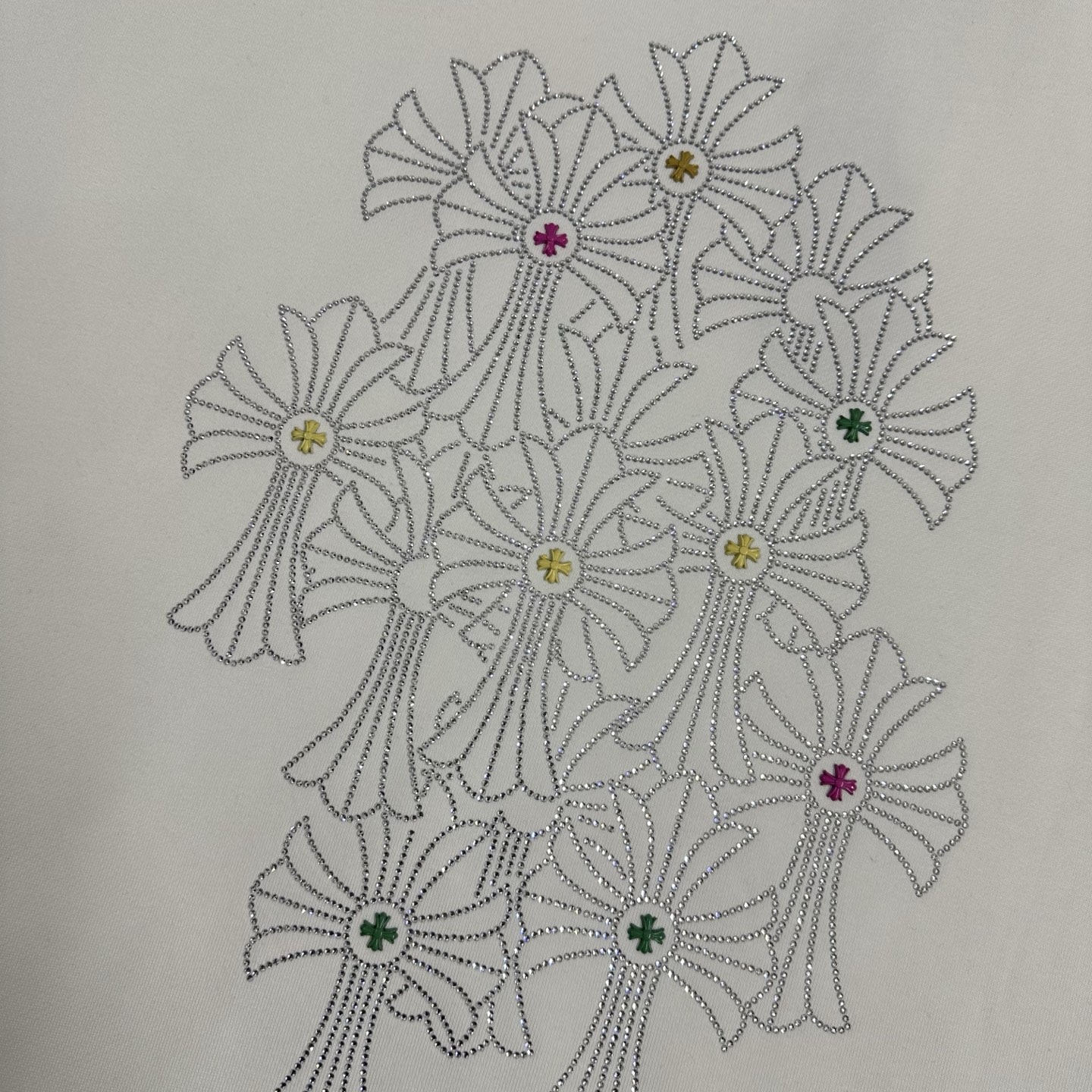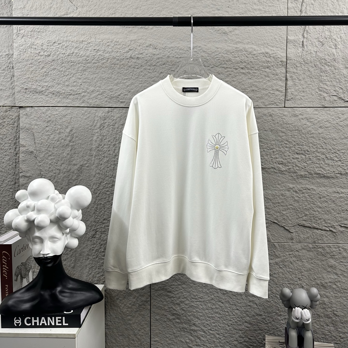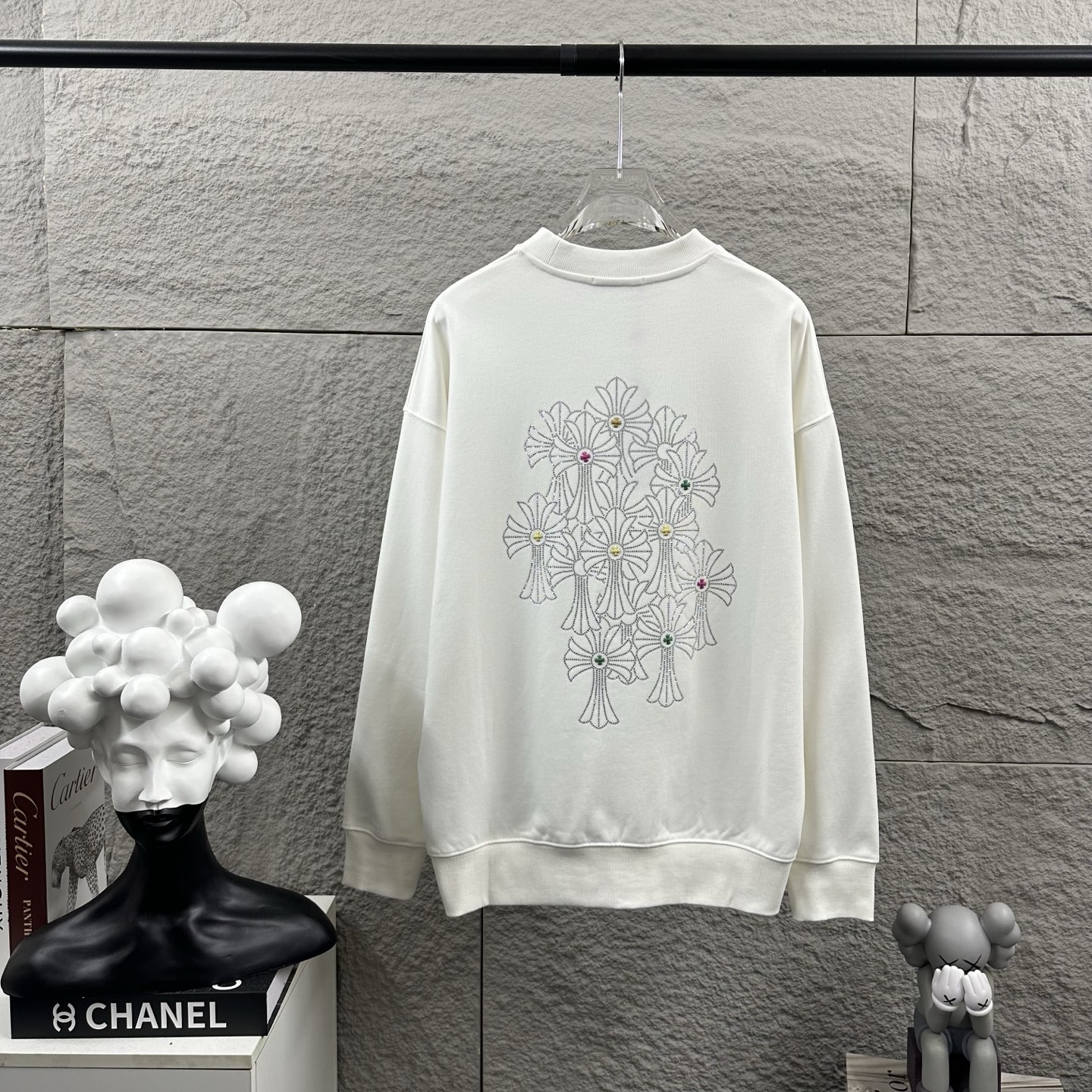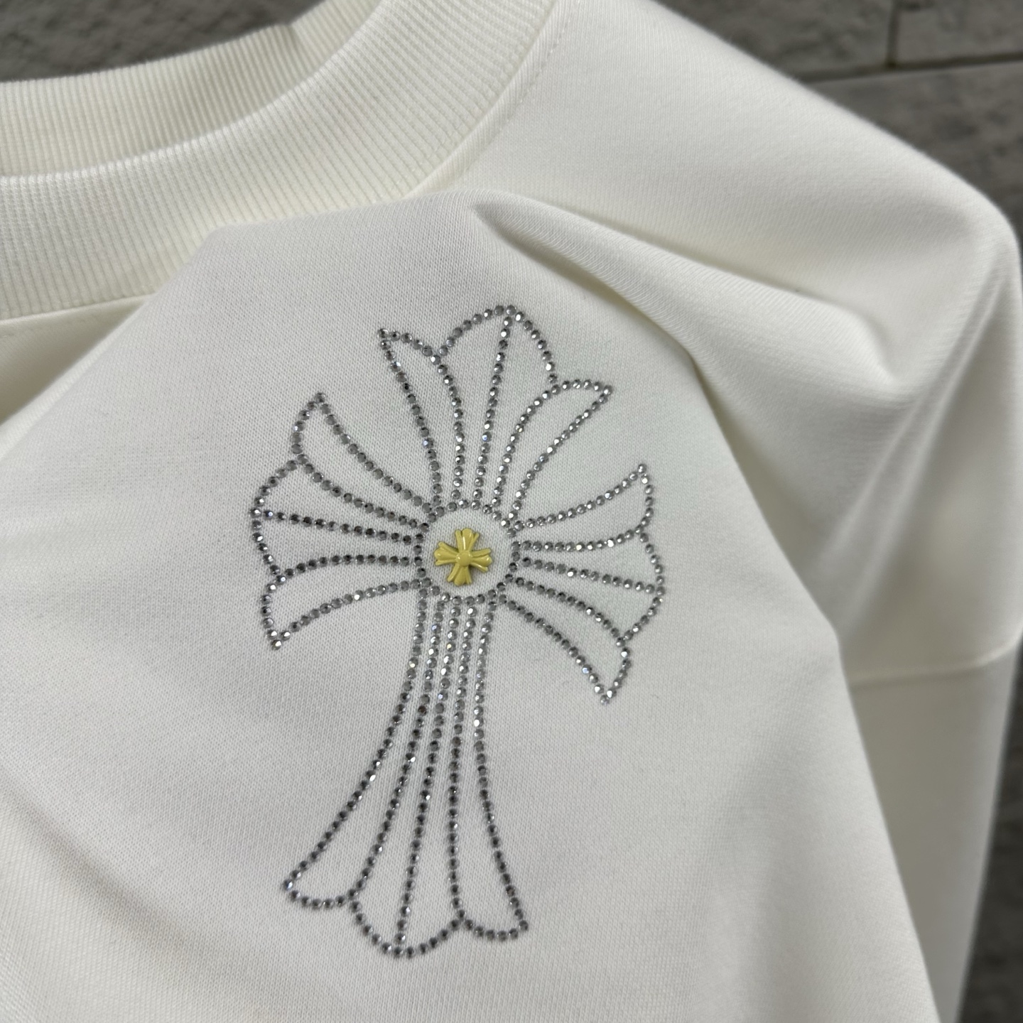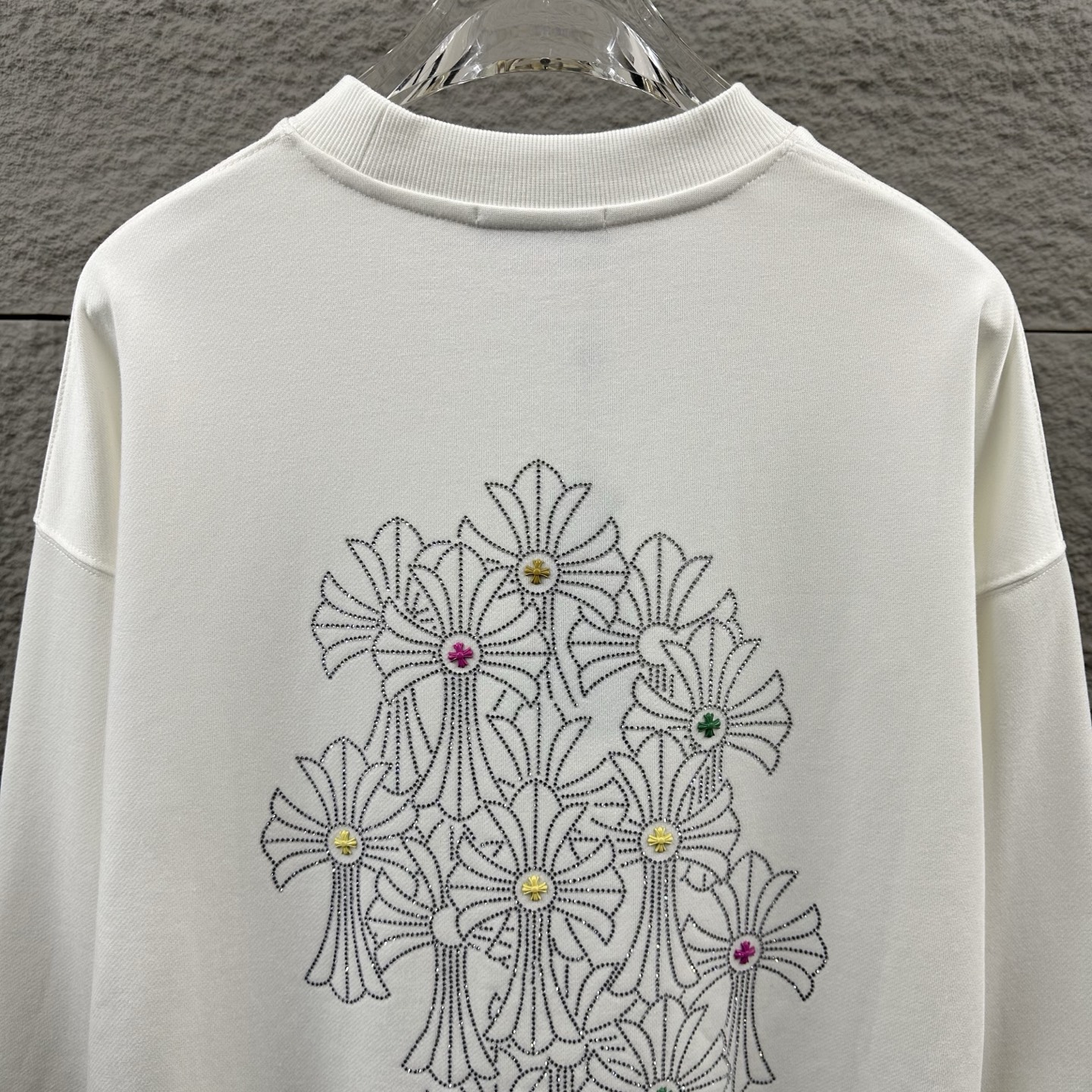 这款衣服是AAAAA 1:1 质量 (非常棒). 使用了和原版一模一样的材料. 商标部分也保持了和克罗心/Chrome Hearts一样. 图片拍摄是实物衣服拍摄, 您所收到的实物保证和我们图片一模一样.