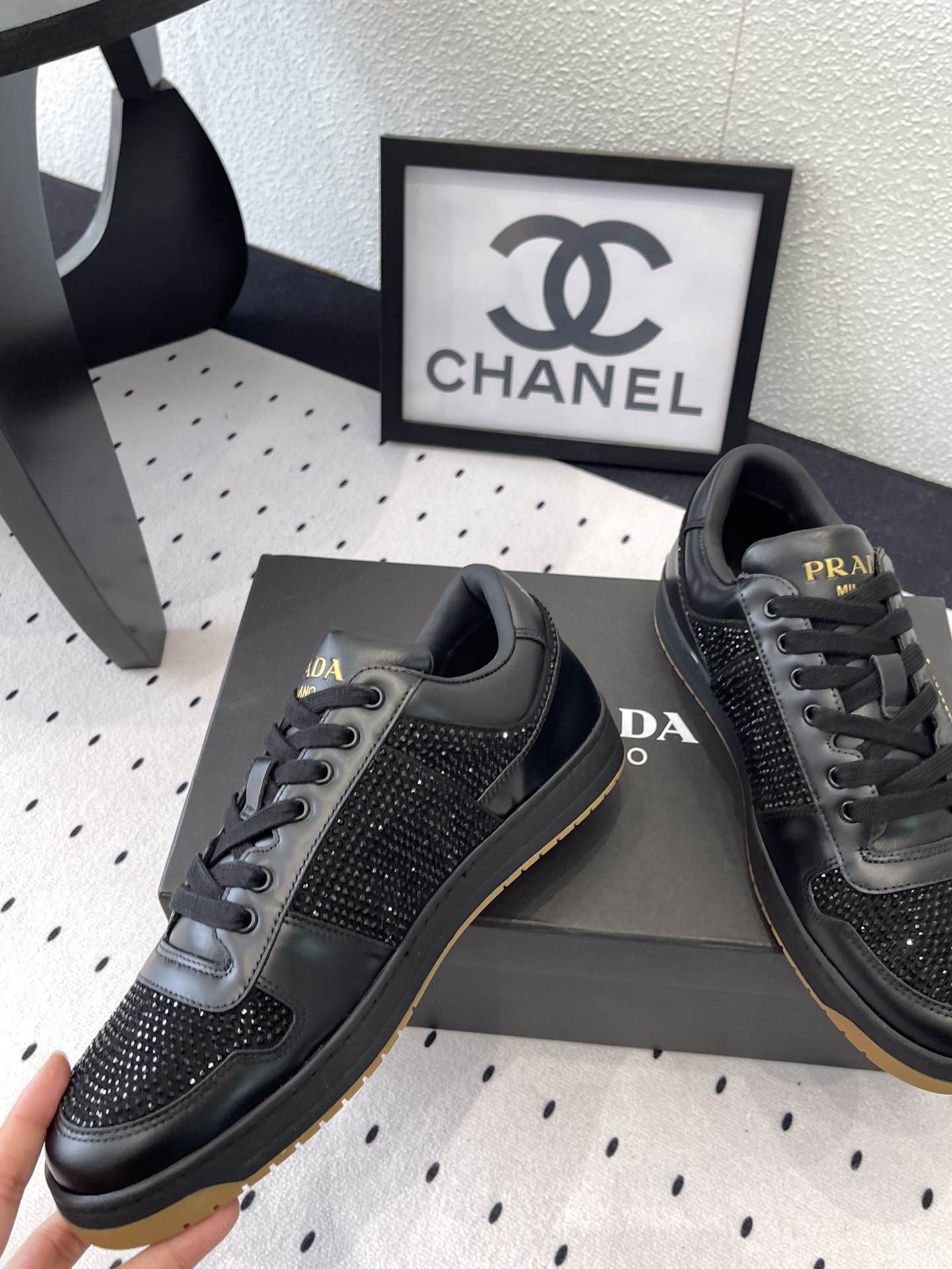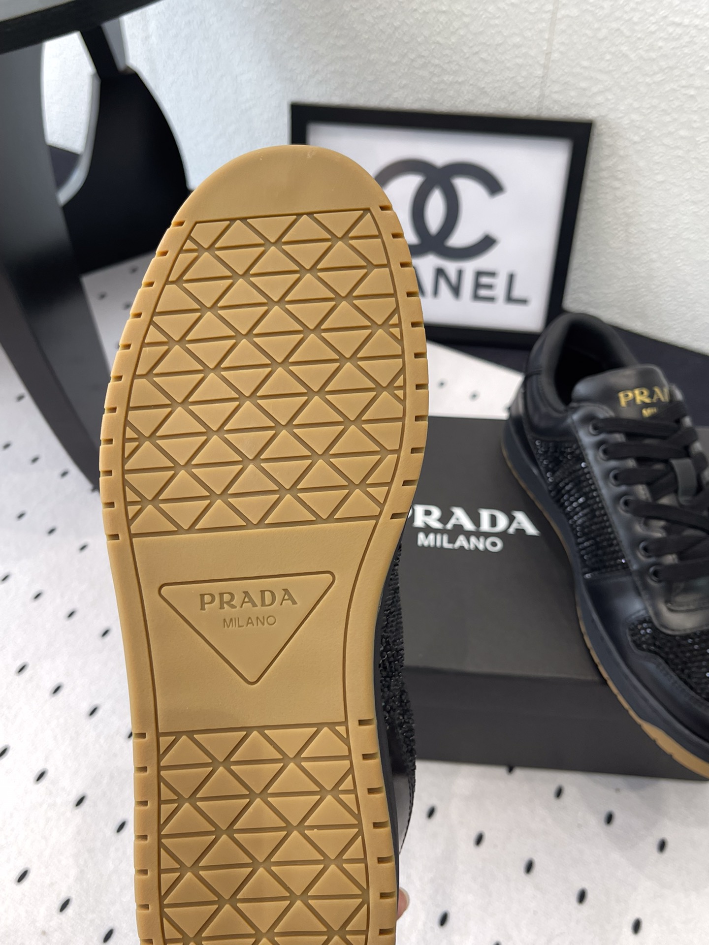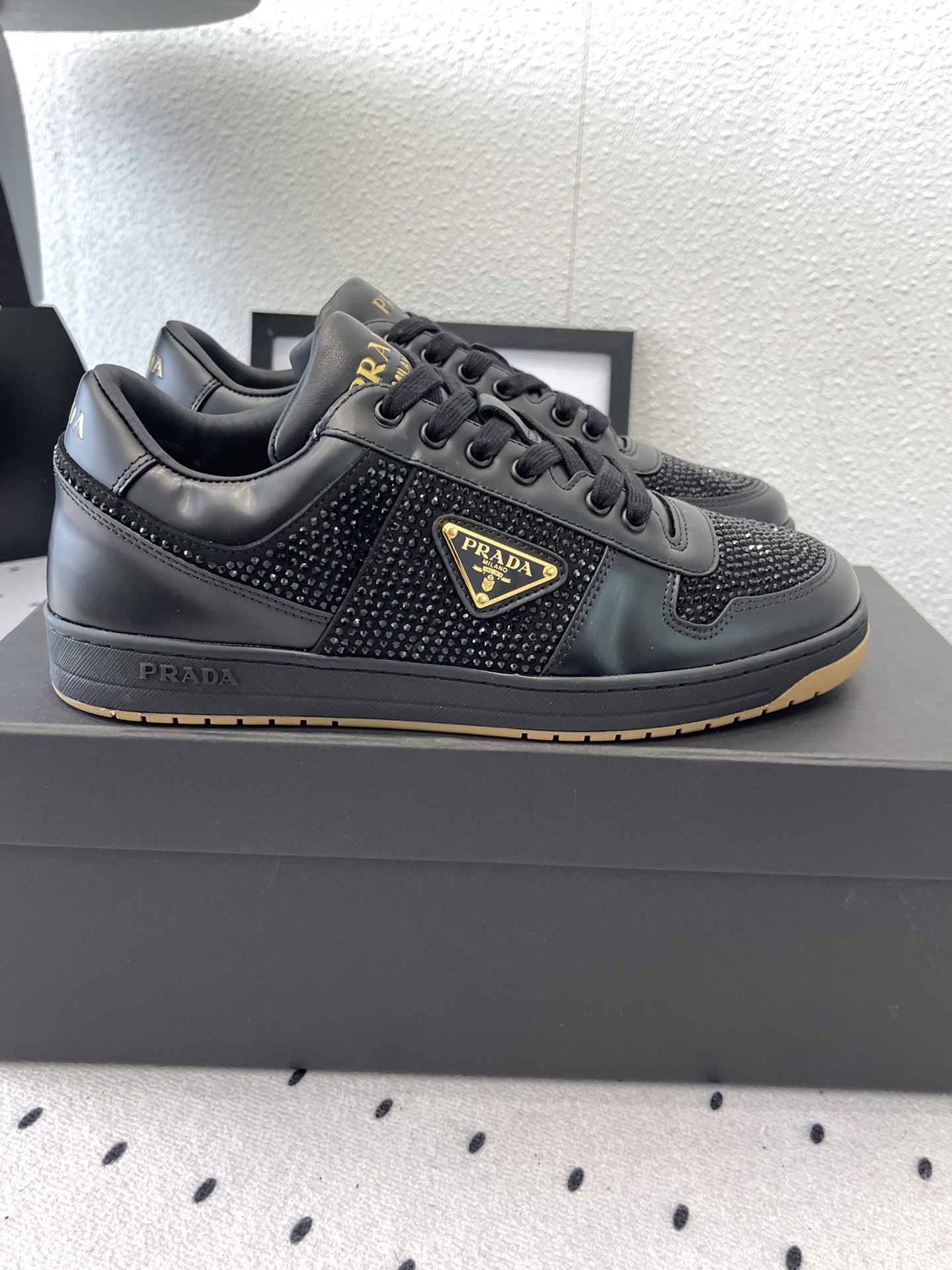 这款鞋子是AAAAA 1:1 质量 (非常棒). 使用了和原版一模一样的材料. 商标部分也保持了和普拉达/Prada一样. 图片拍摄是实物鞋子拍摄, 您所收到的实物保证和我们图片一模一样.