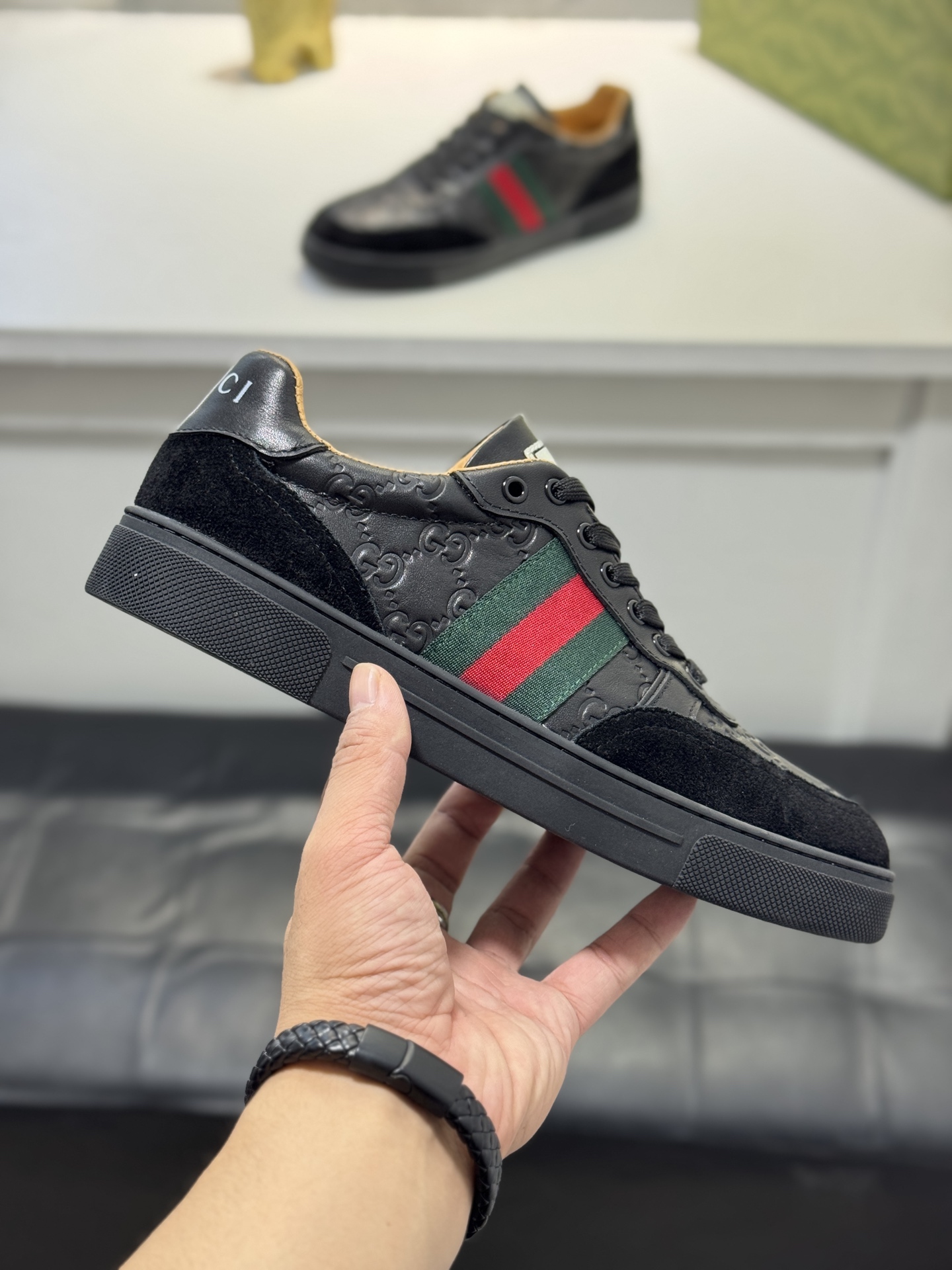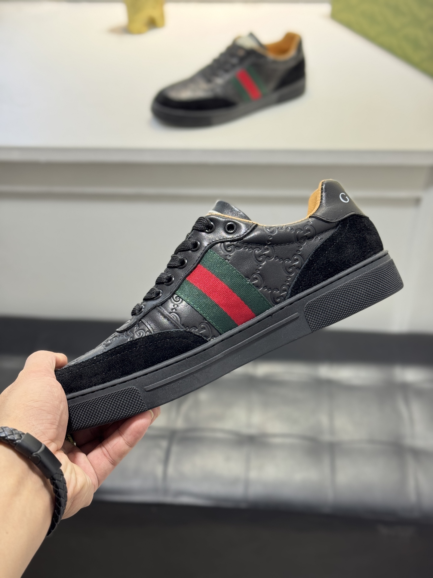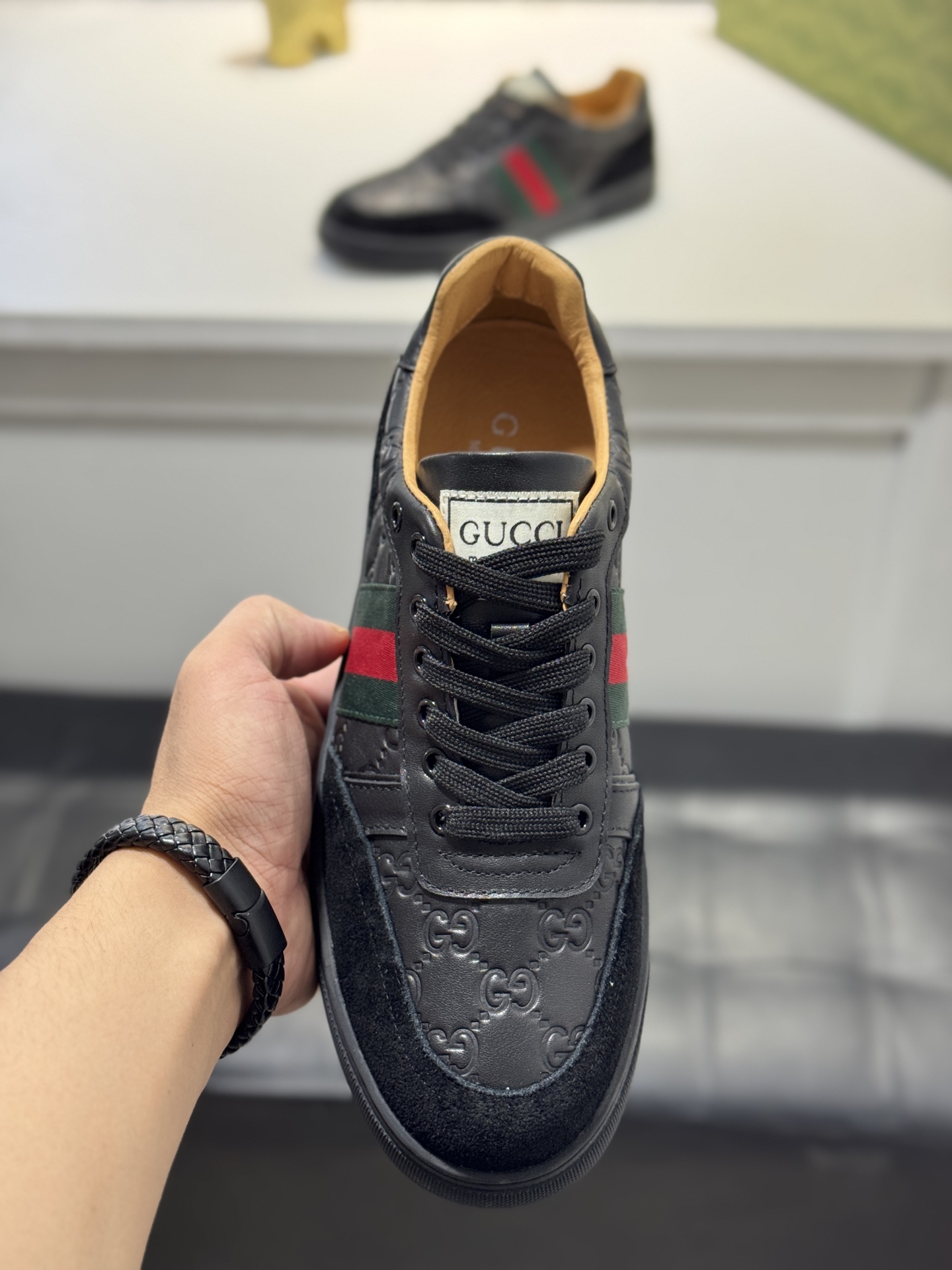 这款鞋子是AAAAA 1:1 质量 (非常棒). 使用了和原版一模一样的材料. 商标部分也保持了和古奇/Gucci一样. 图片拍摄是实物鞋子拍摄, 您所收到的实物保证和我们图片一模一样.