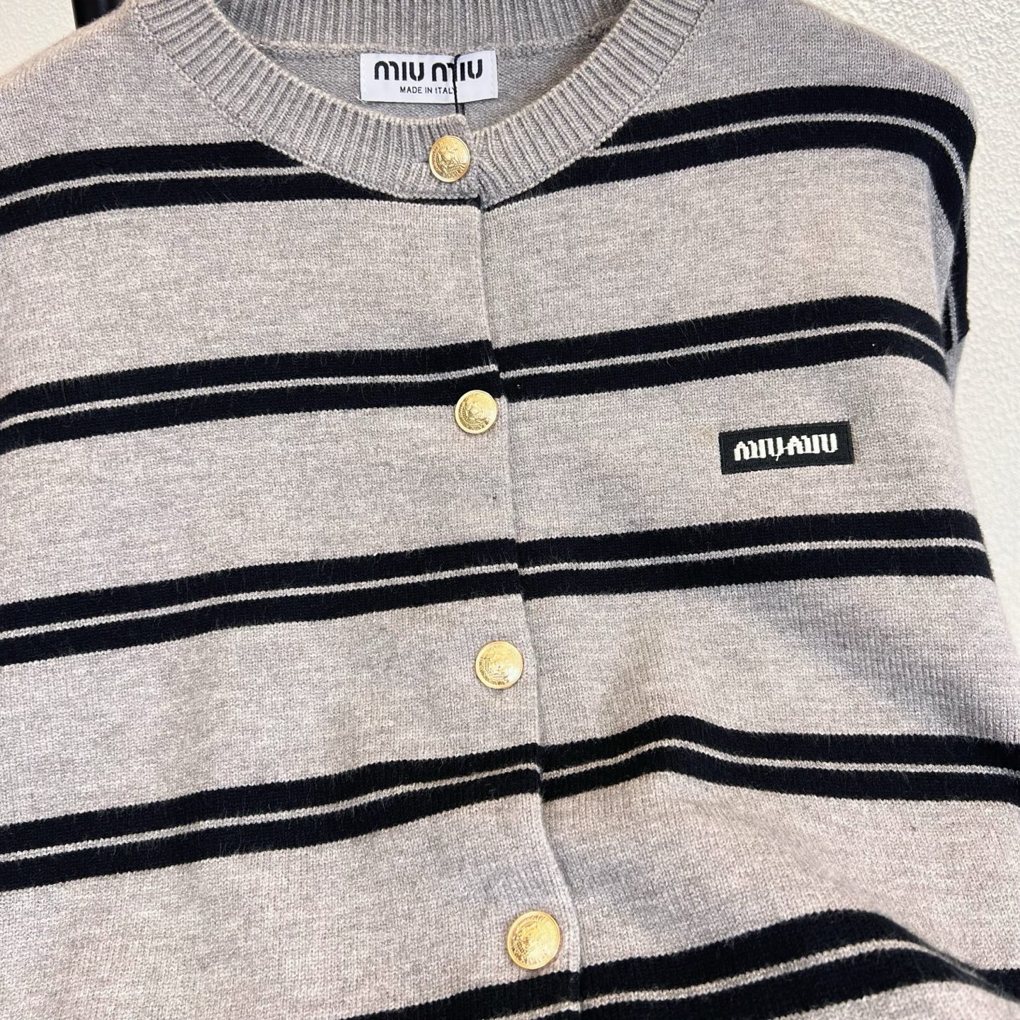这款衣服是AAAAA 1:1 质量 (非常棒). 使用了和原版一模一样的材料. 商标部分也保持了和缪缪/Miu Miu一样. 图片拍摄是实物衣服拍摄, 您所收到的实物保证和我们图片一模一样.