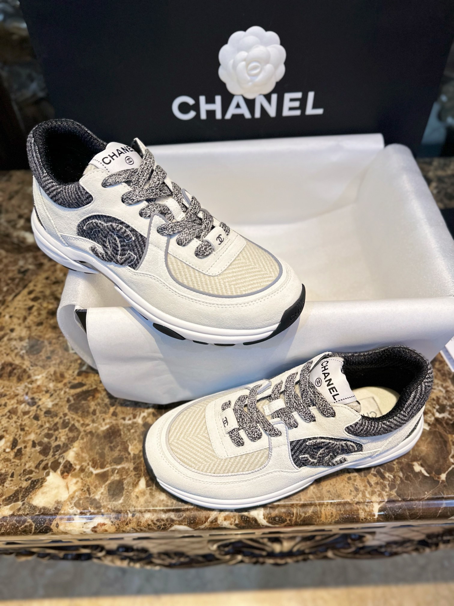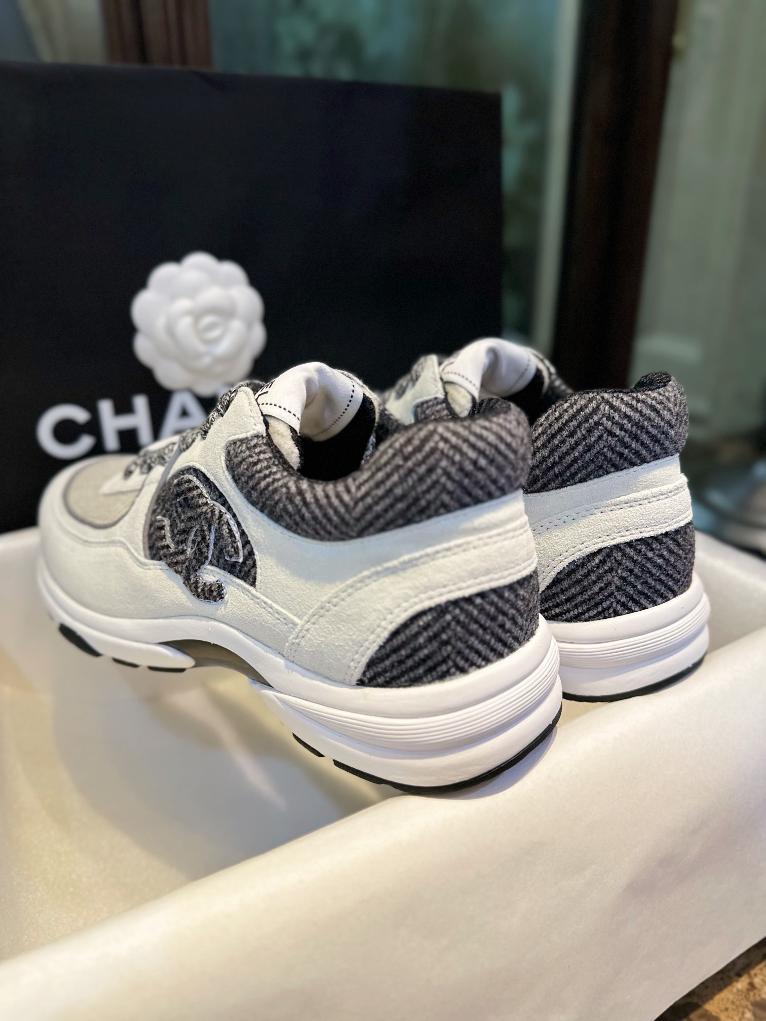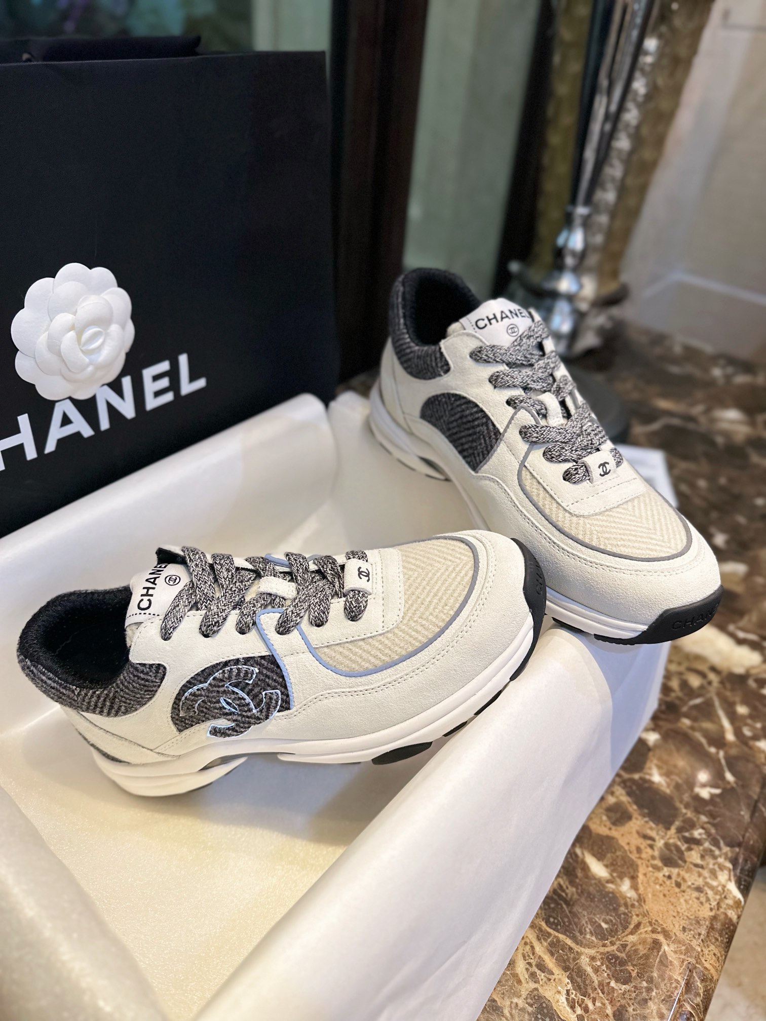 这款鞋子是AAAAA 1:1 质量 (非常棒). 使用了和原版一模一样的材料. 商标部分也保持了和香奈儿/Chanel一样. 图片拍摄是实物鞋子拍摄, 您所收到的实物保证和我们图片一模一样.