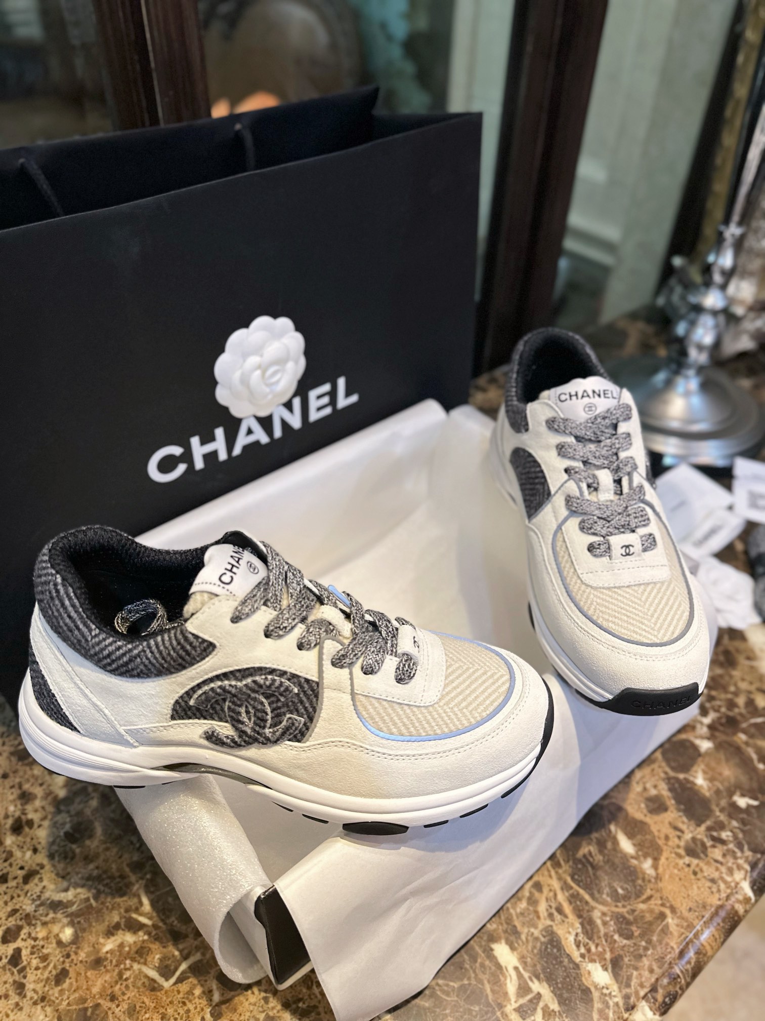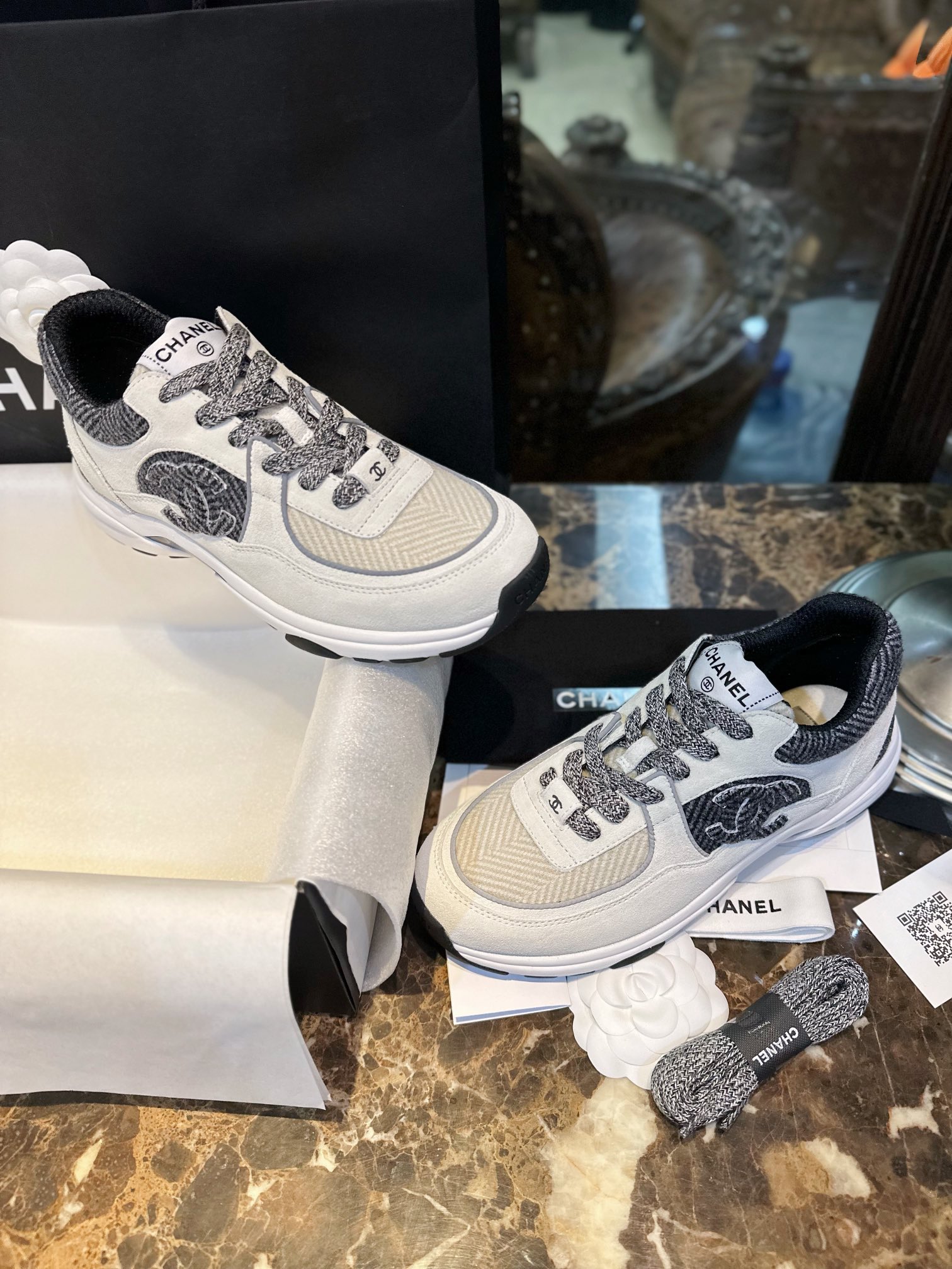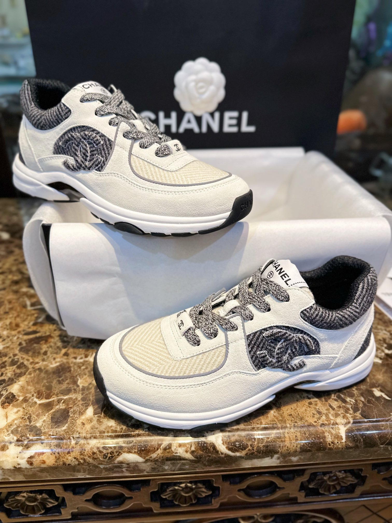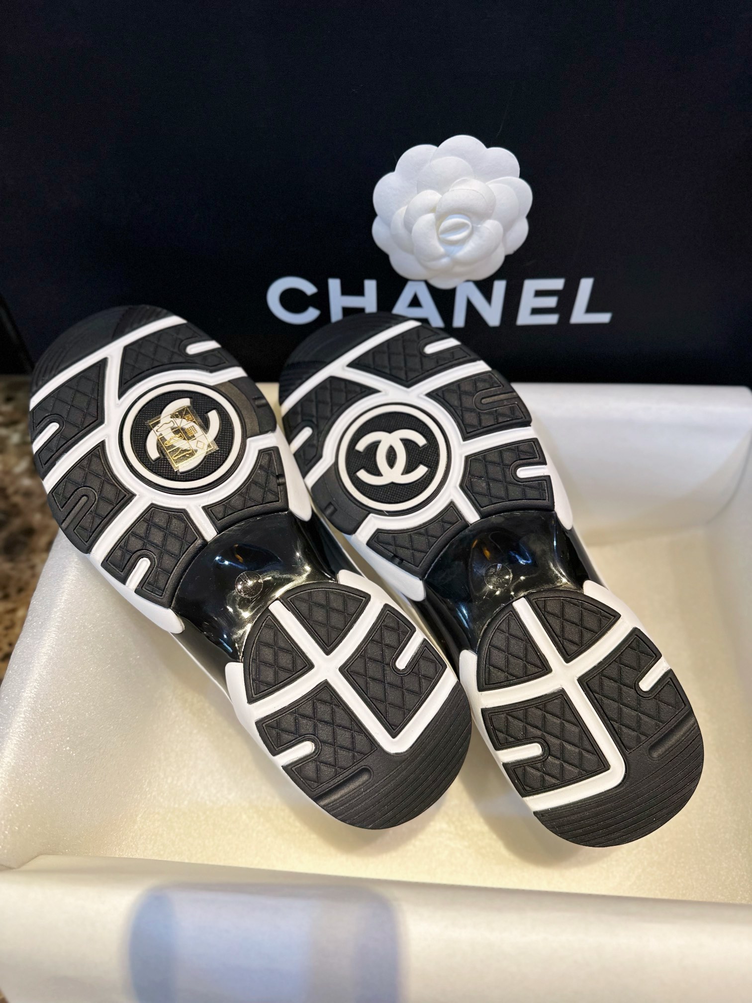 这款鞋子是AAAAA 1:1 质量 (非常棒). 使用了和原版一模一样的材料. 商标部分也保持了和香奈儿/Chanel一样. 图片拍摄是实物鞋子拍摄, 您所收到的实物保证和我们图片一模一样.