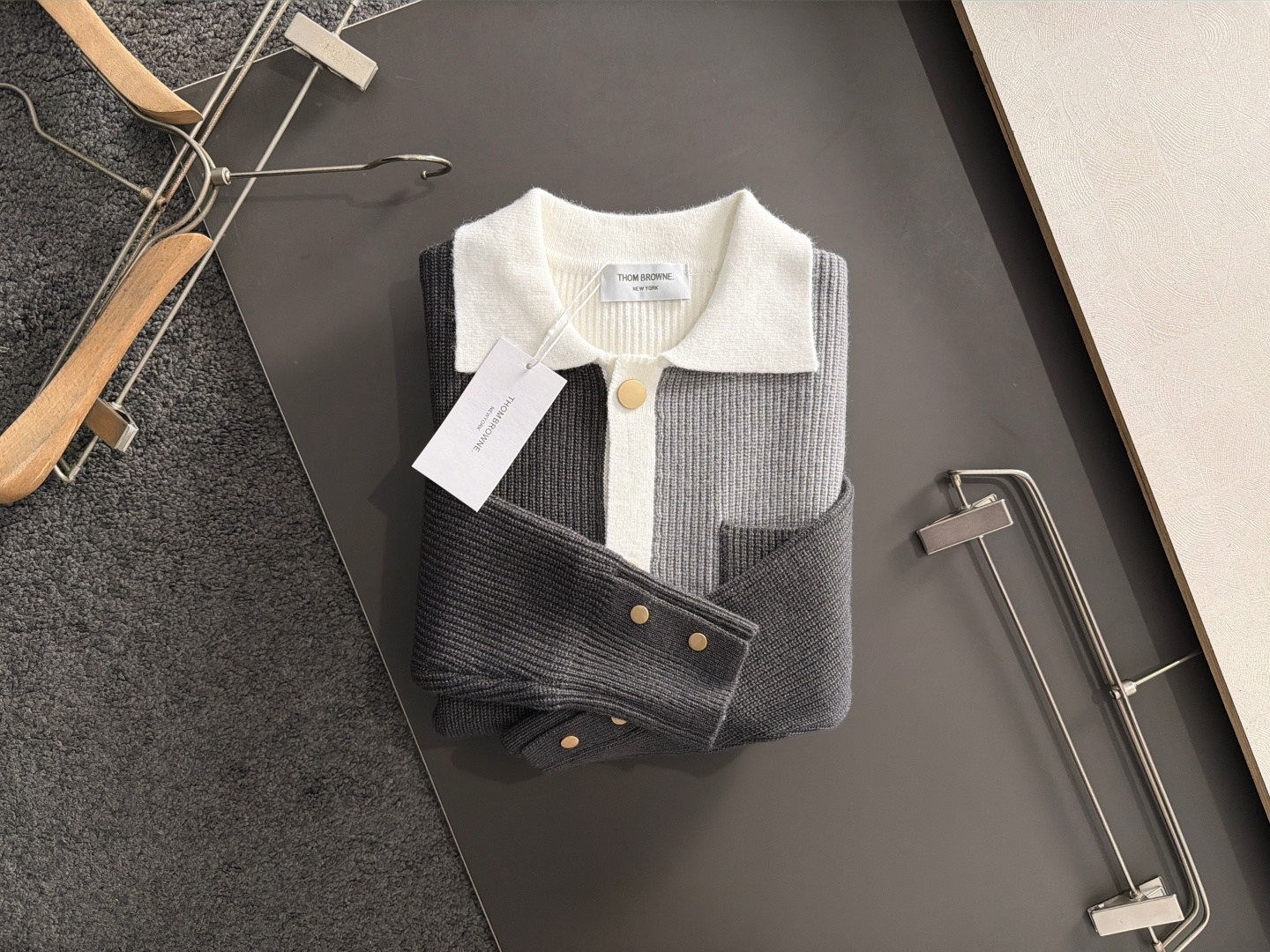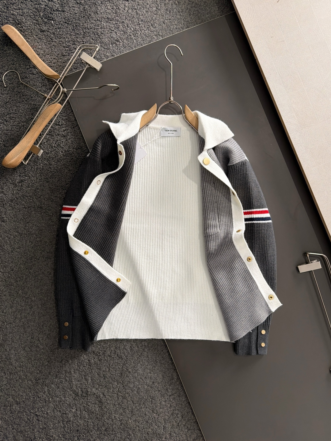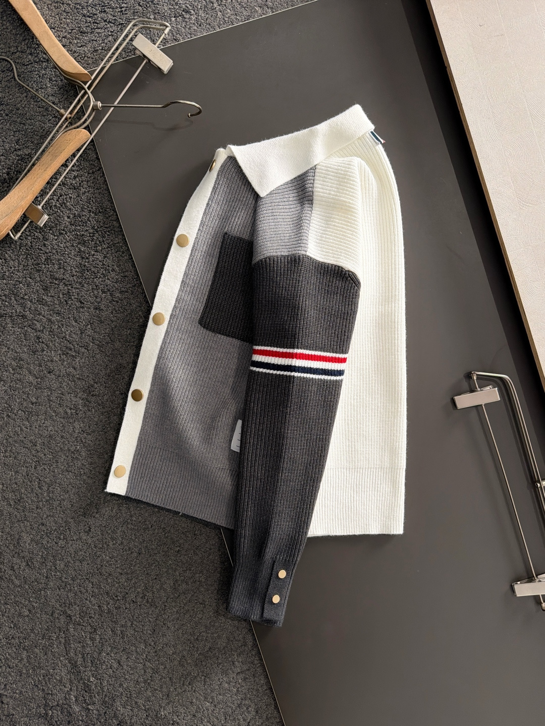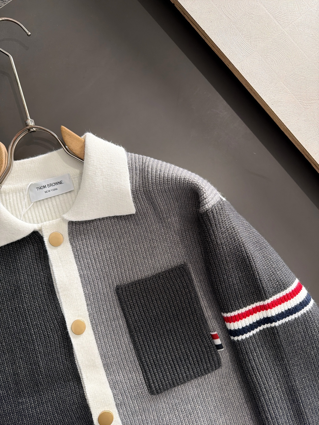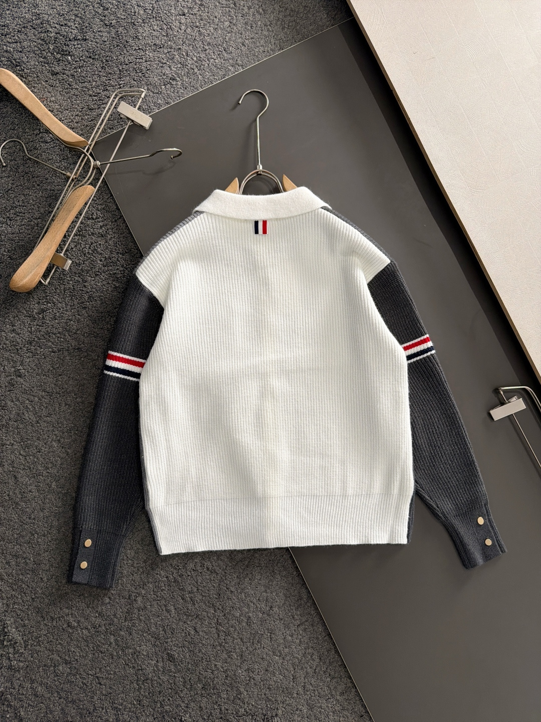 这款衣服是AAAAA 1:1 质量 (非常棒). 使用了和原版一模一样的材料. 商标部分也保持了和汤姆布朗/Thom Browne一样. 图片拍摄是实物衣服拍摄, 您所收到的实物保证和我们图片一模一样.