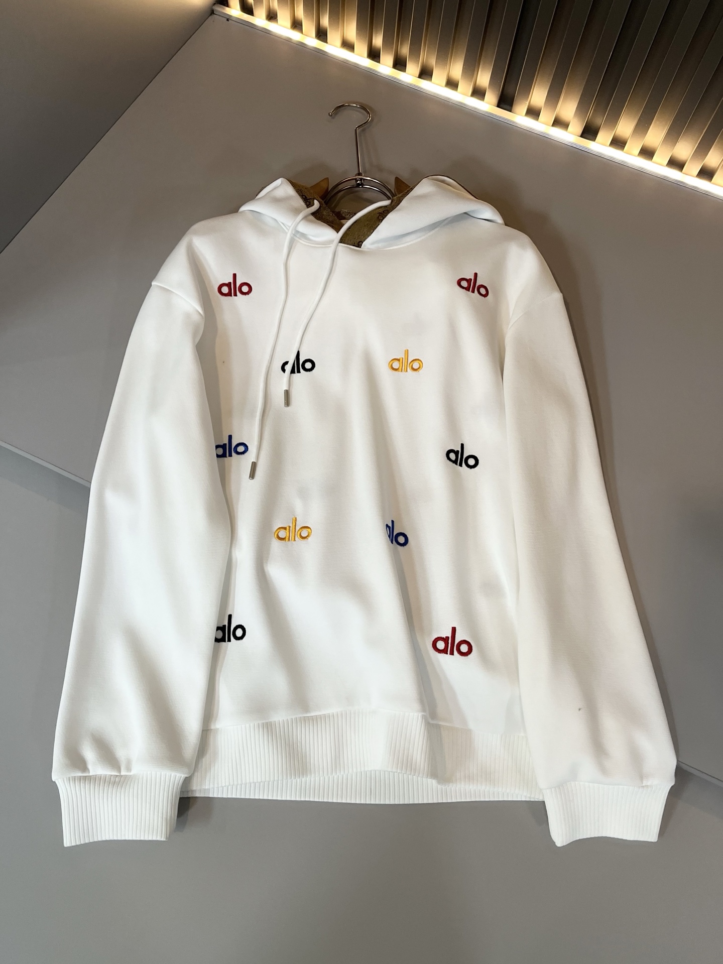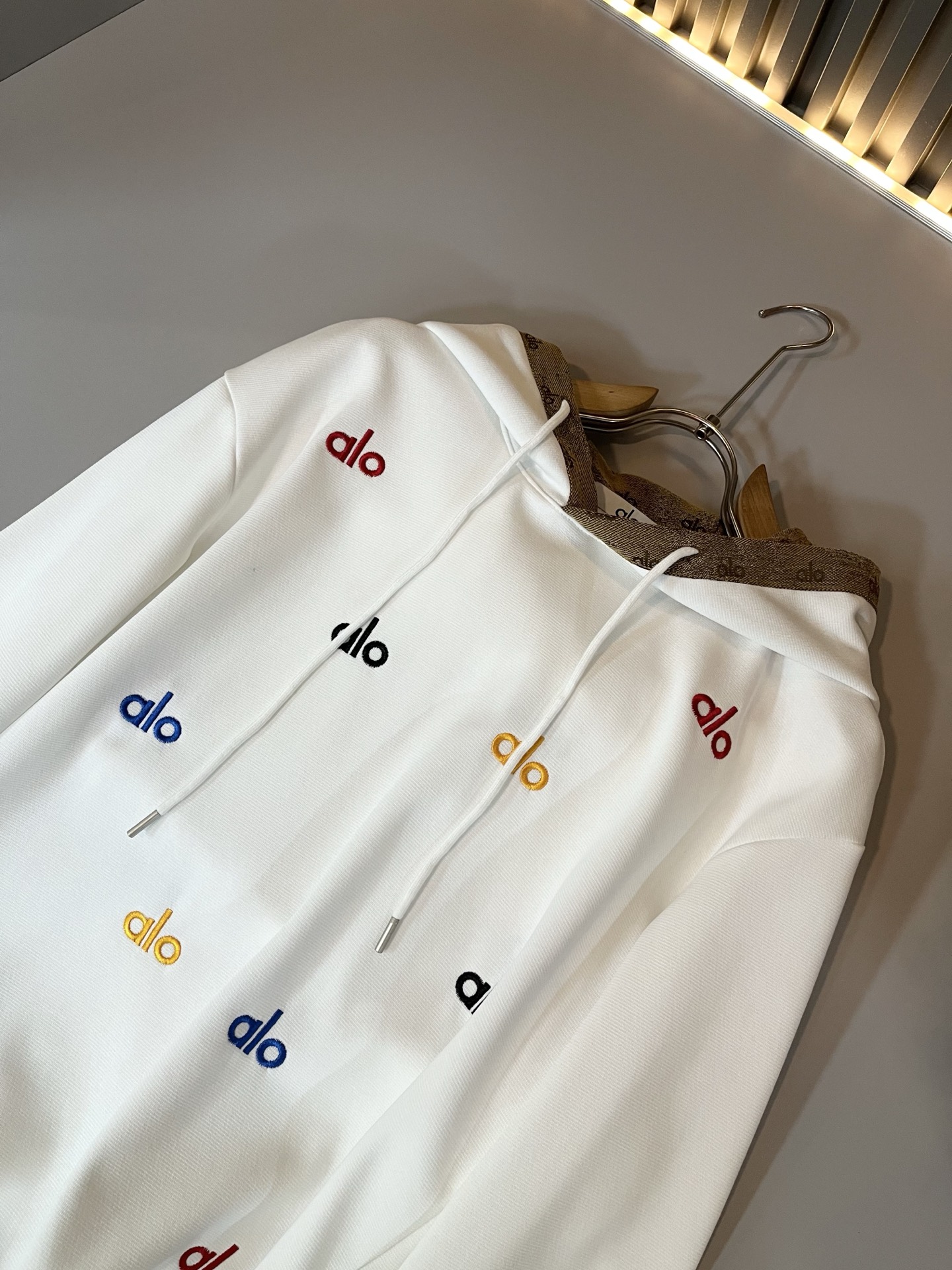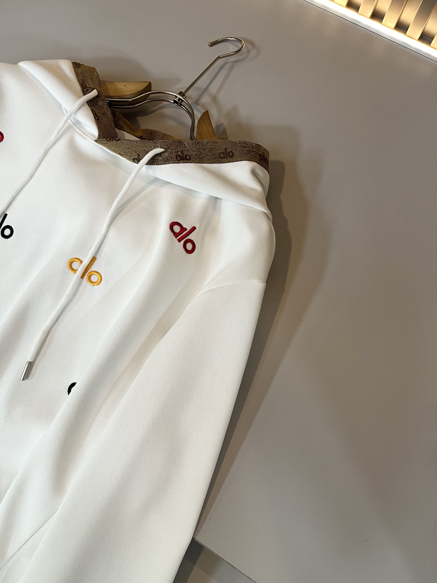 这款衣服是AAAAA 1:1 质量 (非常棒). 使用了和原版一模一样的材料. 商标部分也保持了和Alo Yoga一样. 图片拍摄是实物衣服拍摄, 您所收到的实物保证和我们图片一模一样.