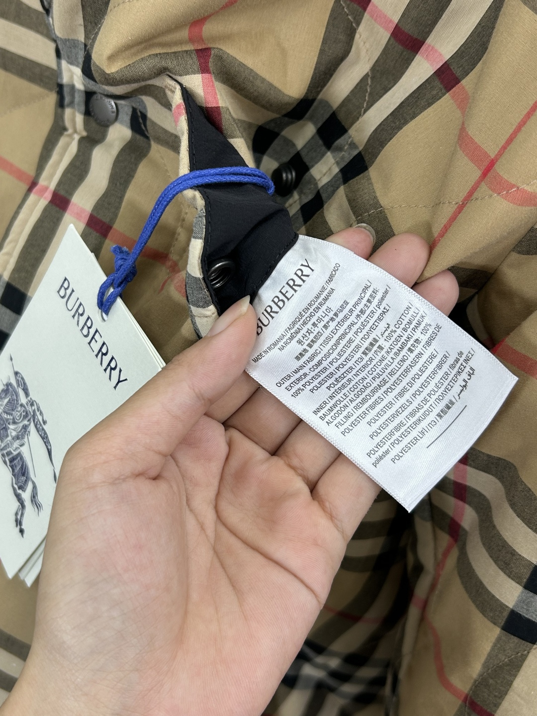 这款衣服是AAAAA 1:1 质量 (非常棒). 使用了和原版一模一样的材料. 商标部分也保持了和巴宝莉/Burberry一样. 图片拍摄是实物衣服拍摄, 您所收到的实物保证和我们图片一模一样.