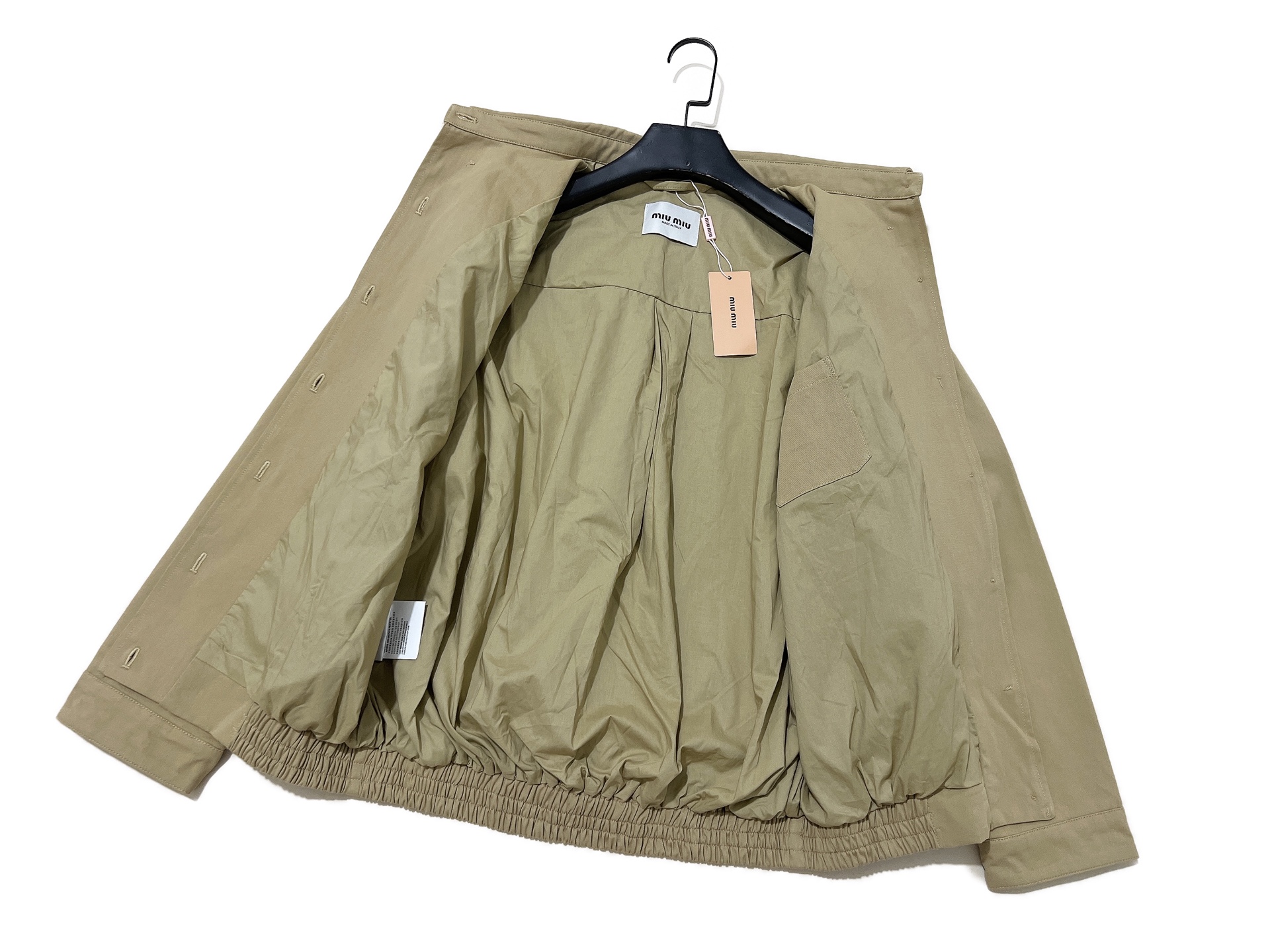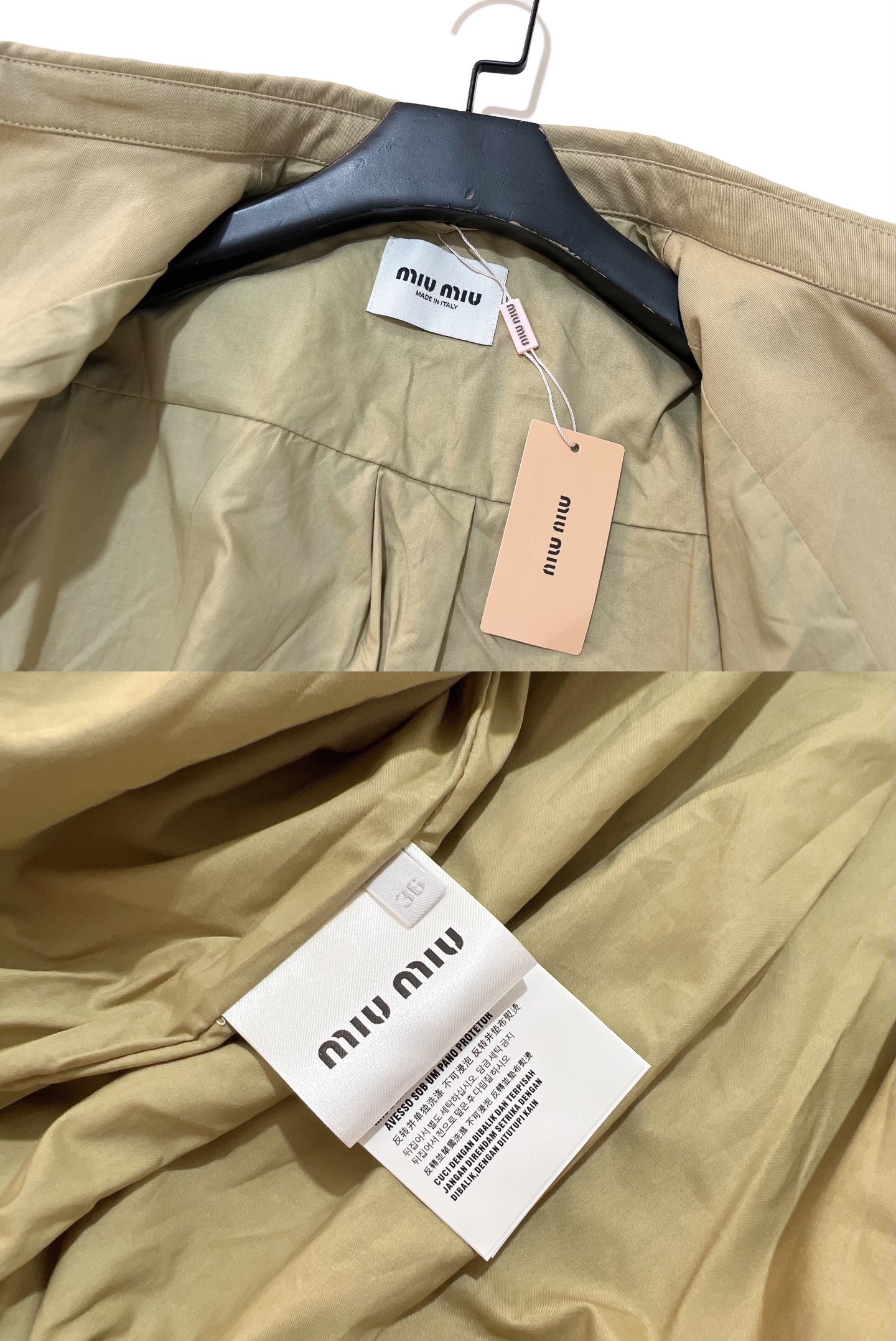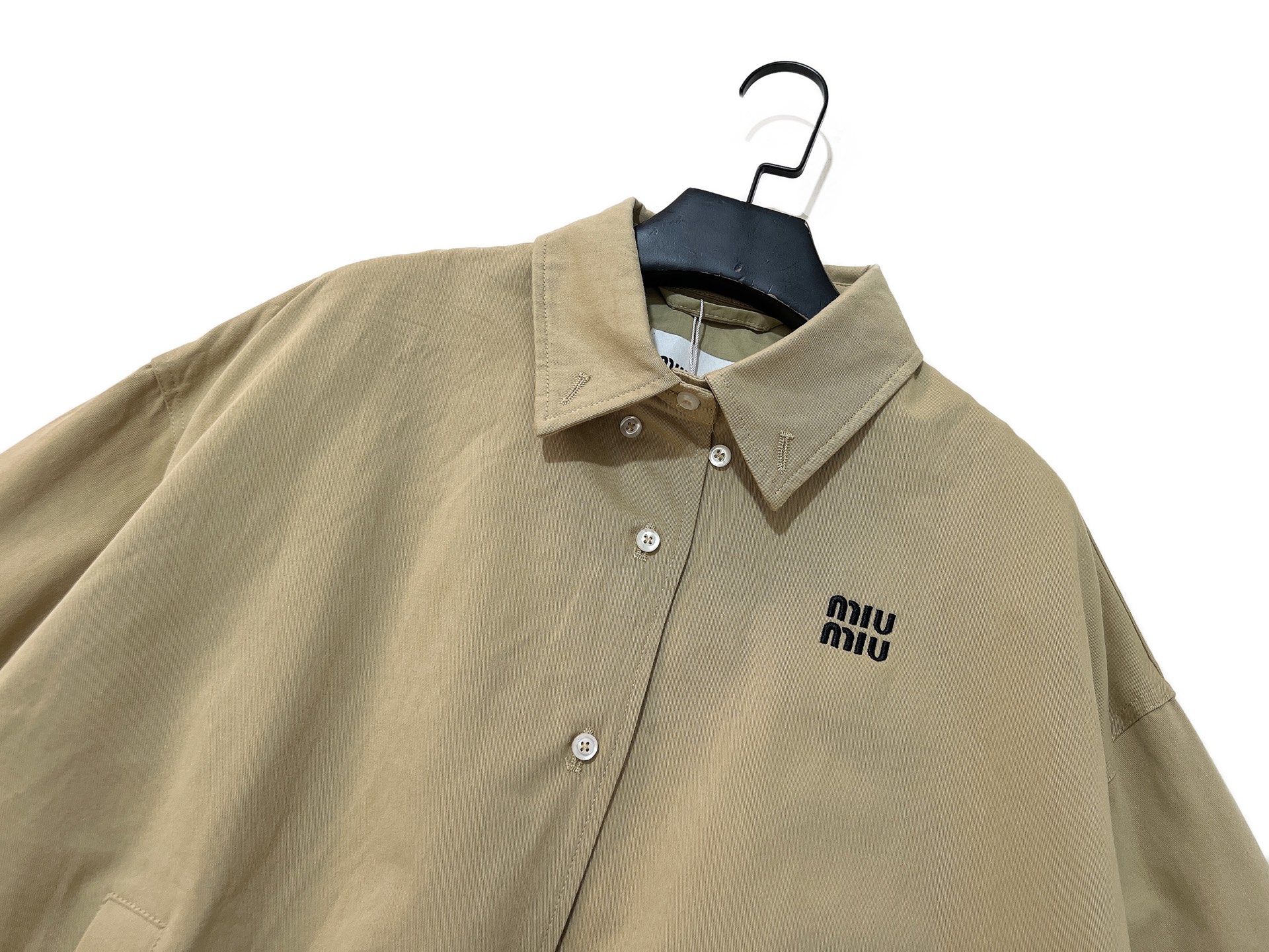 这款衣服是AAAAA 1:1 质量 (非常棒). 使用了和原版一模一样的材料. 商标部分也保持了和缪缪/Miu Miu一样. 图片拍摄是实物衣服拍摄, 您所收到的实物保证和我们图片一模一样.