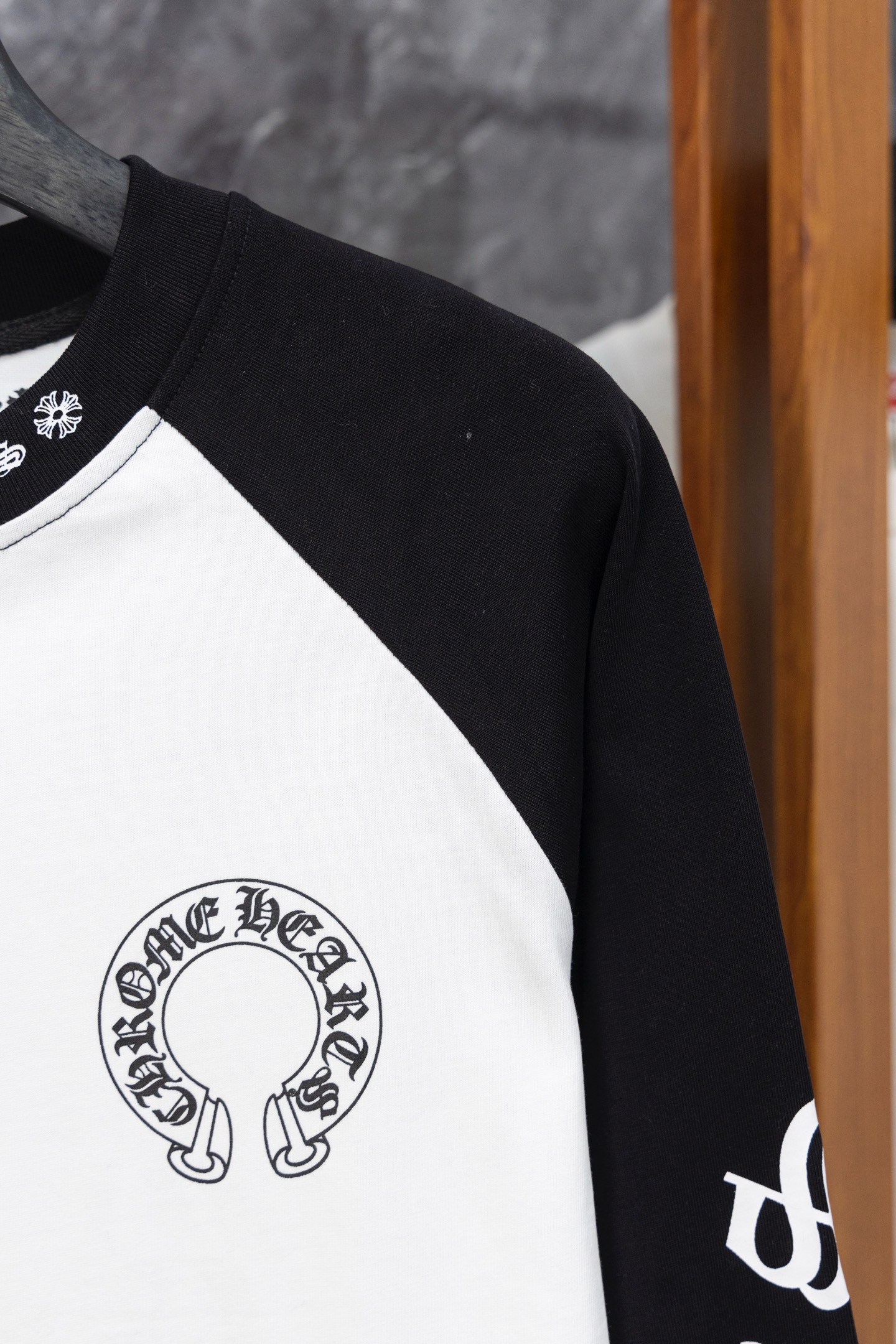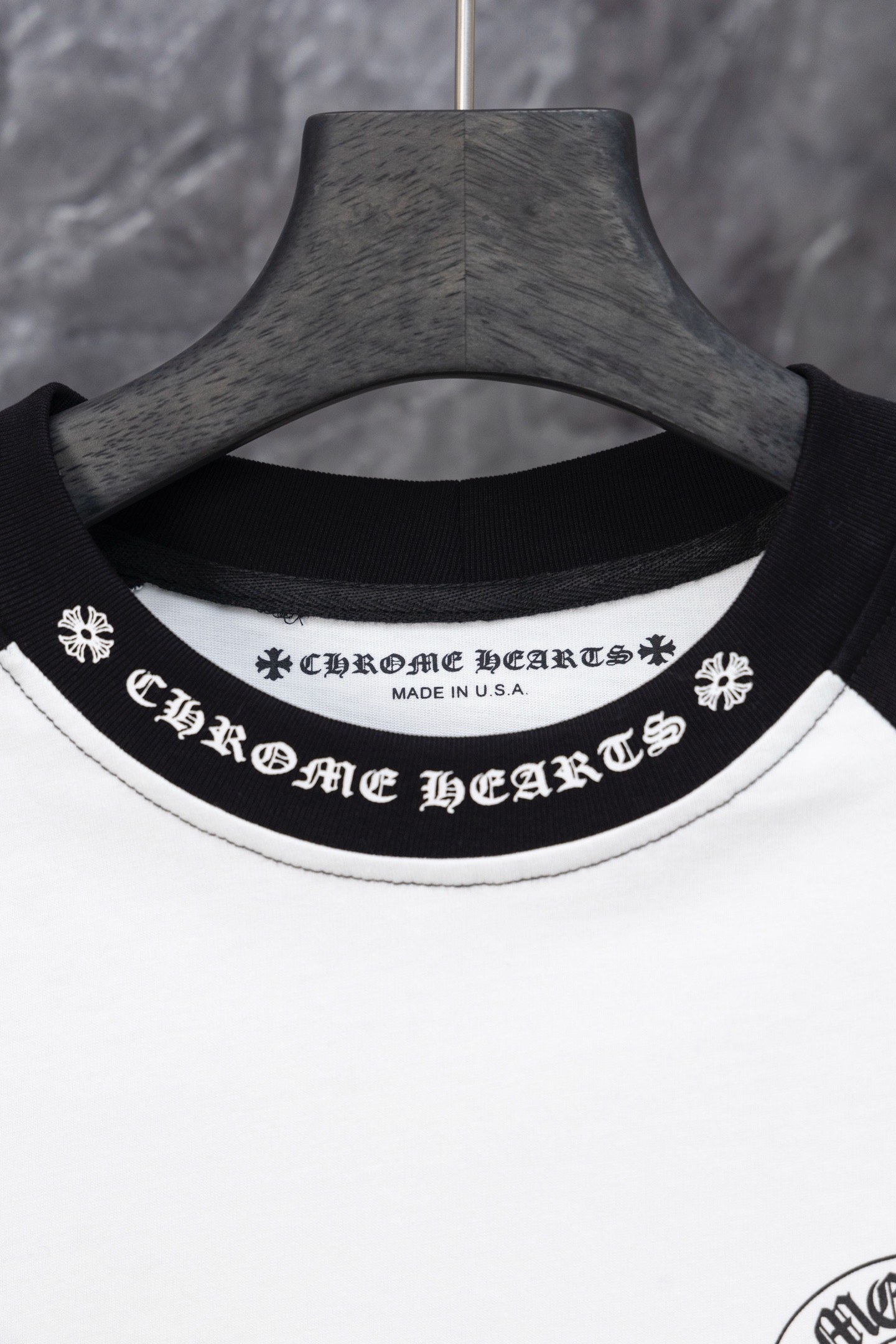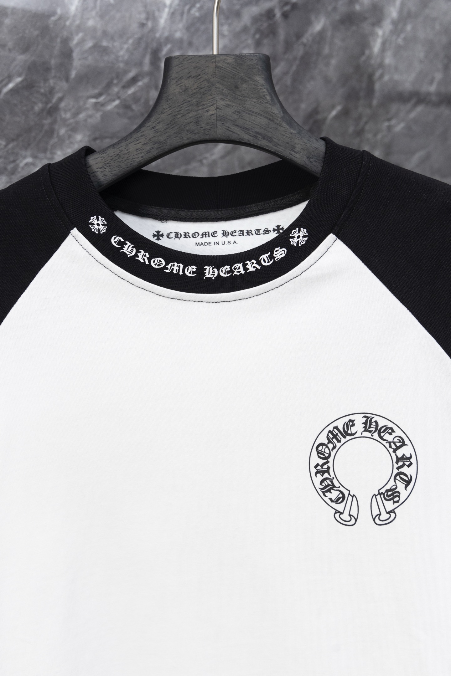 这款衣服是AAAAA 1:1 质量 (非常棒). 使用了和原版一模一样的材料. 商标部分也保持了和克罗心/Chrome Hearts一样. 图片拍摄是实物衣服拍摄, 您所收到的实物保证和我们图片一模一样.