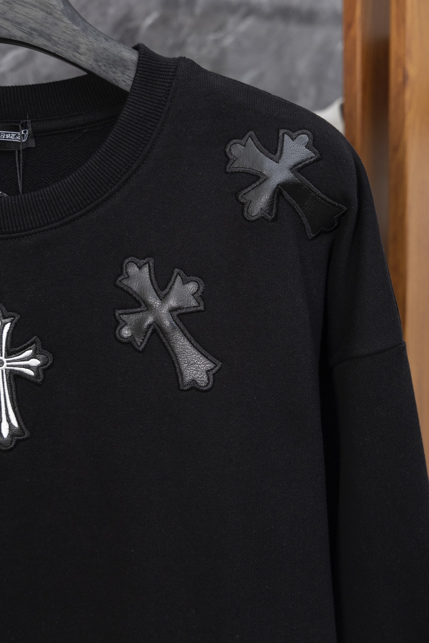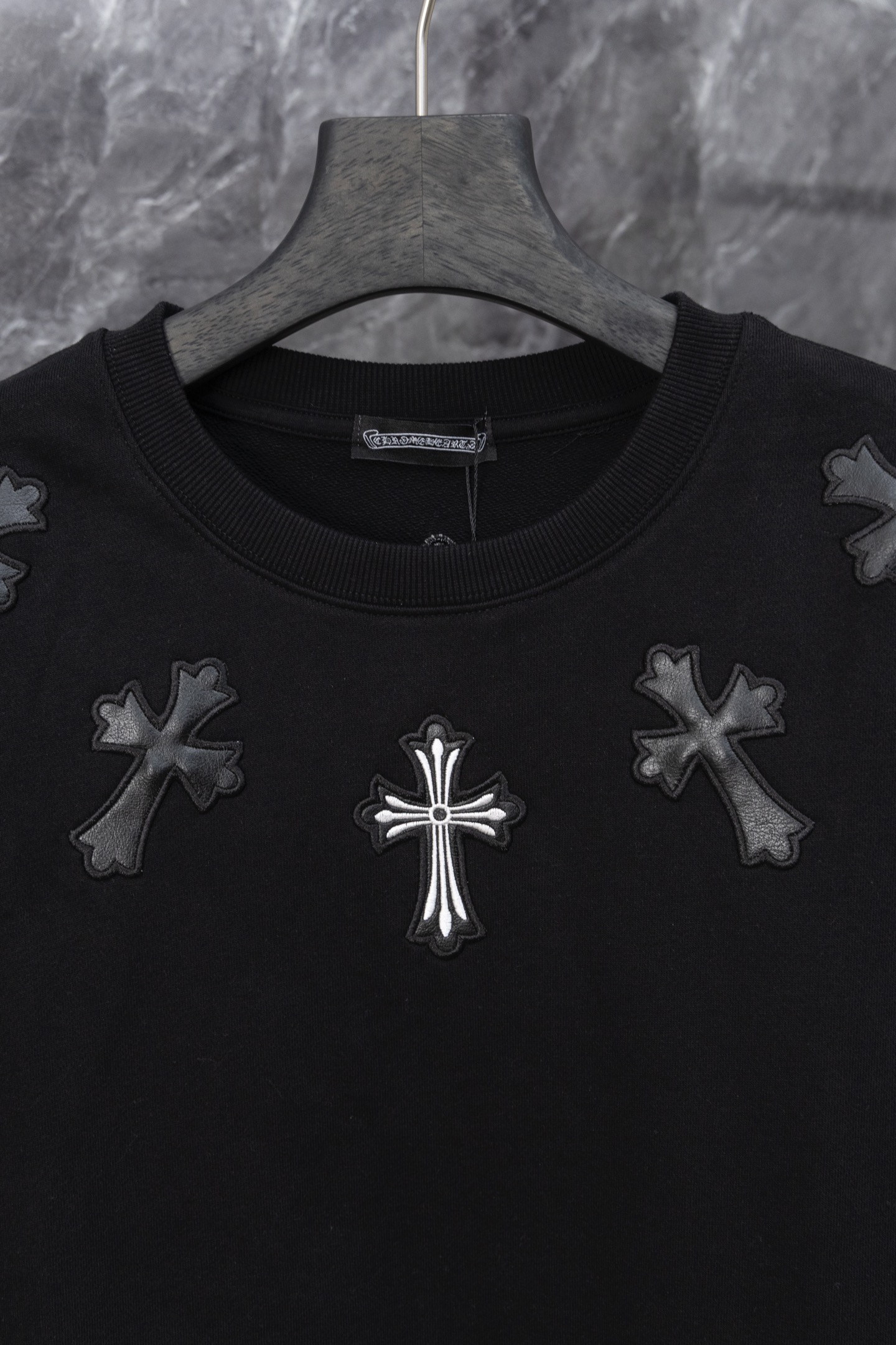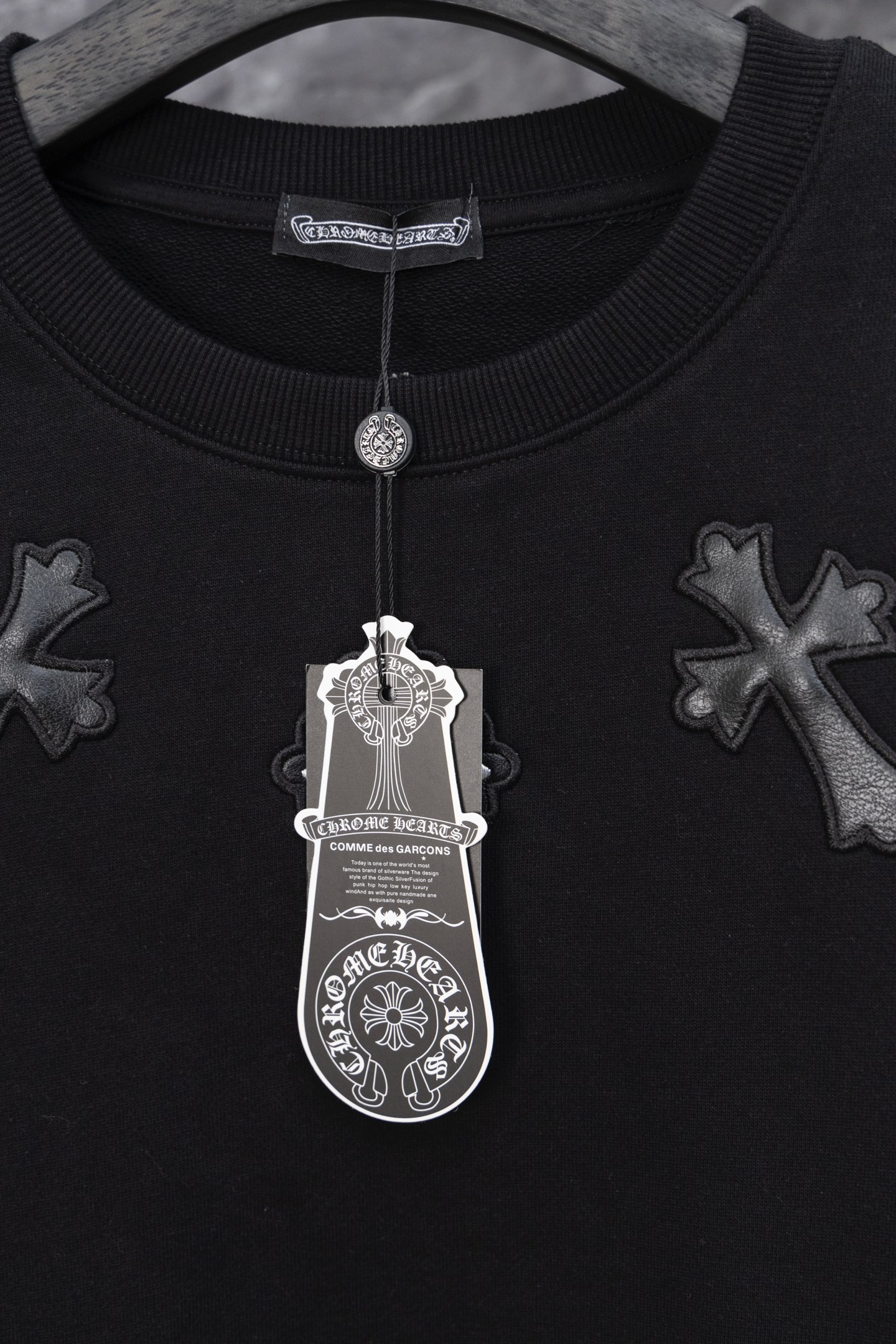 这款衣服是AAAAA 1:1 质量 (非常棒). 使用了和原版一模一样的材料. 商标部分也保持了和克罗心/Chrome Hearts一样. 图片拍摄是实物衣服拍摄, 您所收到的实物保证和我们图片一模一样.
