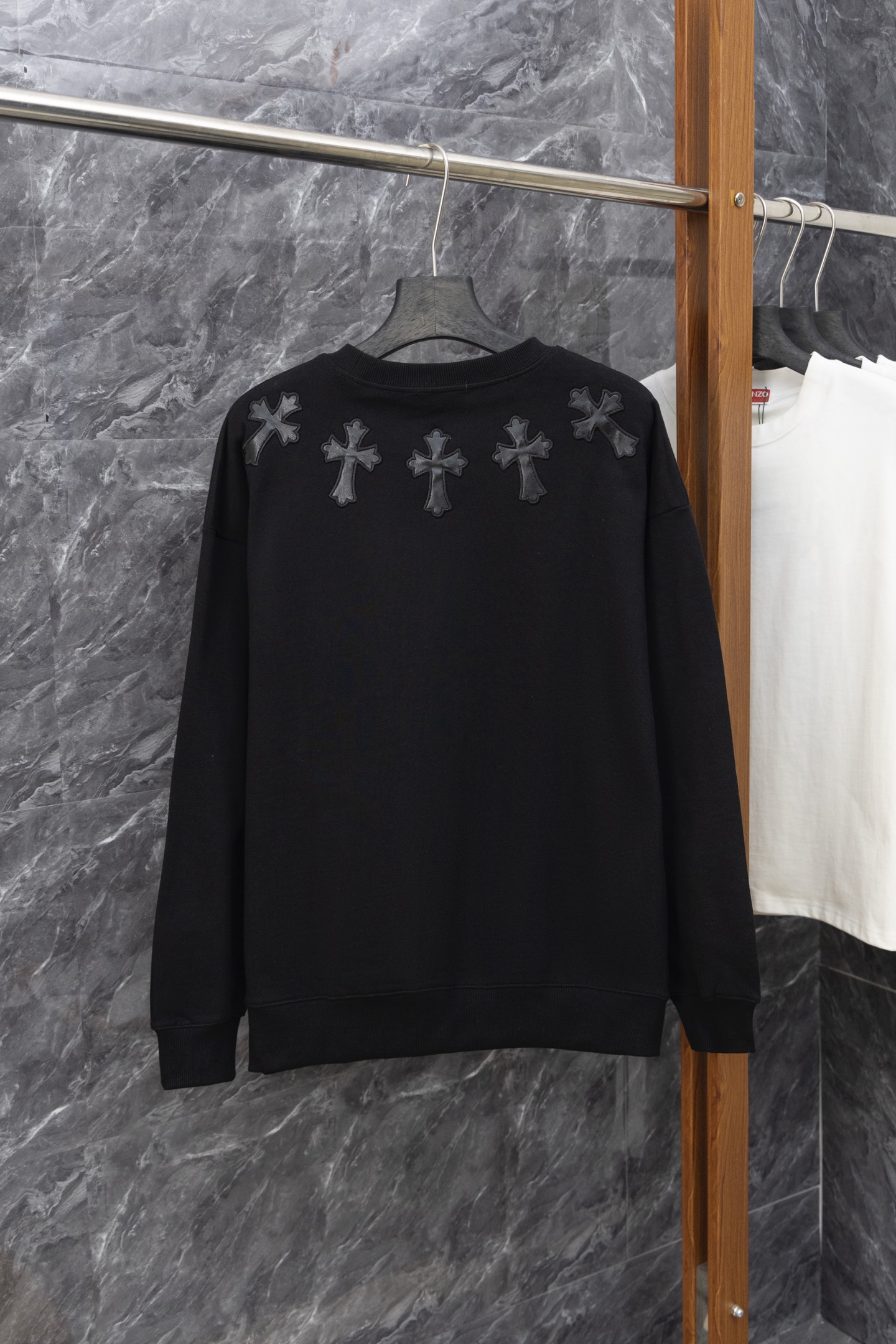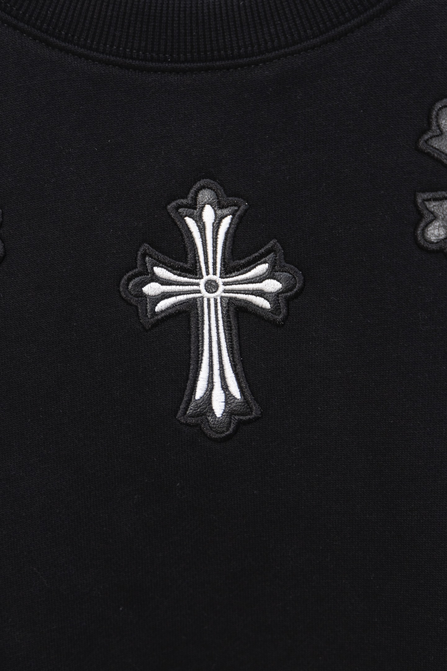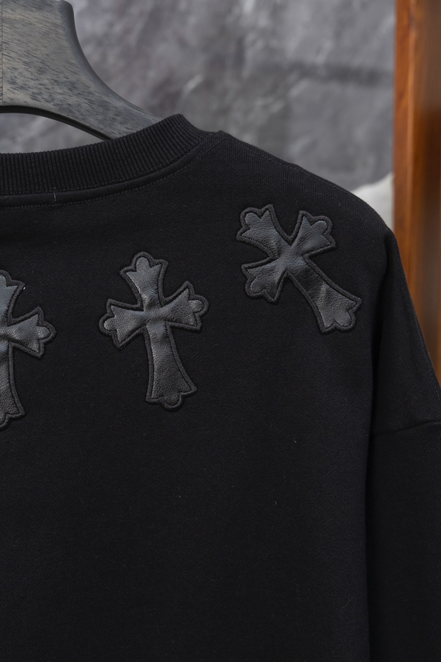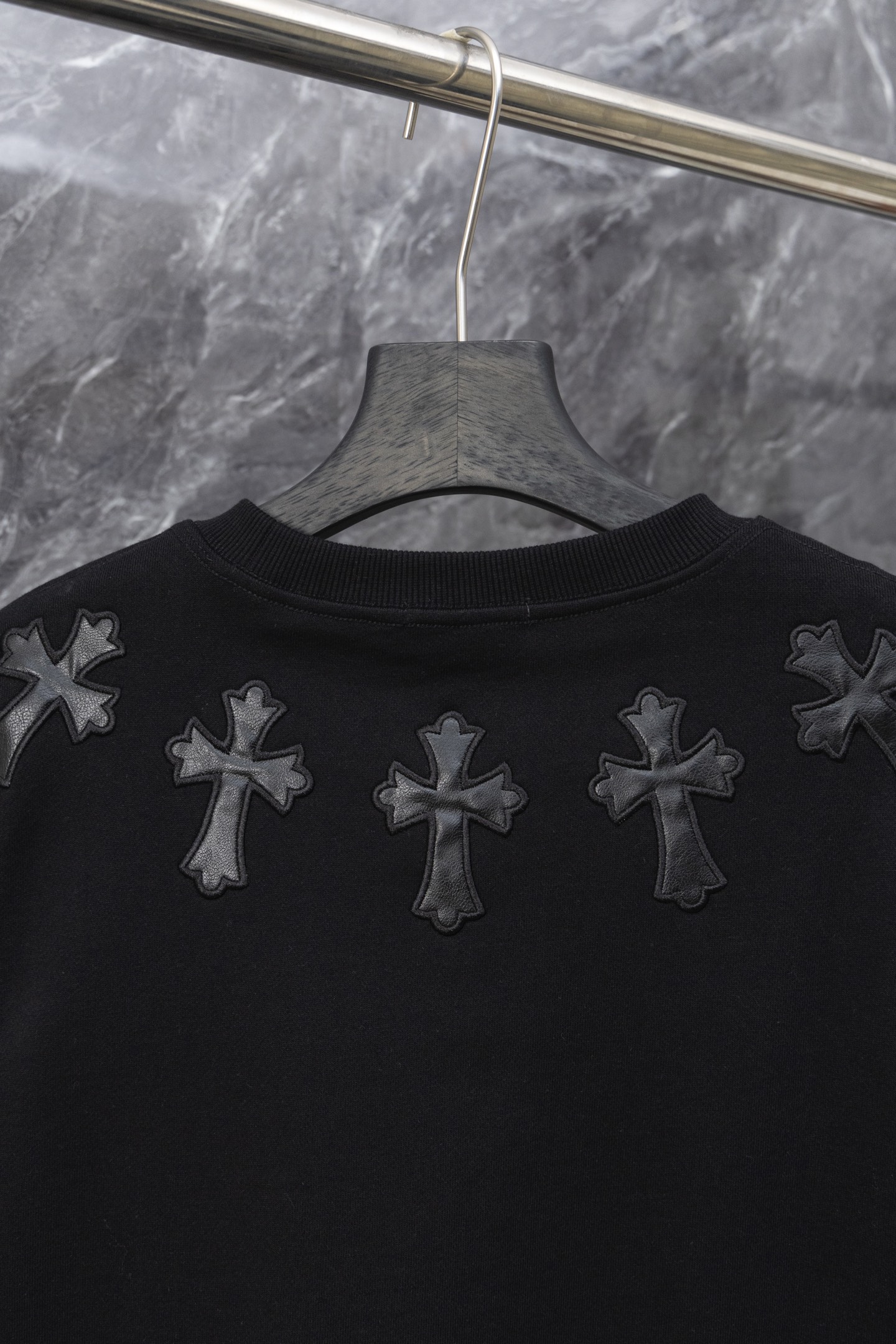 这款衣服是AAAAA 1:1 质量 (非常棒). 使用了和原版一模一样的材料. 商标部分也保持了和克罗心/Chrome Hearts一样. 图片拍摄是实物衣服拍摄, 您所收到的实物保证和我们图片一模一样.