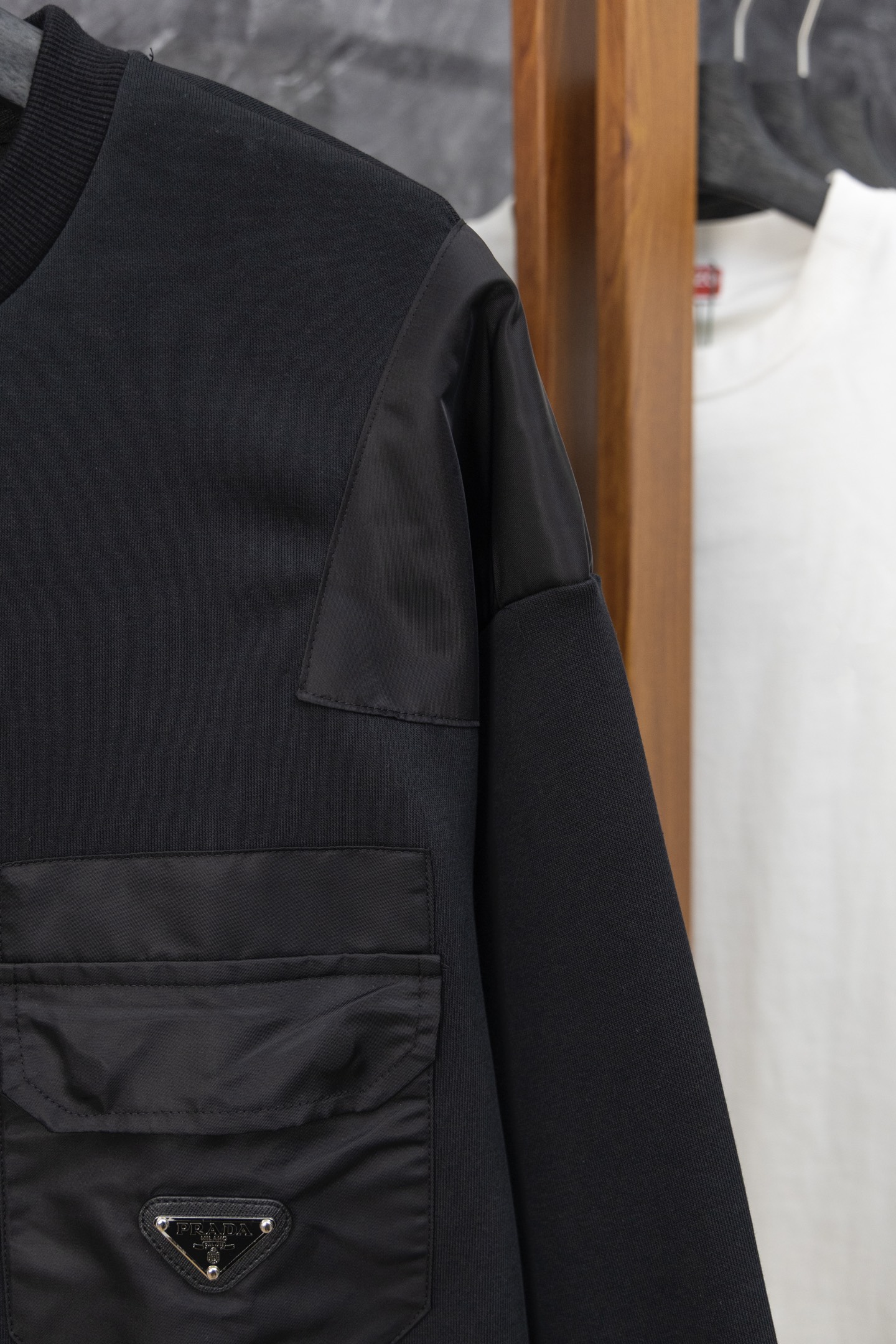 这款衣服是AAAAA 1:1 质量 (非常棒). 使用了和原版一模一样的材料. 商标部分也保持了和普拉达/Prada一样. 图片拍摄是实物衣服拍摄, 您所收到的实物保证和我们图片一模一样.