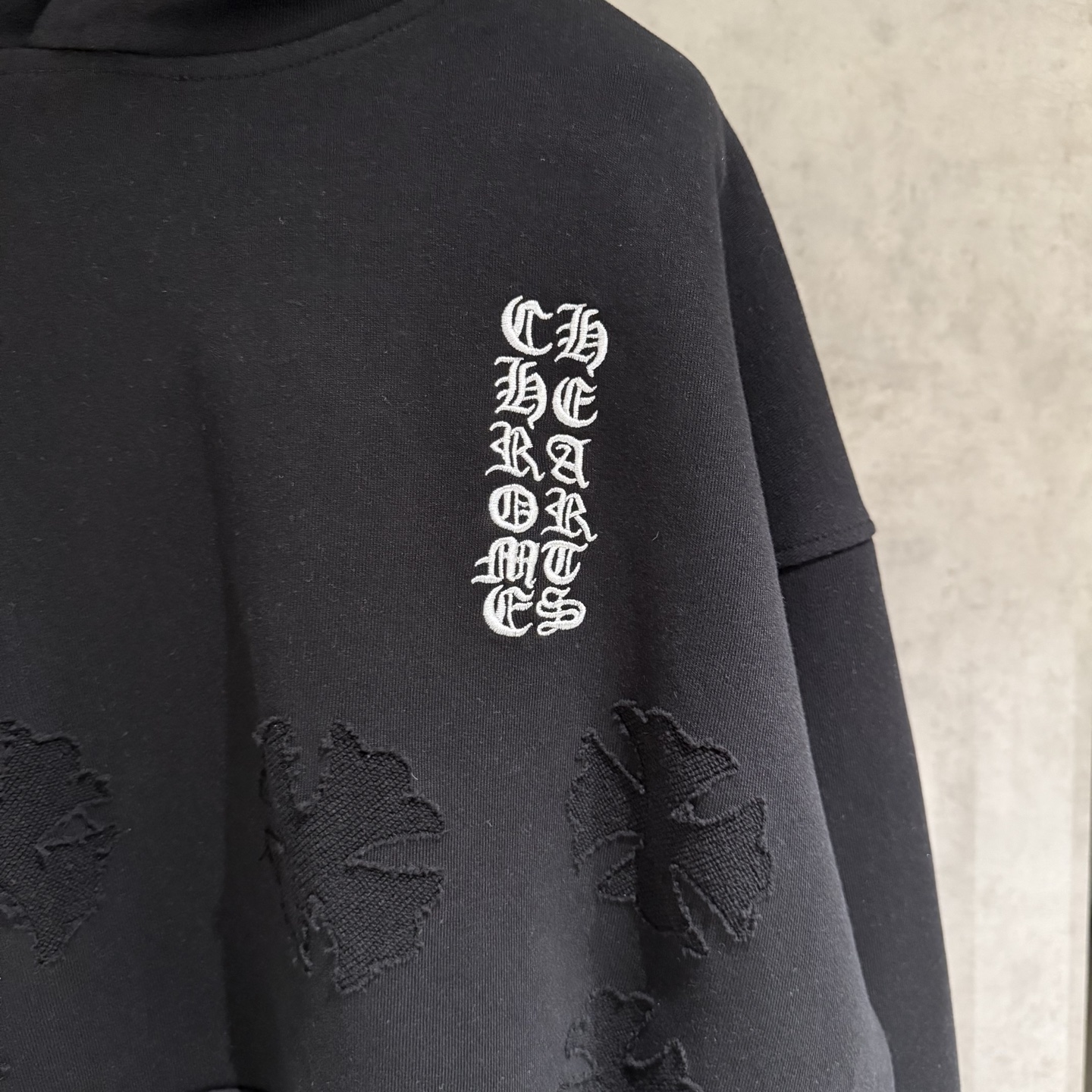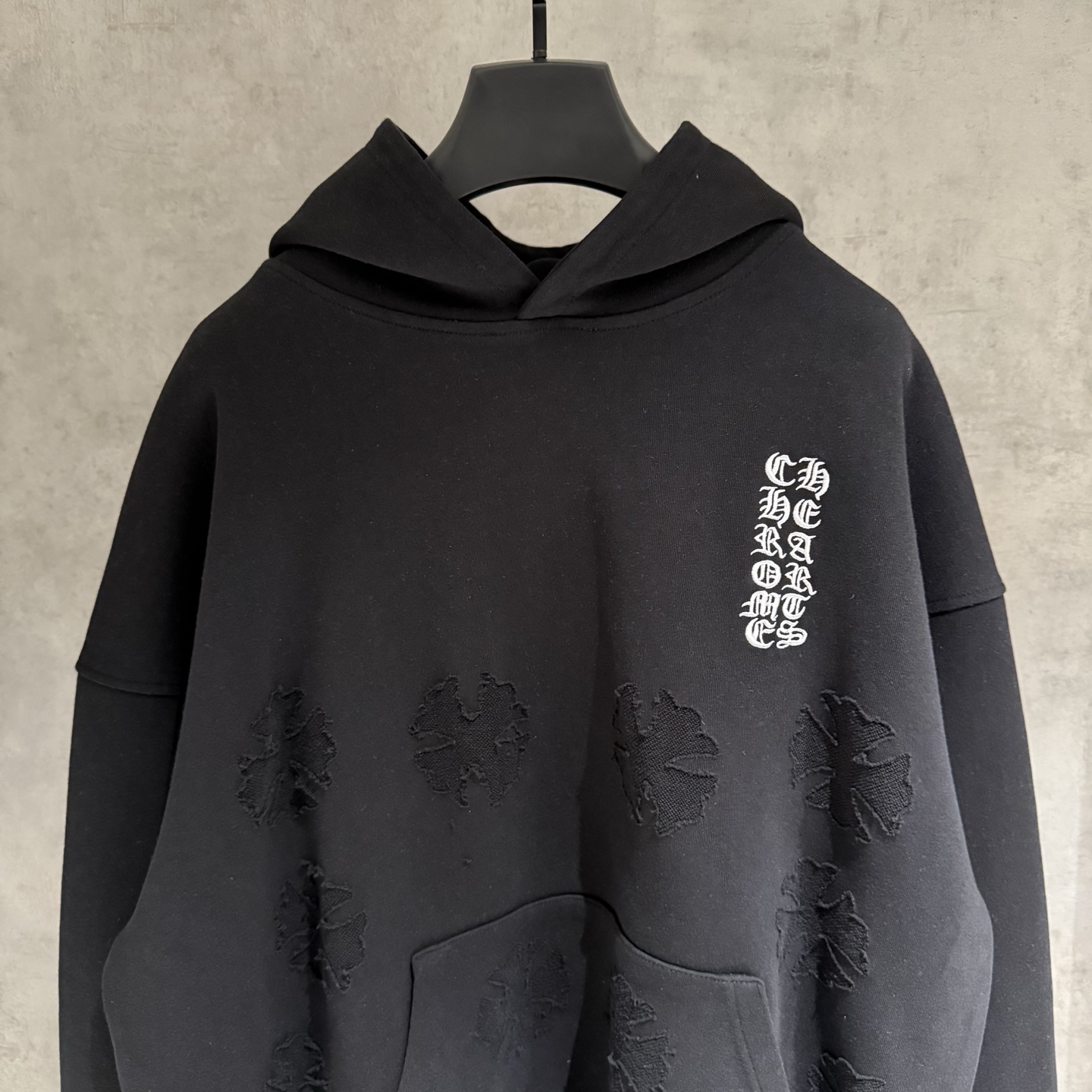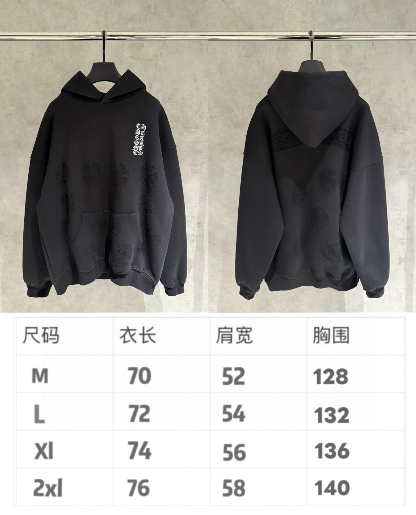 这款衣服是AAAAA 1:1 质量 (非常棒). 使用了和原版一模一样的材料. 商标部分也保持了和克罗心/Chrome Hearts一样. 图片拍摄是实物衣服拍摄, 您所收到的实物保证和我们图片一模一样.