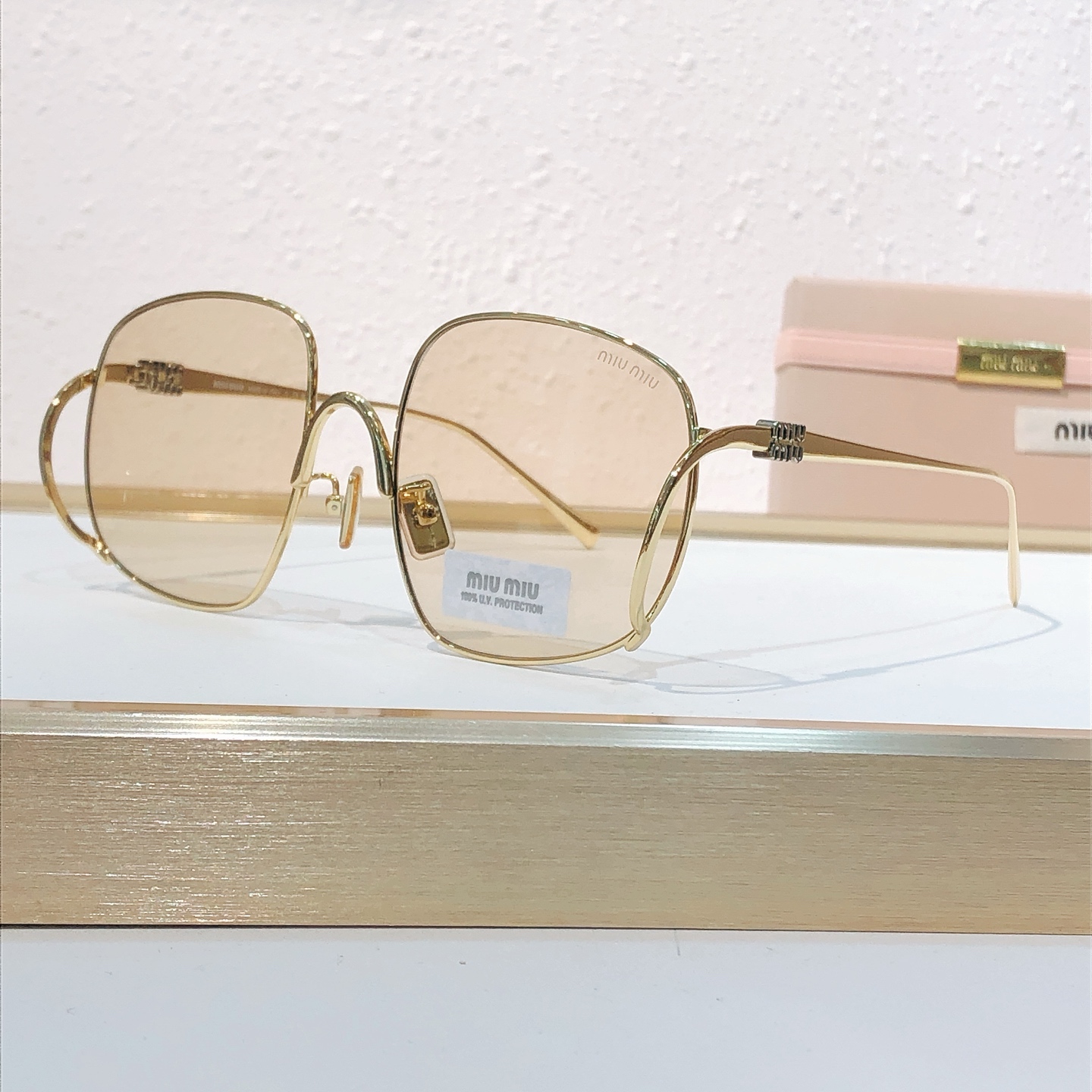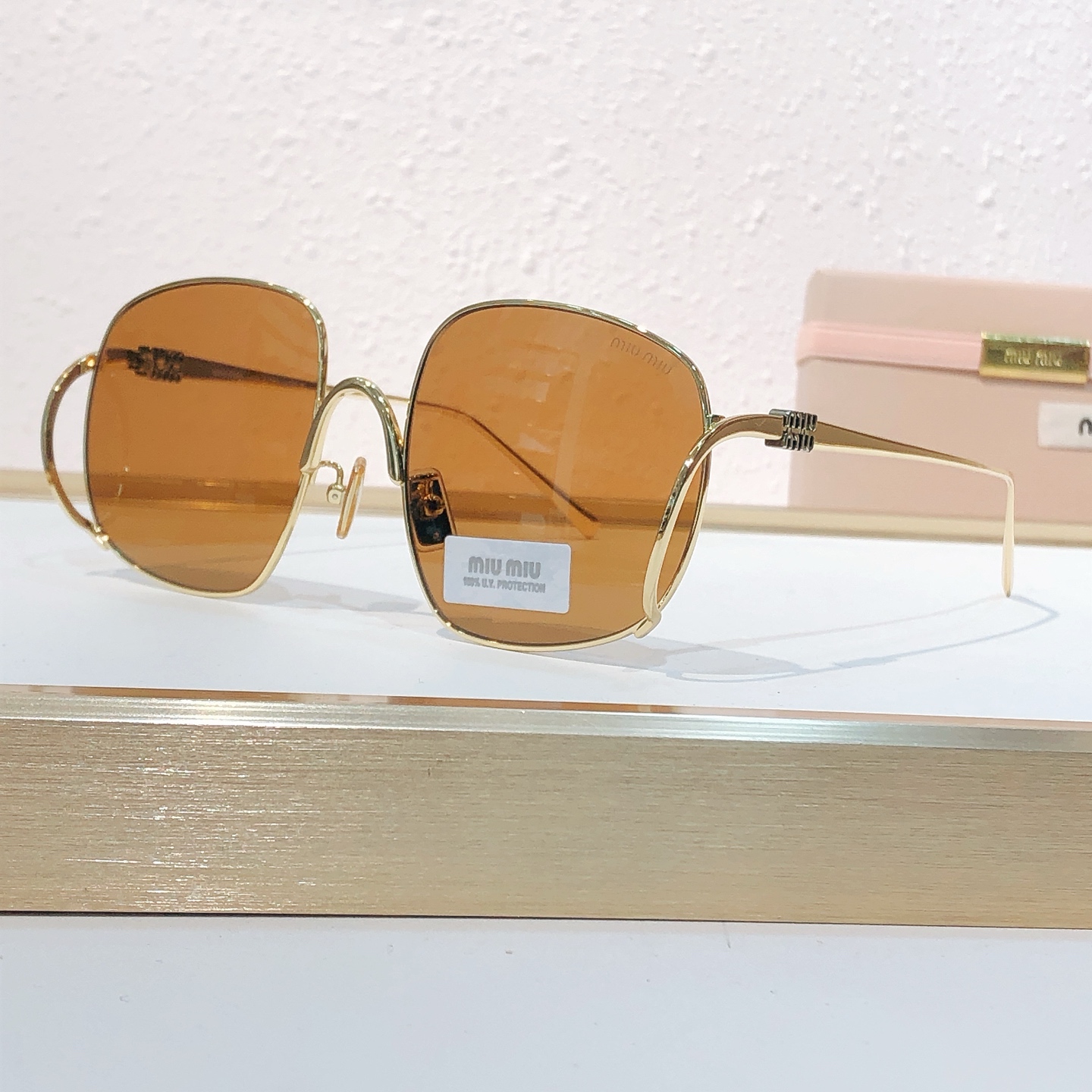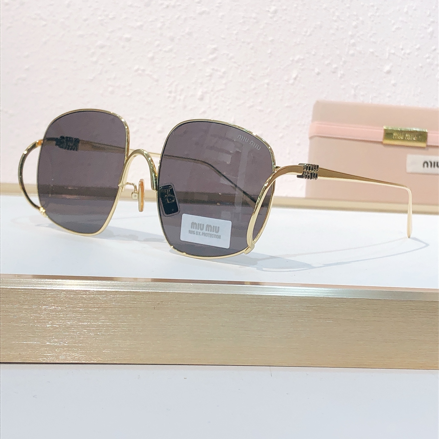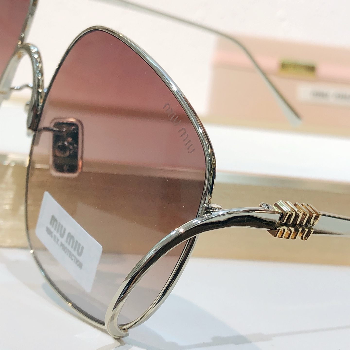 这款太阳眼镜是AAAAA 1:1 质量 (非常棒). 使用了和原版一模一样的材料. 商标部分也保持了和缪缪/Miu Miu一样. 图片拍摄是实物太阳眼镜拍摄, 您所收到的实物保证和我们图片一模一样.