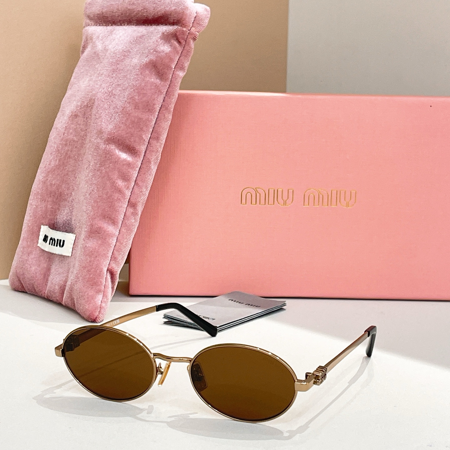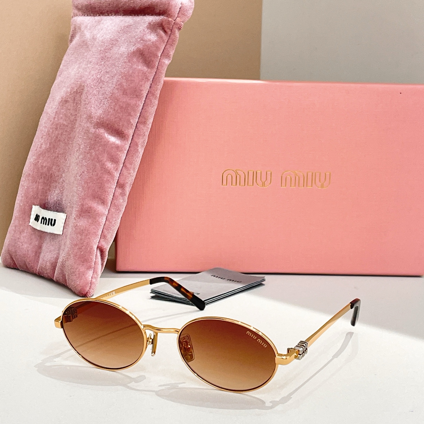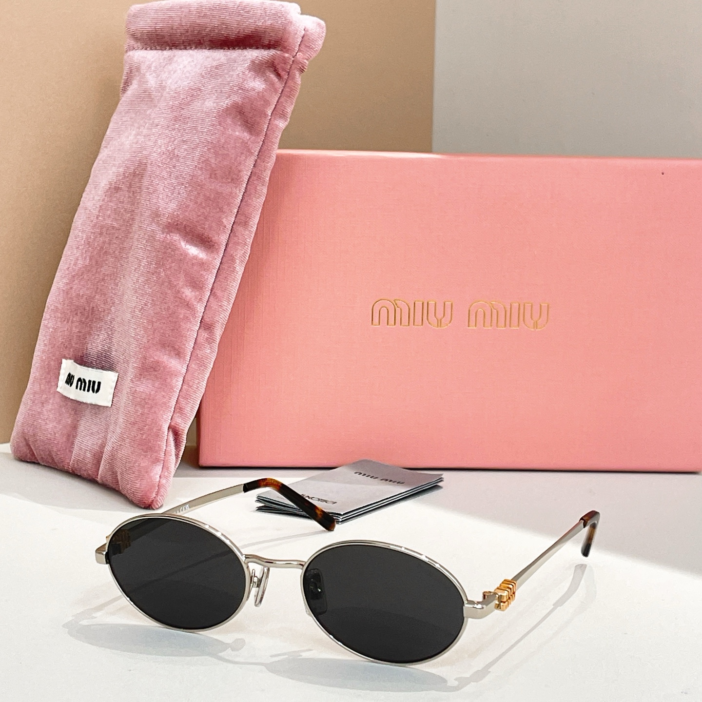 这款太阳眼镜是AAAAA 1:1 质量 (非常棒). 使用了和原版一模一样的材料. 商标部分也保持了和缪缪/Miu Miu一样. 图片拍摄是实物太阳眼镜拍摄, 您所收到的实物保证和我们图片一模一样.