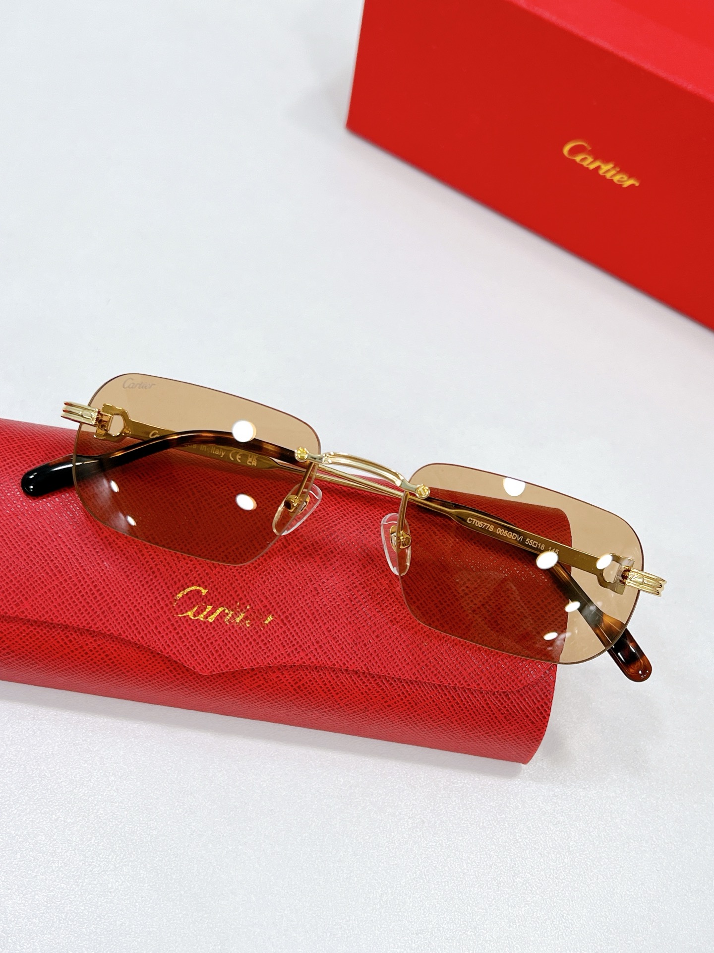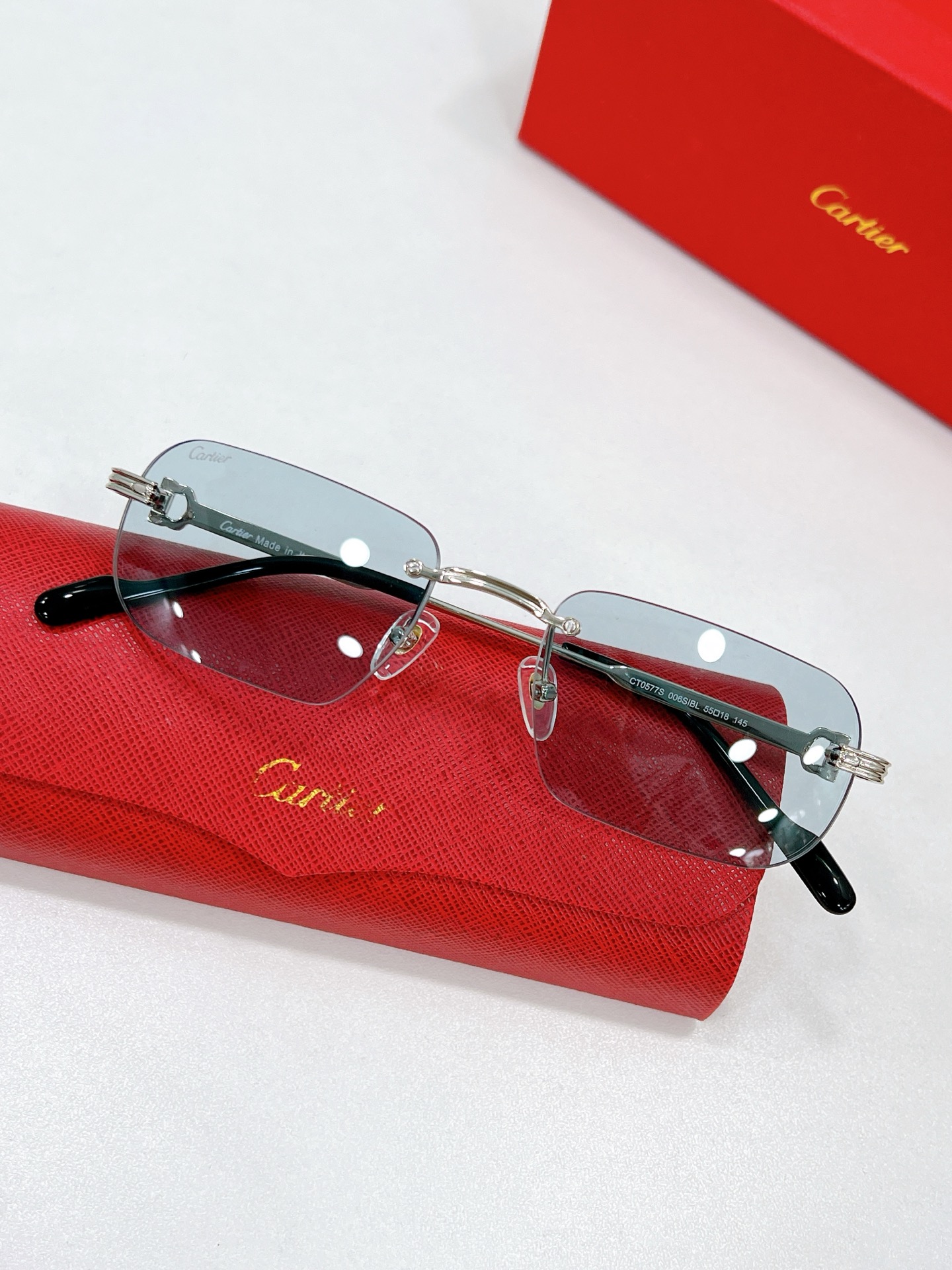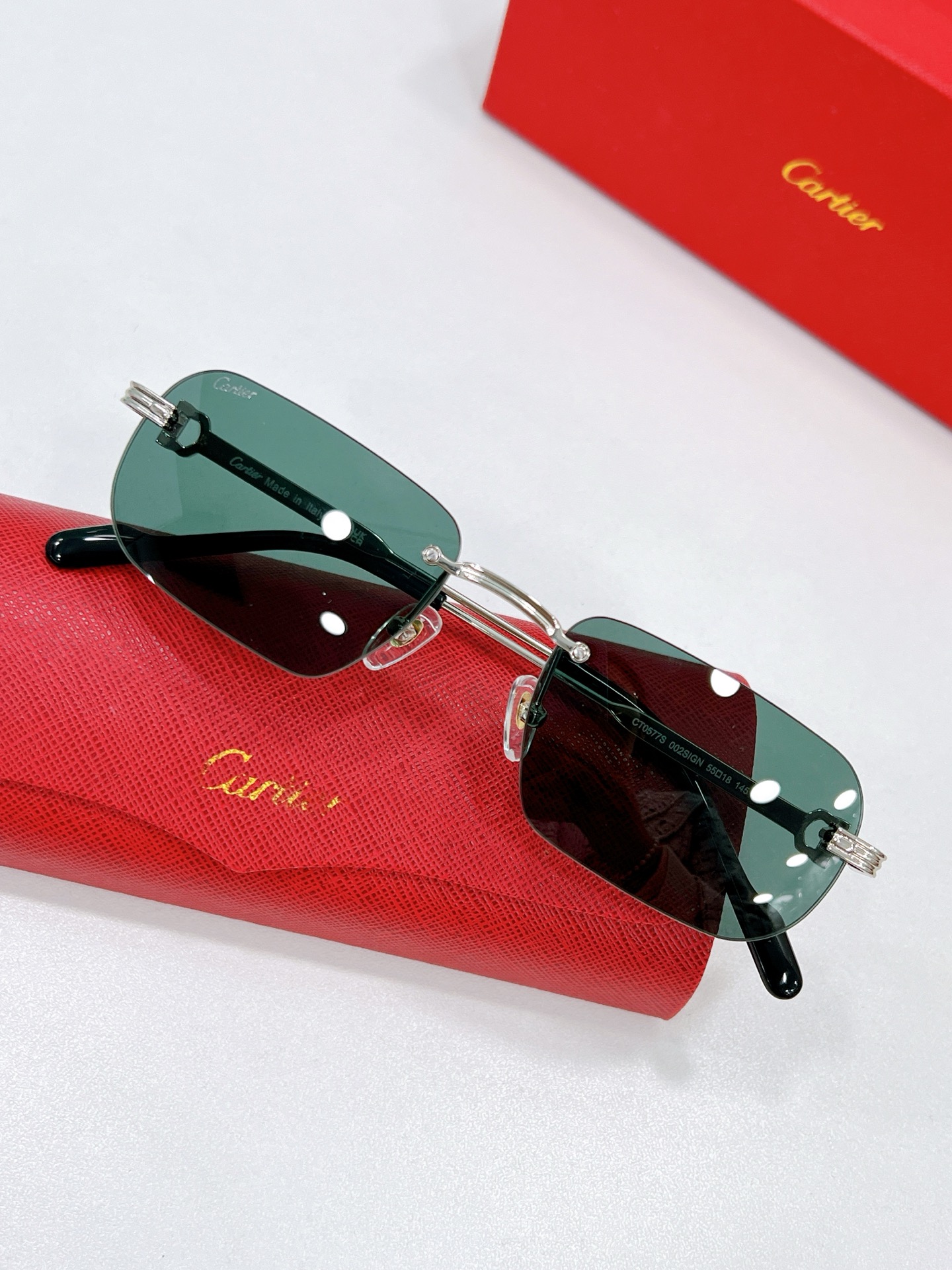 这款太阳眼镜是AAAAA 1:1 质量 (非常棒). 使用了和原版一模一样的材料. 商标部分也保持了和卡地亚/Cartier一样. 图片拍摄是实物太阳眼镜拍摄, 您所收到的实物保证和我们图片一模一样.
