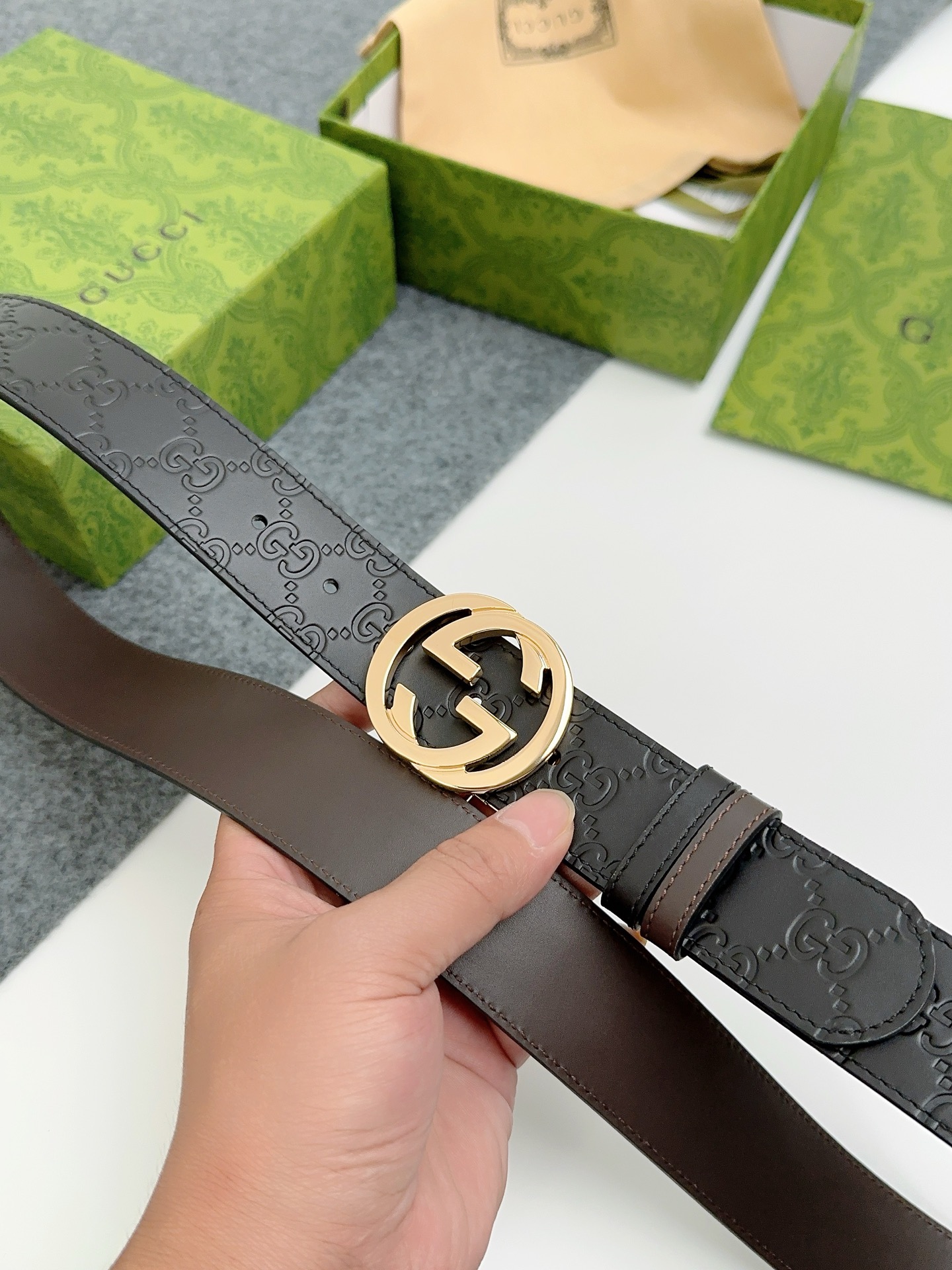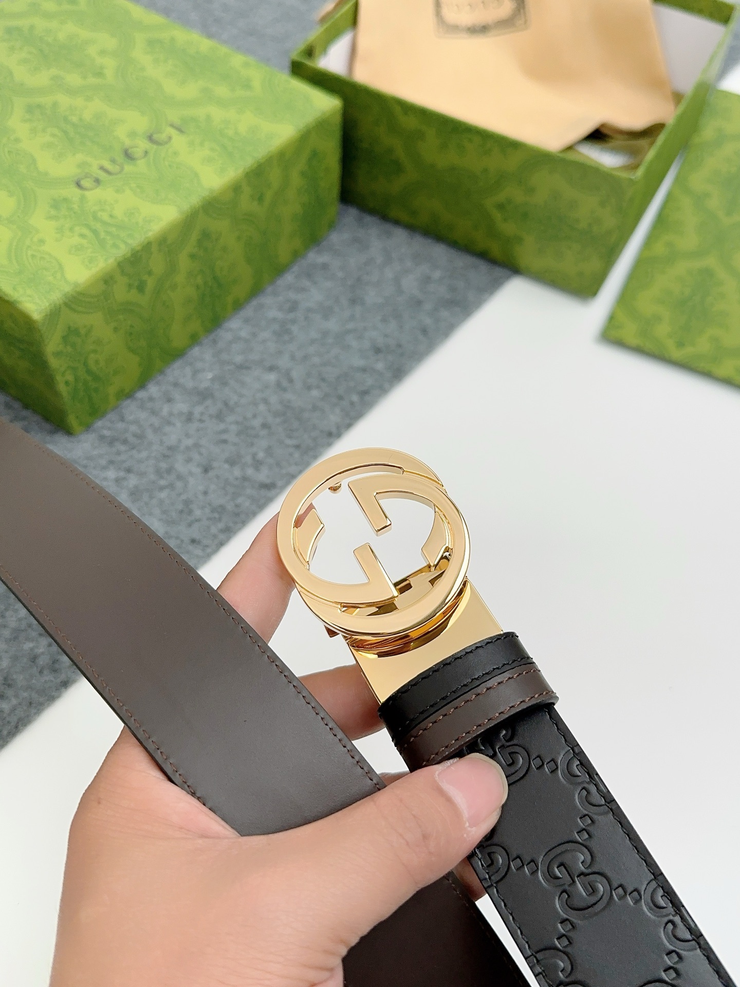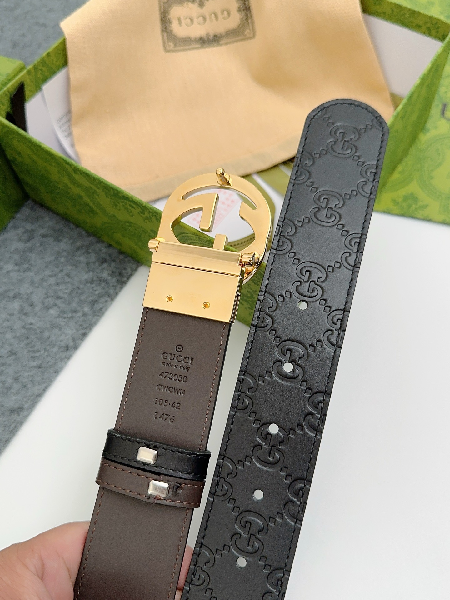 这款皮带是AAAAA 1:1 质量 (非常棒). 使用了和原版一模一样的材料. 商标部分也保持了和古奇/Gucci一样. 图片拍摄是实物皮带拍摄, 您所收到的实物保证和我们图片一模一样.