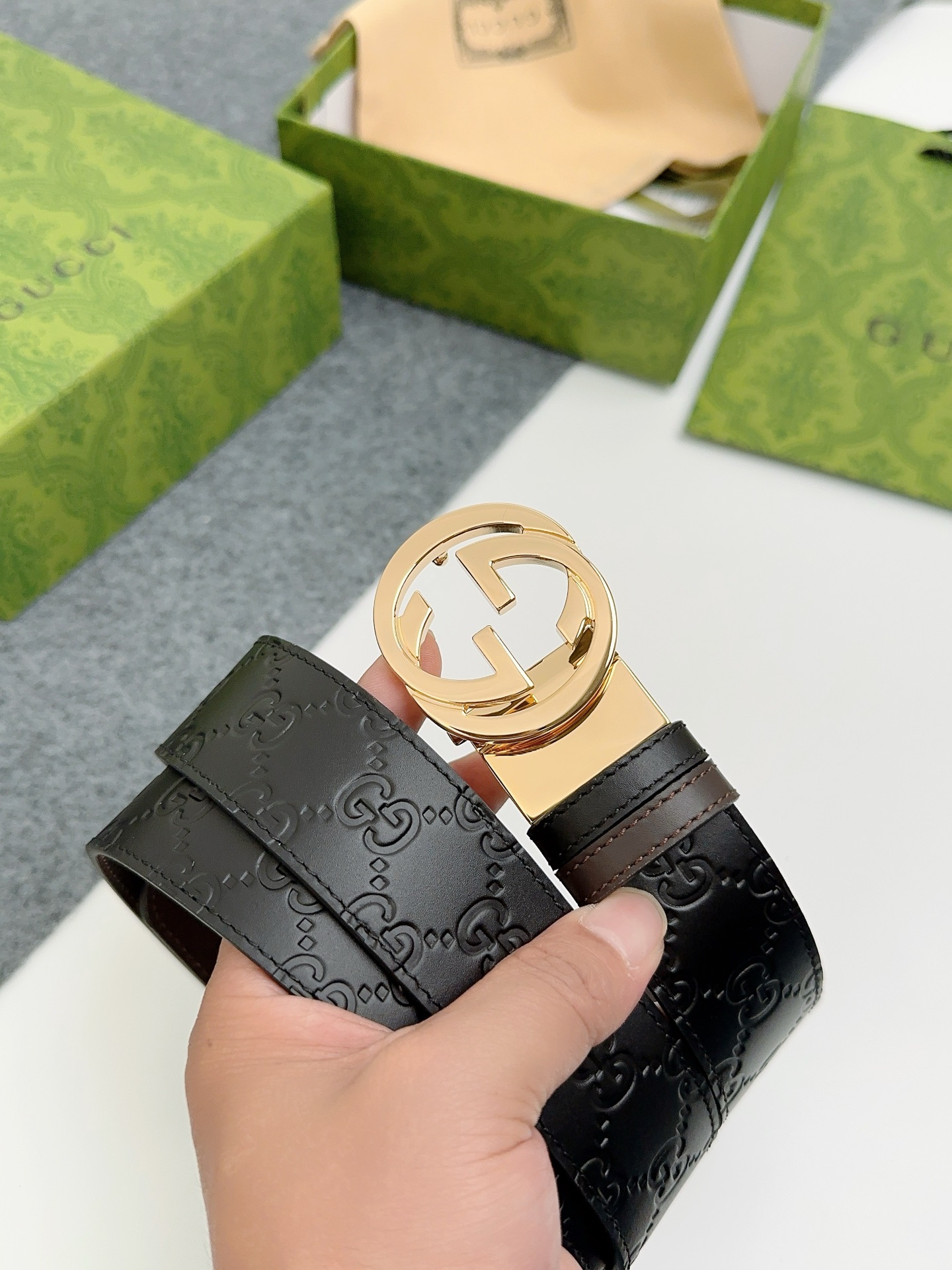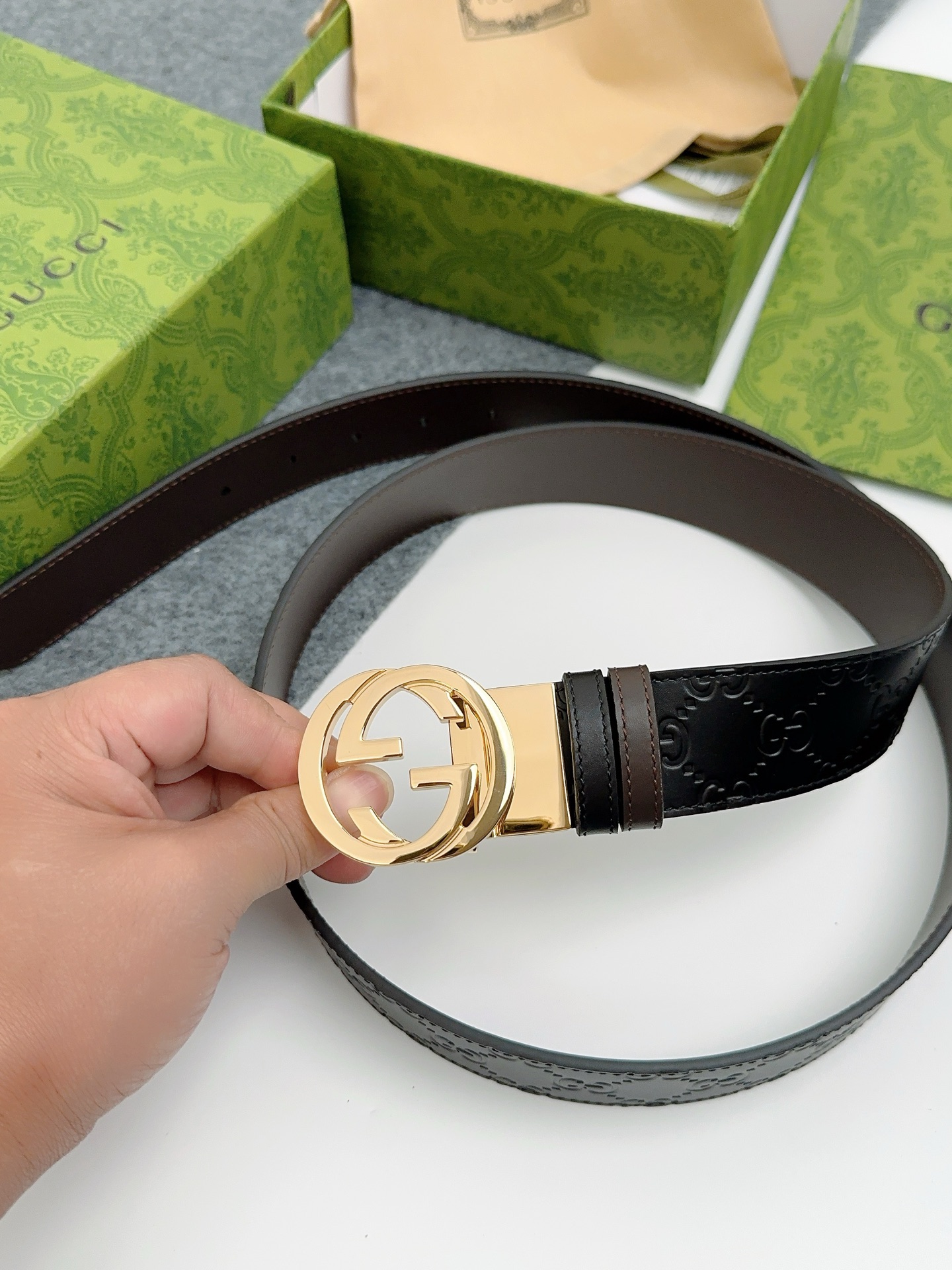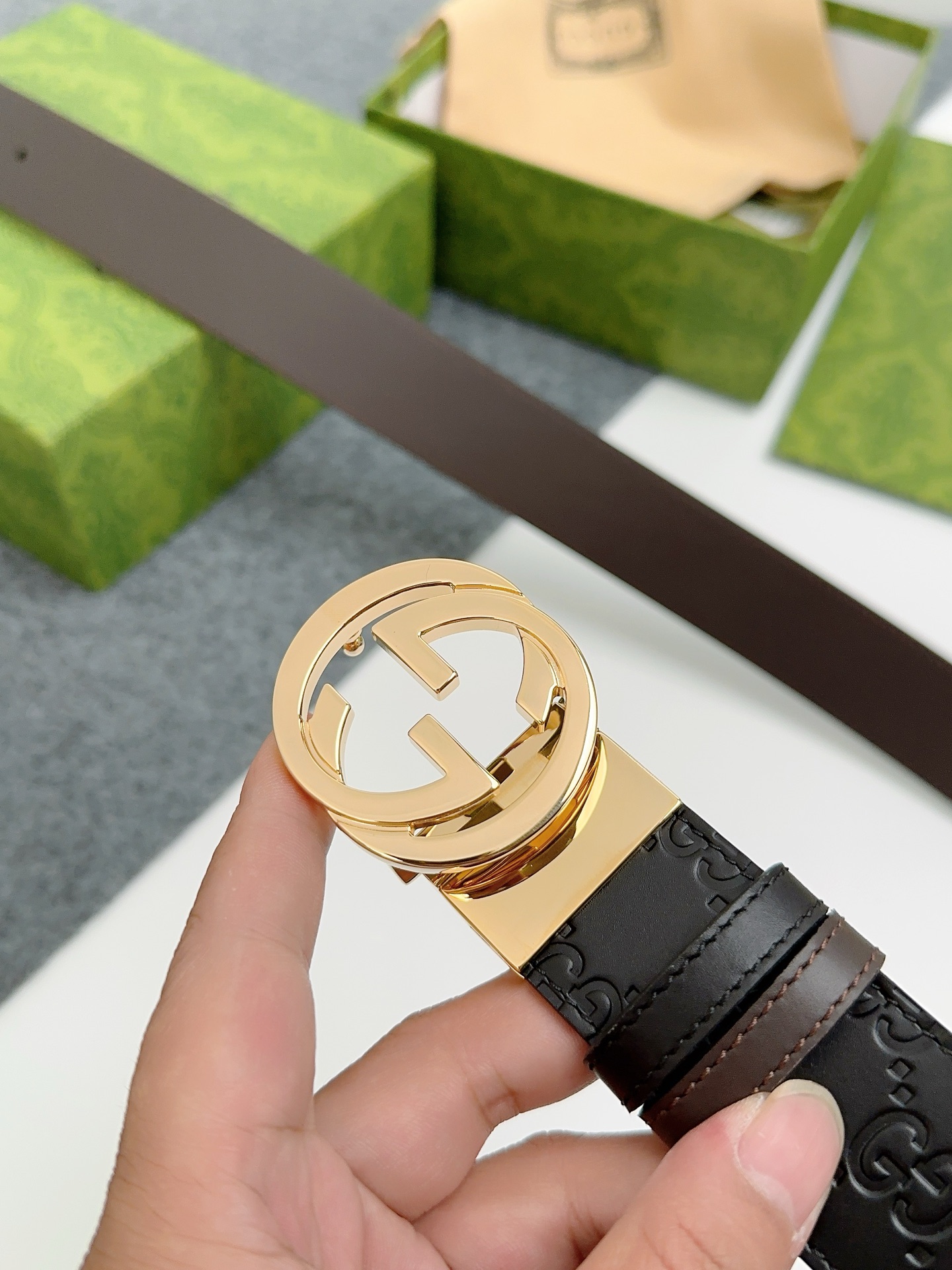 这款皮带是AAAAA 1:1 质量 (非常棒). 使用了和原版一模一样的材料. 商标部分也保持了和古奇/Gucci一样. 图片拍摄是实物皮带拍摄, 您所收到的实物保证和我们图片一模一样.
