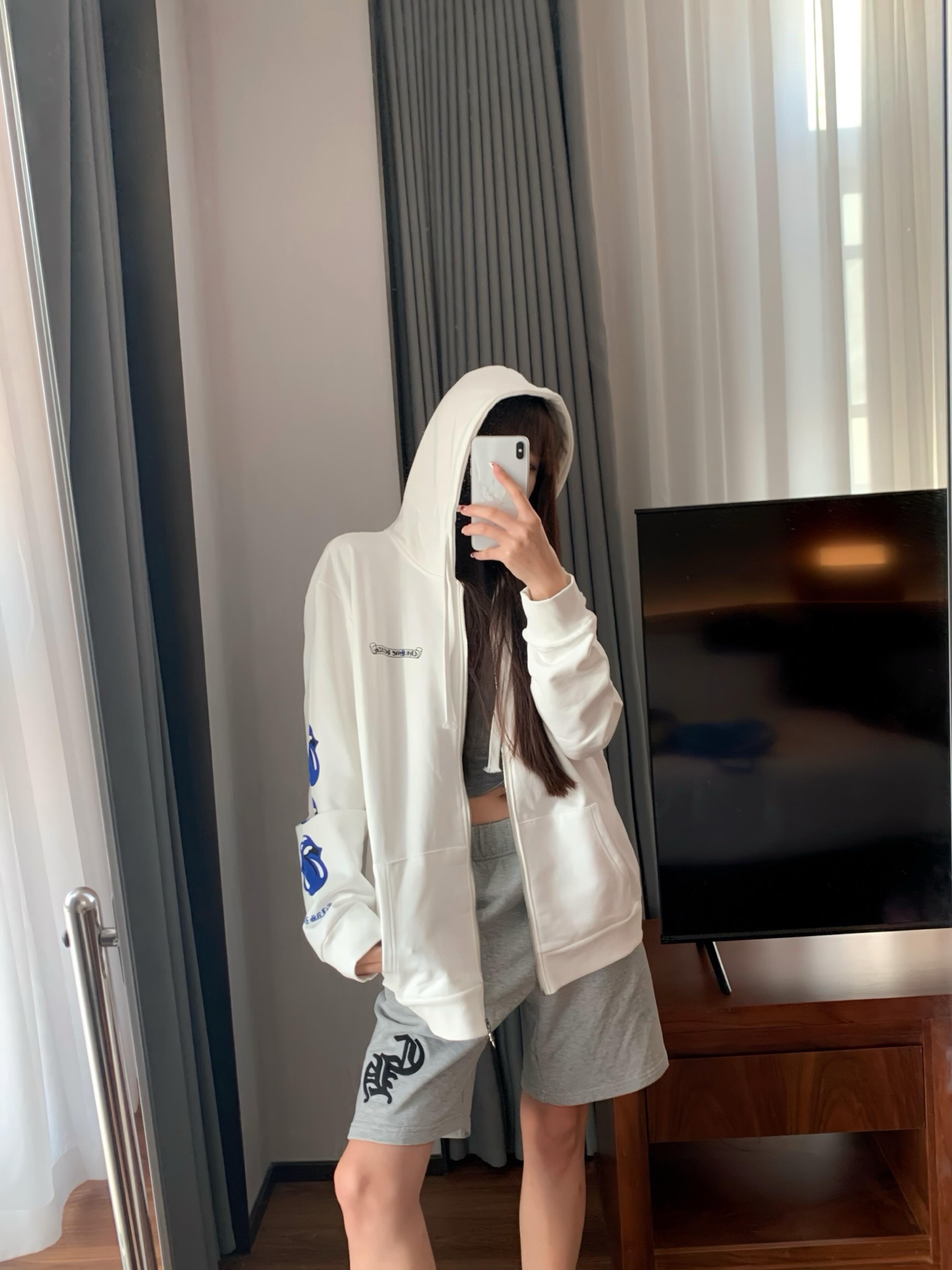 这款衣服是AAAAA 1:1 质量 (非常棒). 使用了和原版一模一样的材料. 商标部分也保持了和克罗心/Chrome Hearts一样. 图片拍摄是实物衣服拍摄, 您所收到的实物保证和我们图片一模一样.