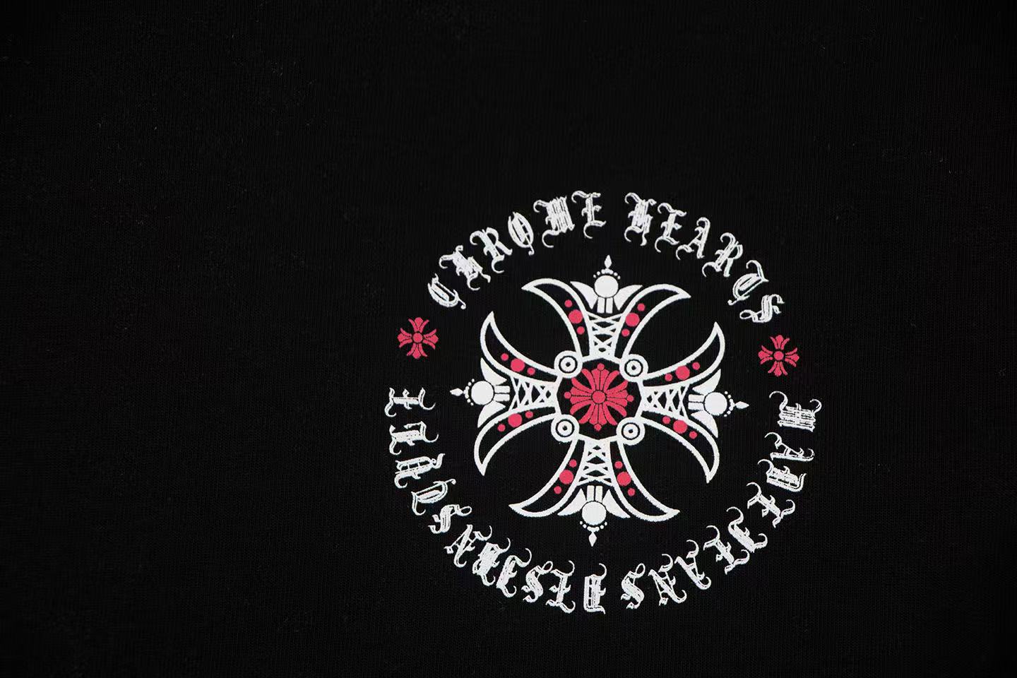 这款衣服是AAAAA 1:1 质量 (非常棒). 使用了和原版一模一样的材料. 商标部分也保持了和克罗心/Chrome Hearts一样. 图片拍摄是实物衣服拍摄, 您所收到的实物保证和我们图片一模一样.
