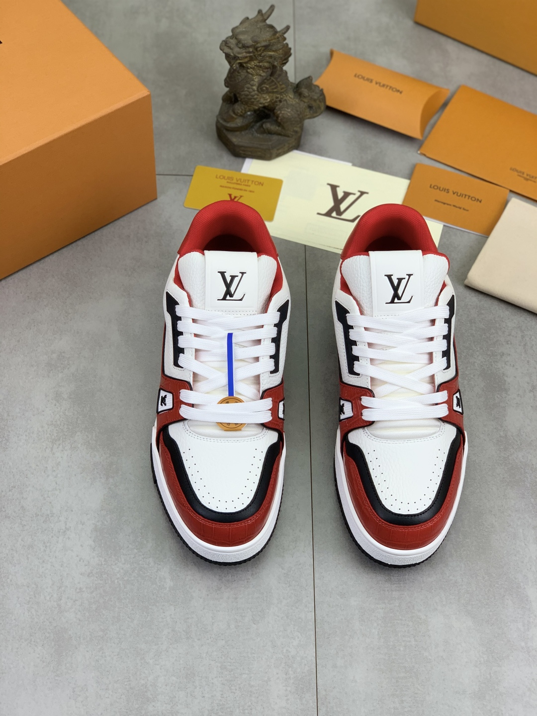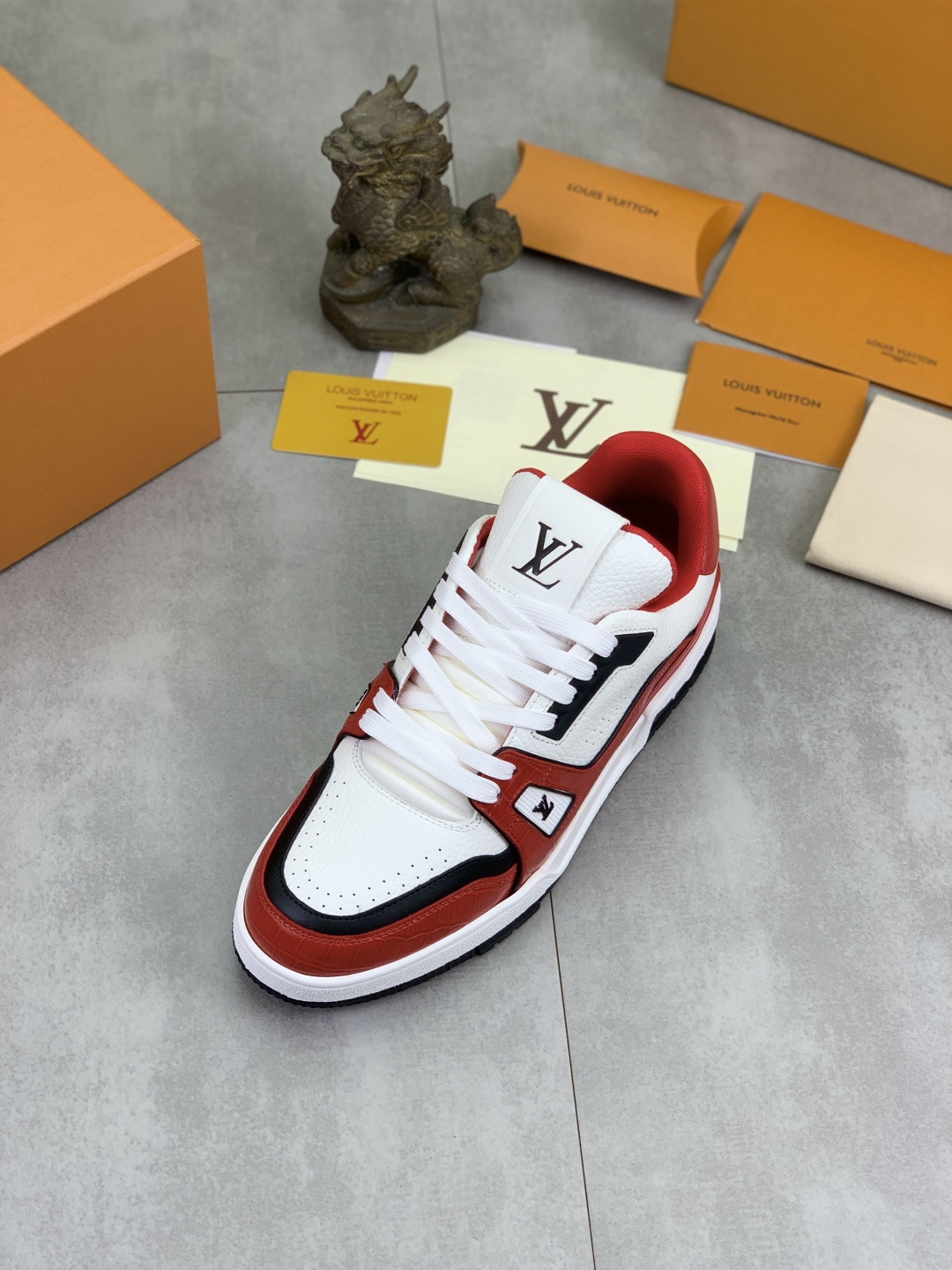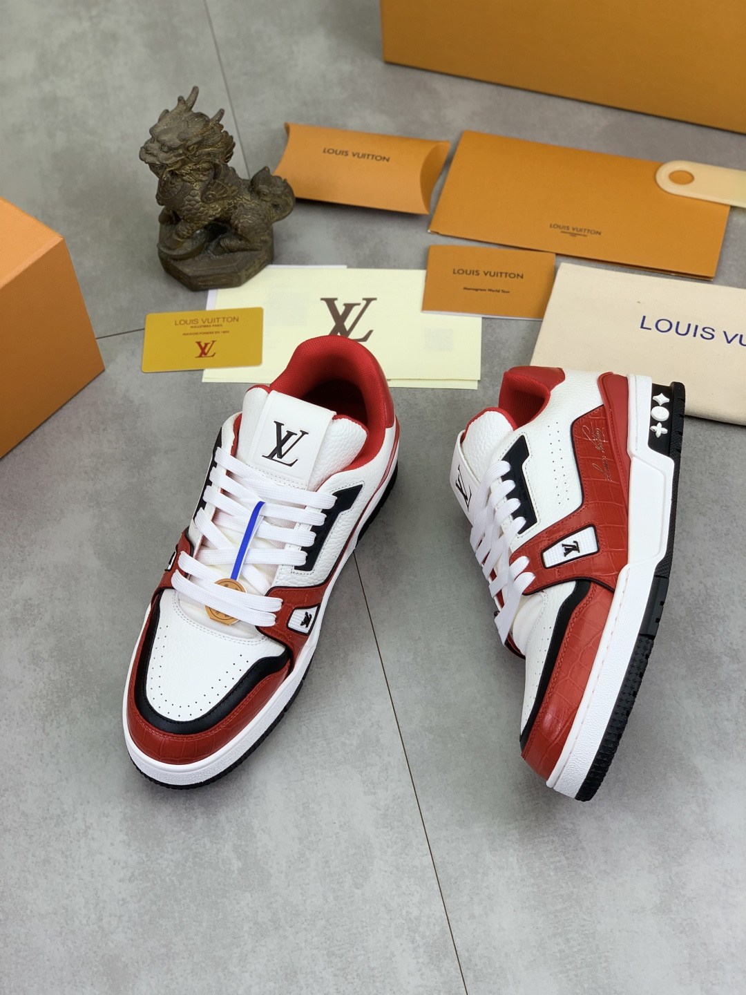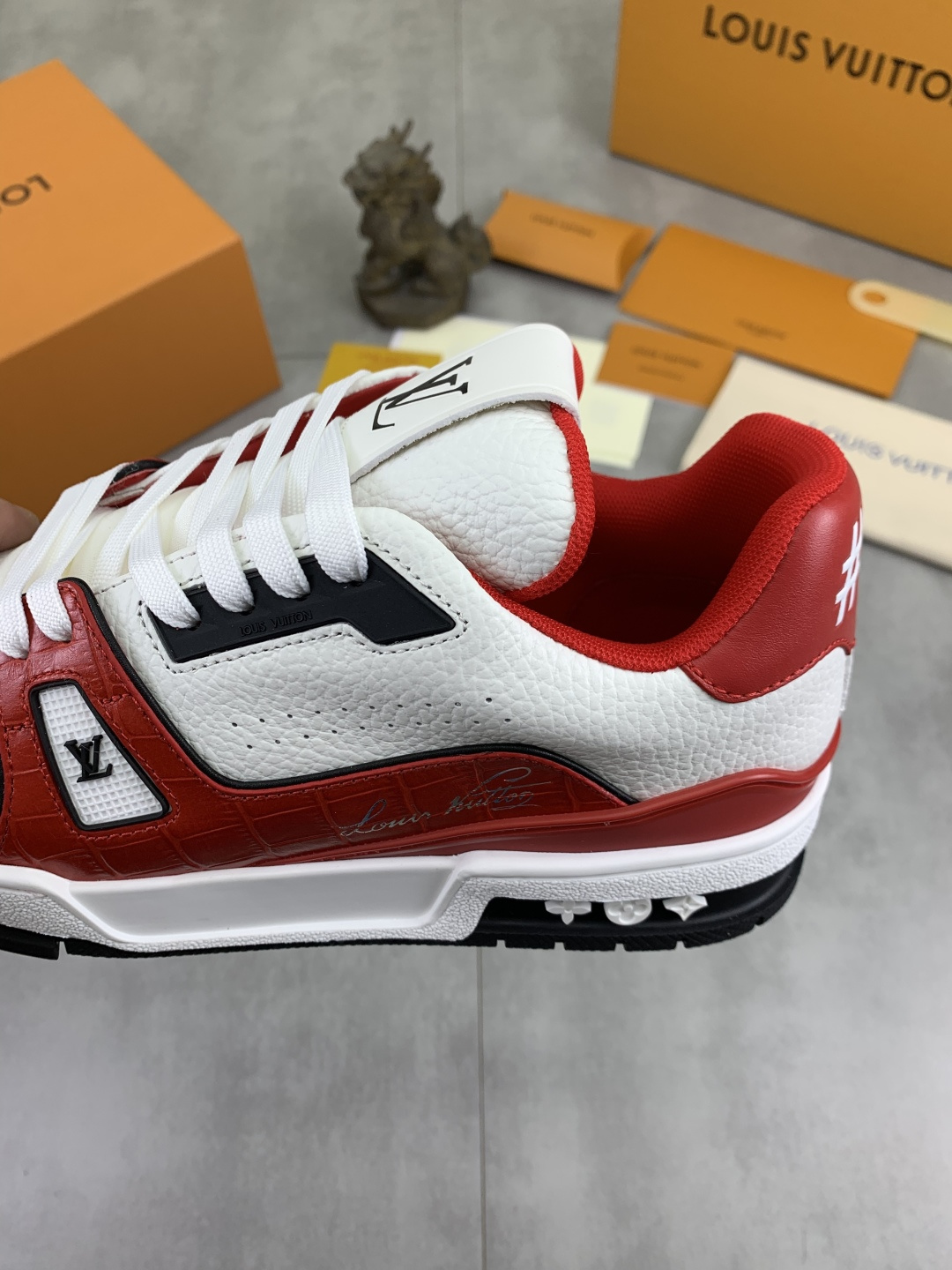 这款鞋子是AAAAA 1:1 质量 (非常棒). 使用了和原版一模一样的材料. 商标部分也保持了和路易威登/Louis Vuitton一样. 图片拍摄是实物鞋子拍摄, 您所收到的实物保证和我们图片一模一样.