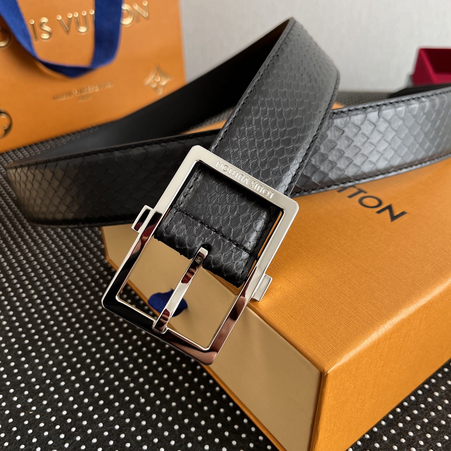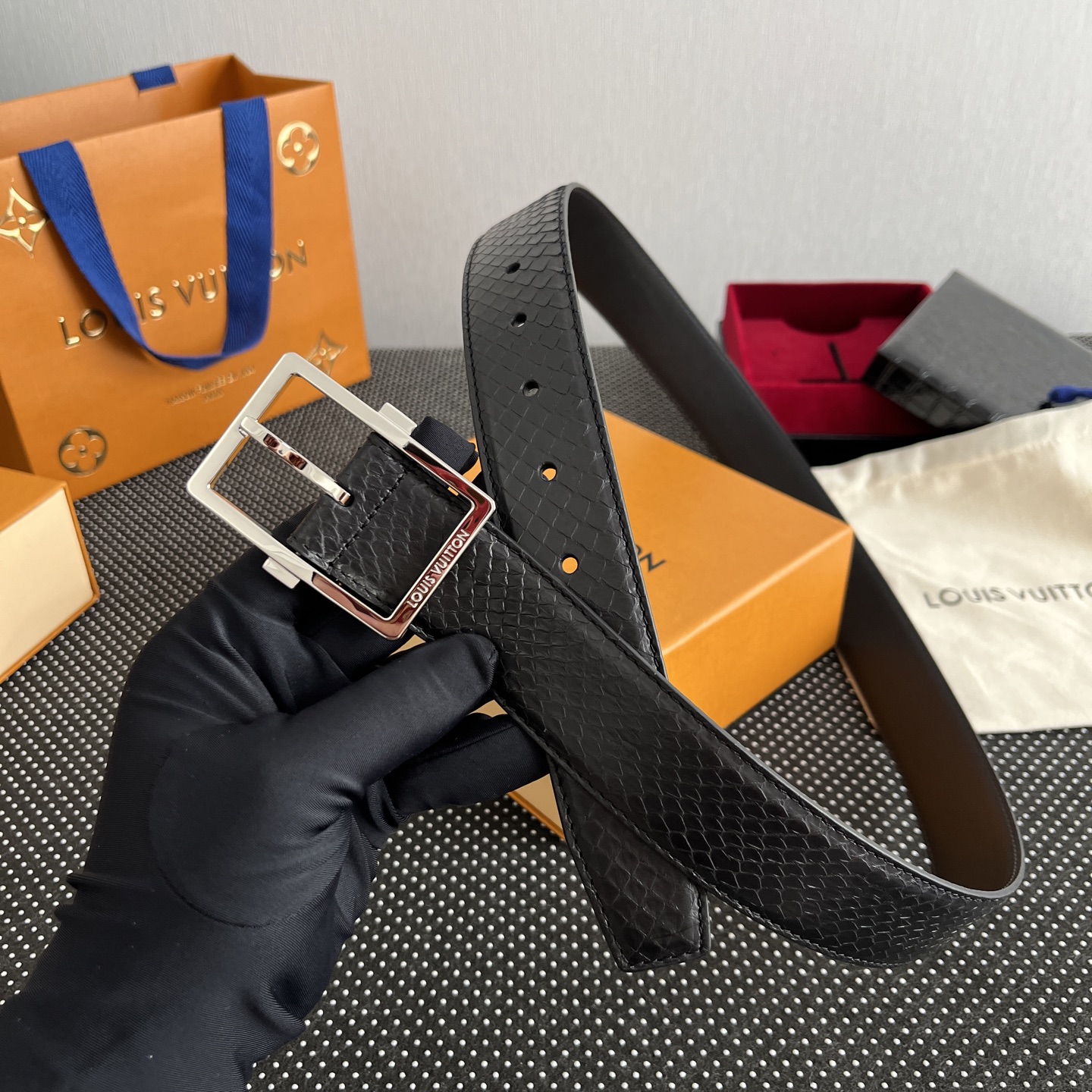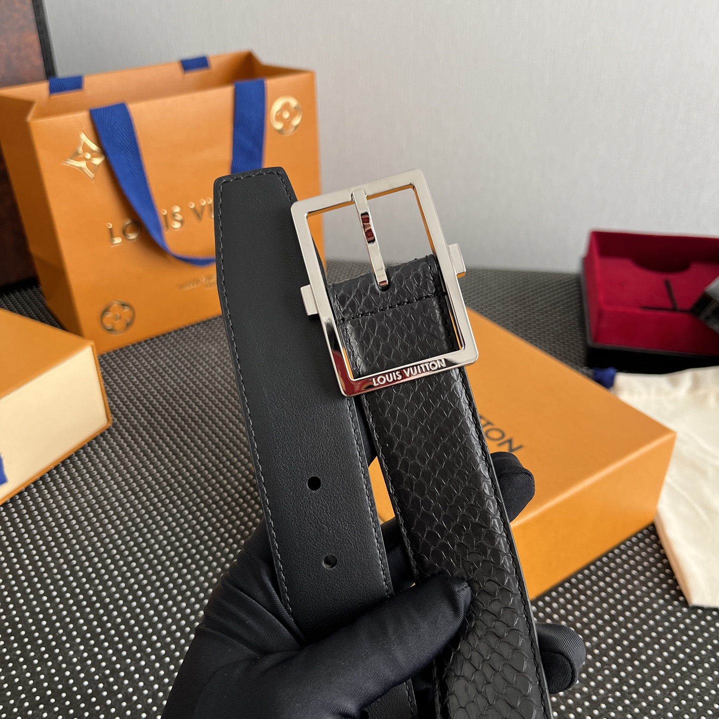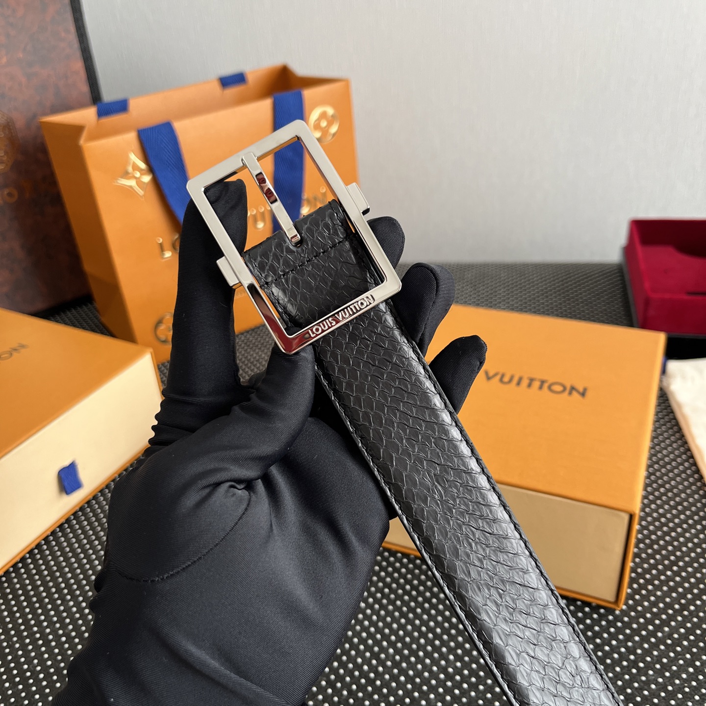 这款皮带是AAAAA 1:1 质量 (非常棒). 使用了和原版一模一样的材料. 商标部分也保持了和路易威登/Louis Vuitton一样. 图片拍摄是实物皮带拍摄, 您所收到的实物保证和我们图片一模一样.