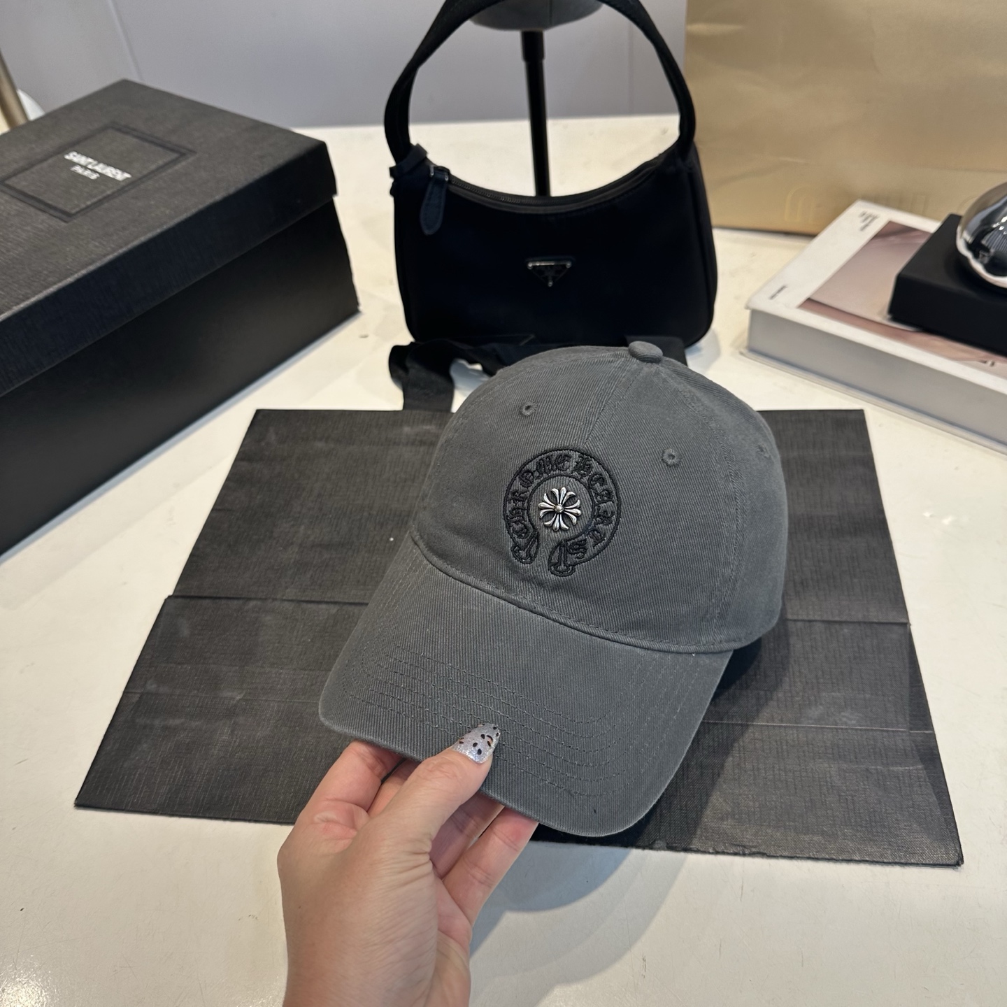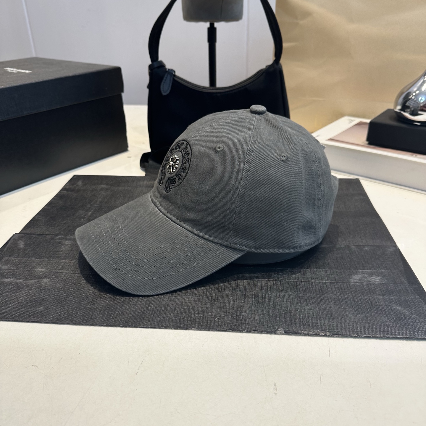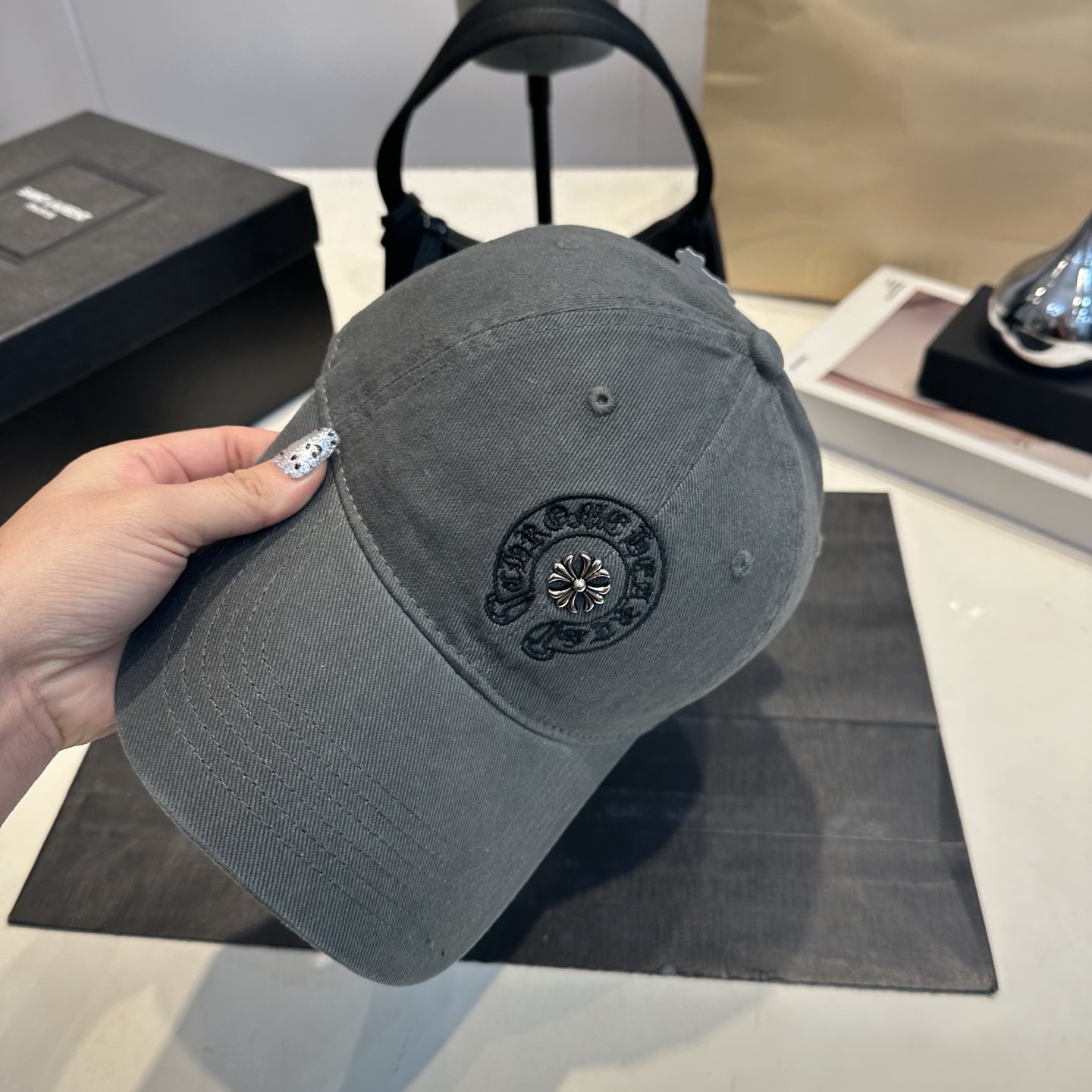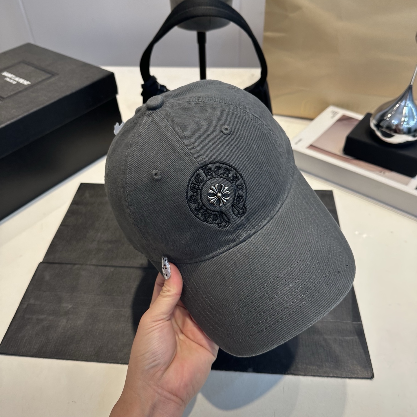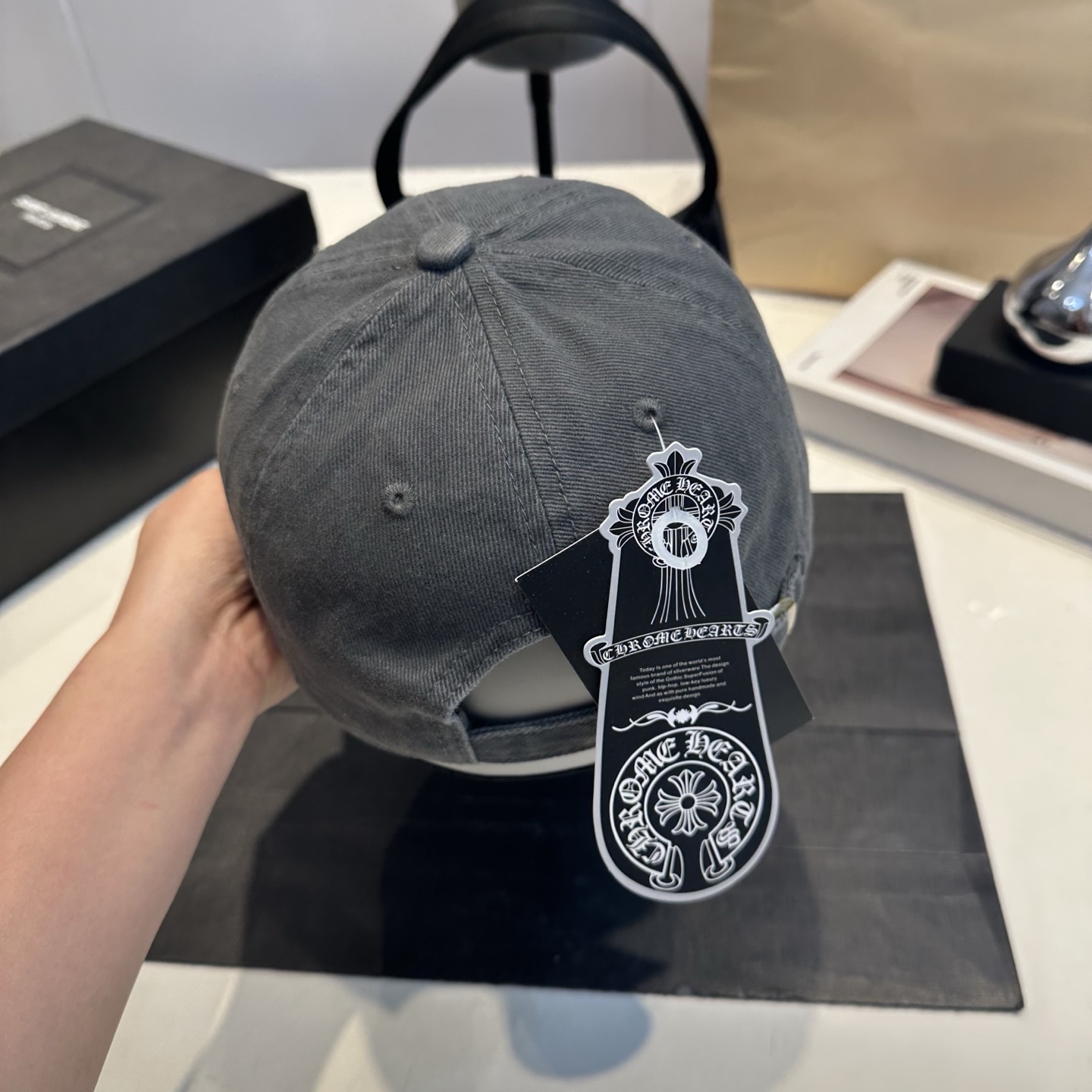 这款帽子是AAAAA 1:1 质量 (非常棒). 使用了和原版一模一样的材料. 商标部分也保持了和克罗心/Chrome Hearts一样. 图片拍摄是实物帽子拍摄, 您所收到的实物保证和我们图片一模一样.