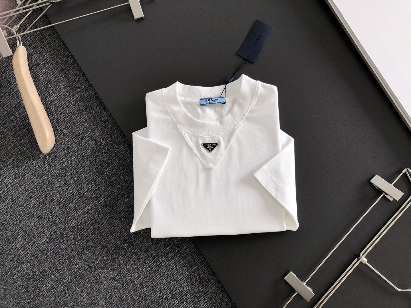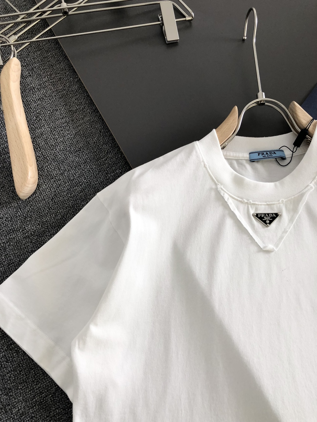 这款衣服是AAAAA 1:1 质量 (非常棒). 使用了和原版一模一样的材料. 商标部分也保持了和普拉达/Prada一样. 图片拍摄是实物衣服拍摄, 您所收到的实物保证和我们图片一模一样.