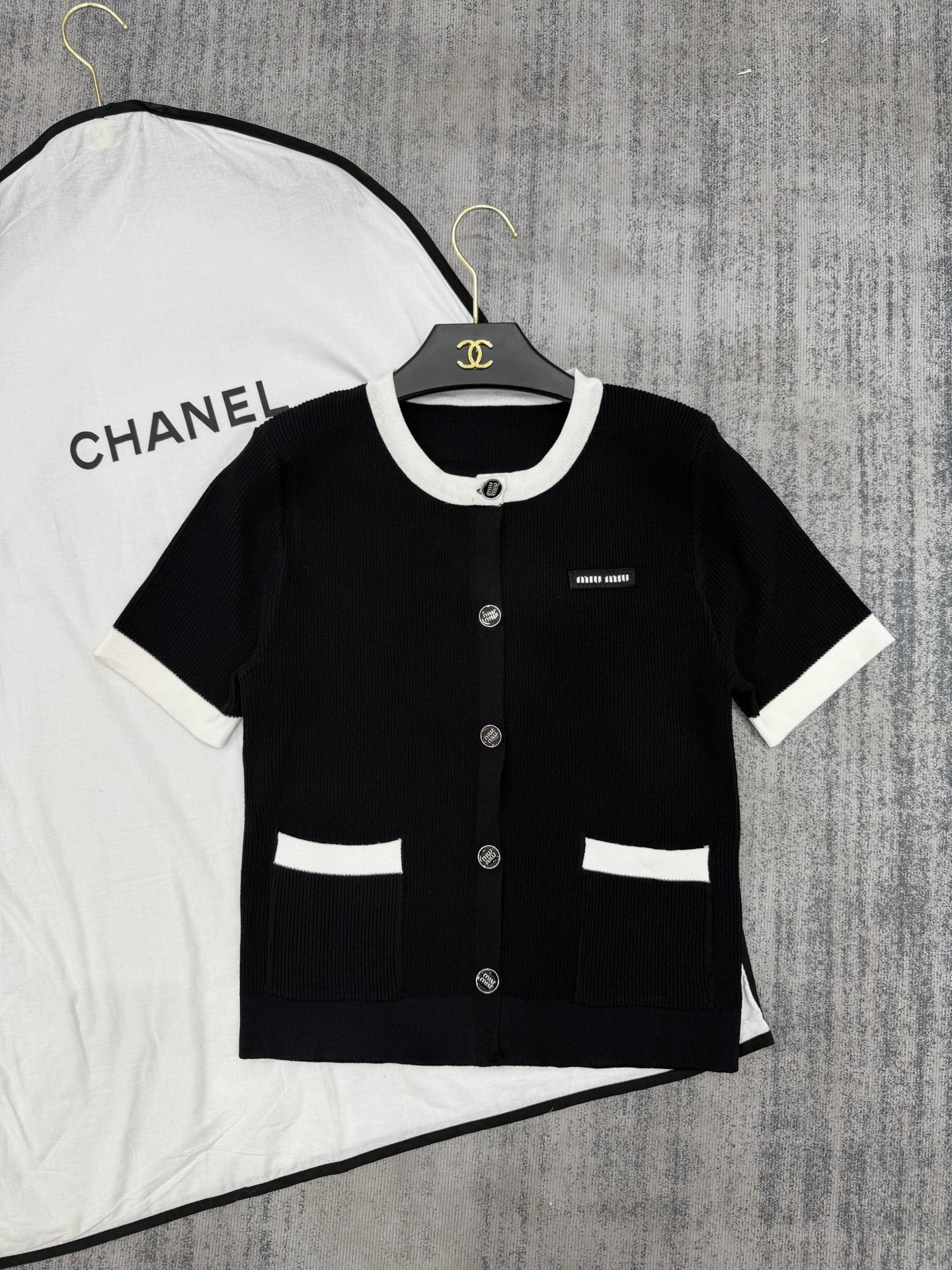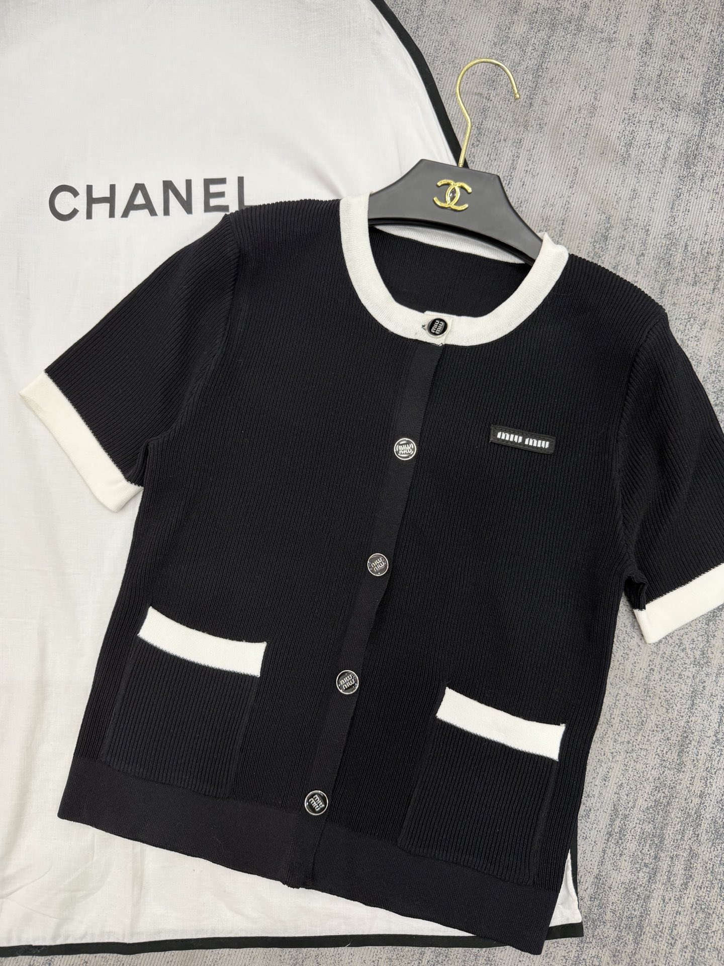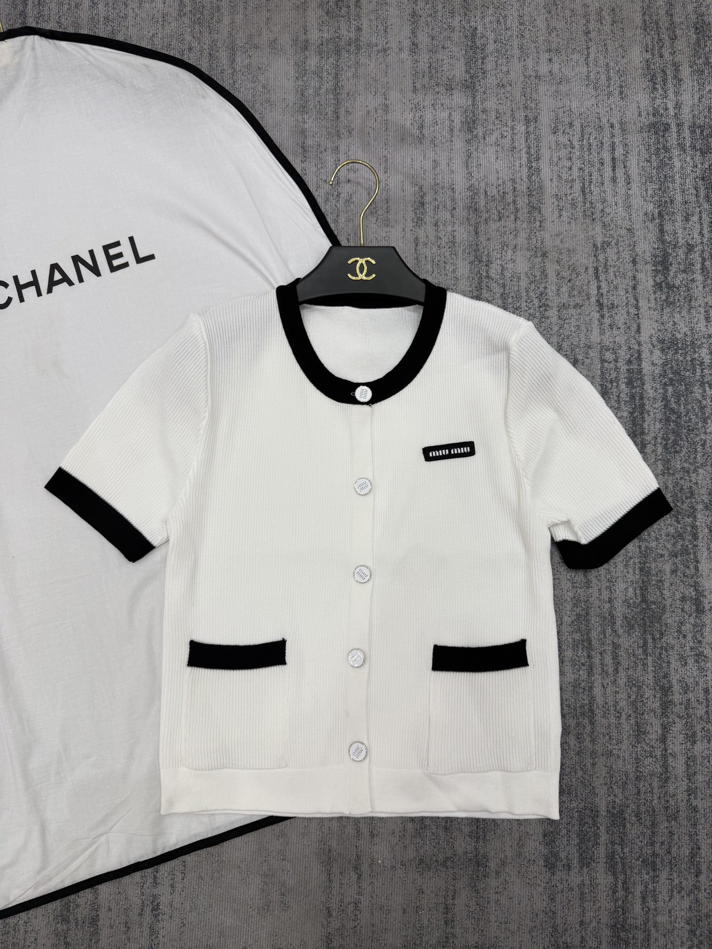 这款衣服是AAAAA 1:1 质量 (非常棒). 使用了和原版一模一样的材料. 商标部分也保持了和缪缪/Miu Miu一样. 图片拍摄是实物衣服拍摄, 您所收到的实物保证和我们图片一模一样.