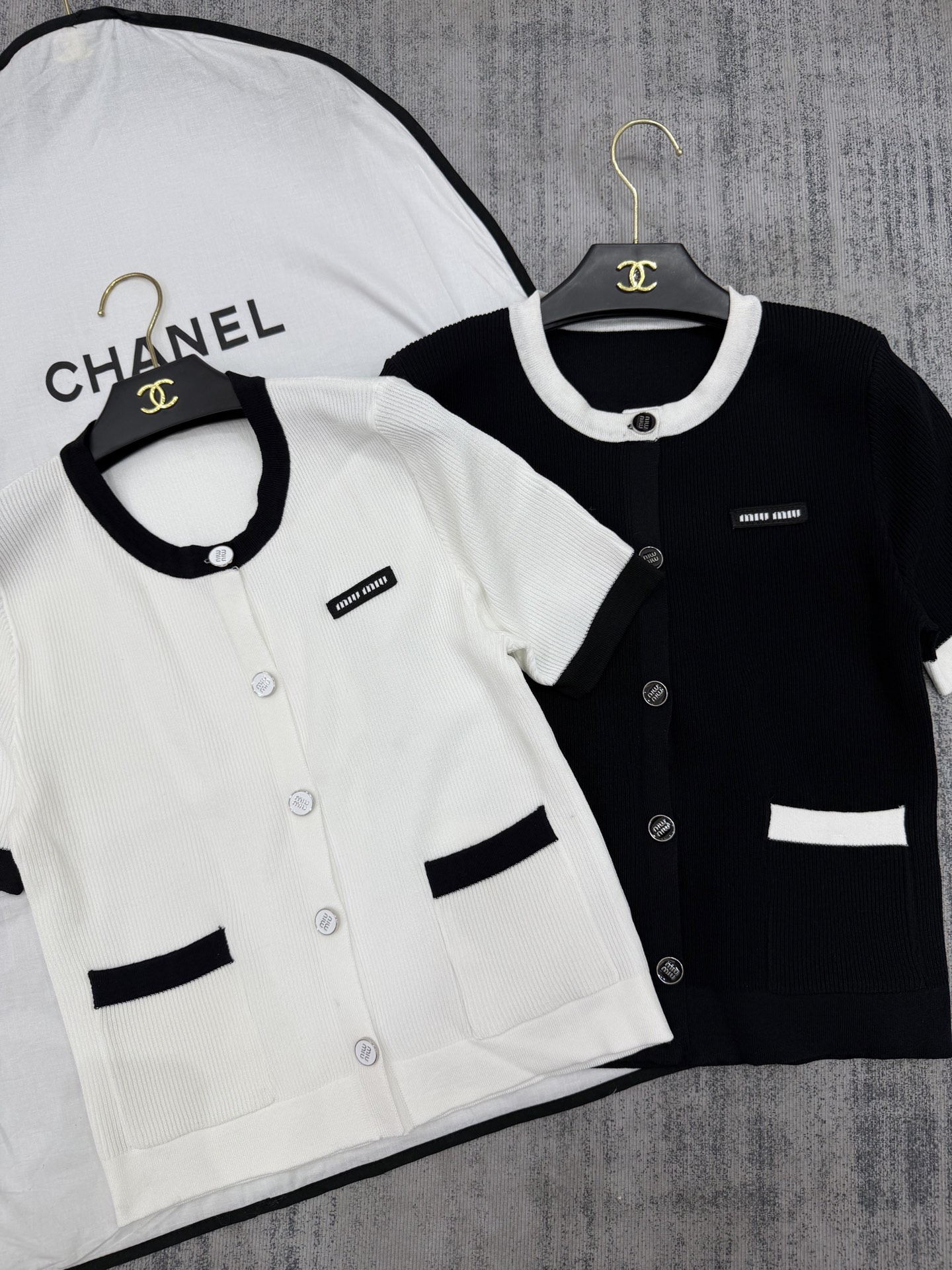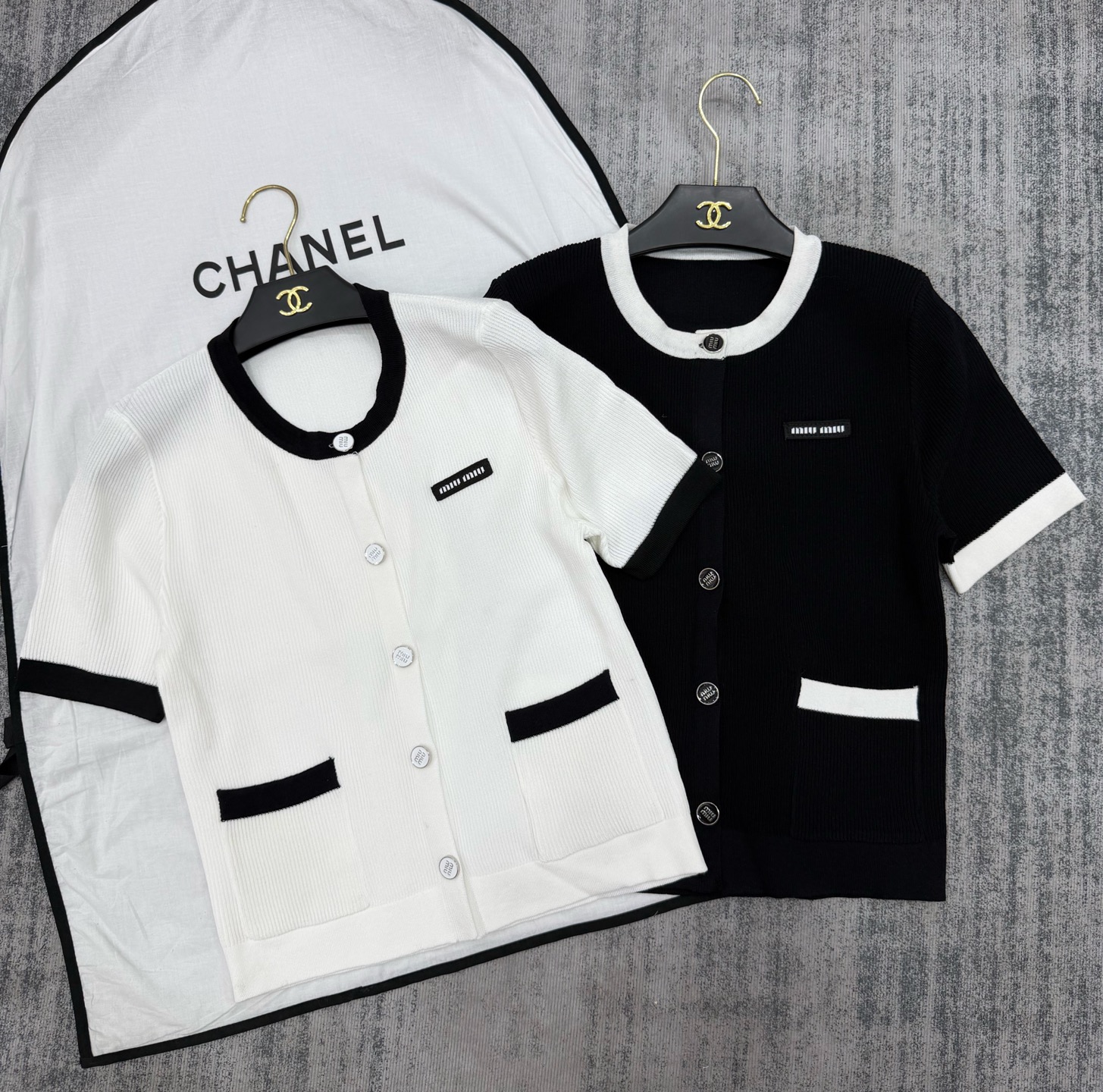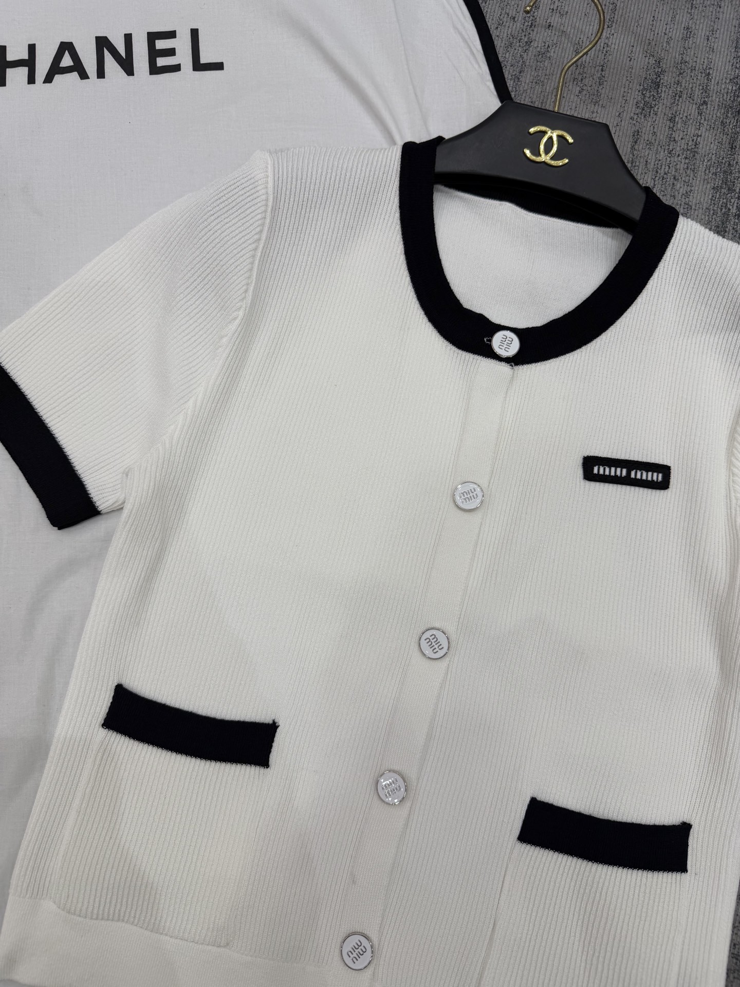 这款衣服是AAAAA 1:1 质量 (非常棒). 使用了和原版一模一样的材料. 商标部分也保持了和缪缪/Miu Miu一样. 图片拍摄是实物衣服拍摄, 您所收到的实物保证和我们图片一模一样.