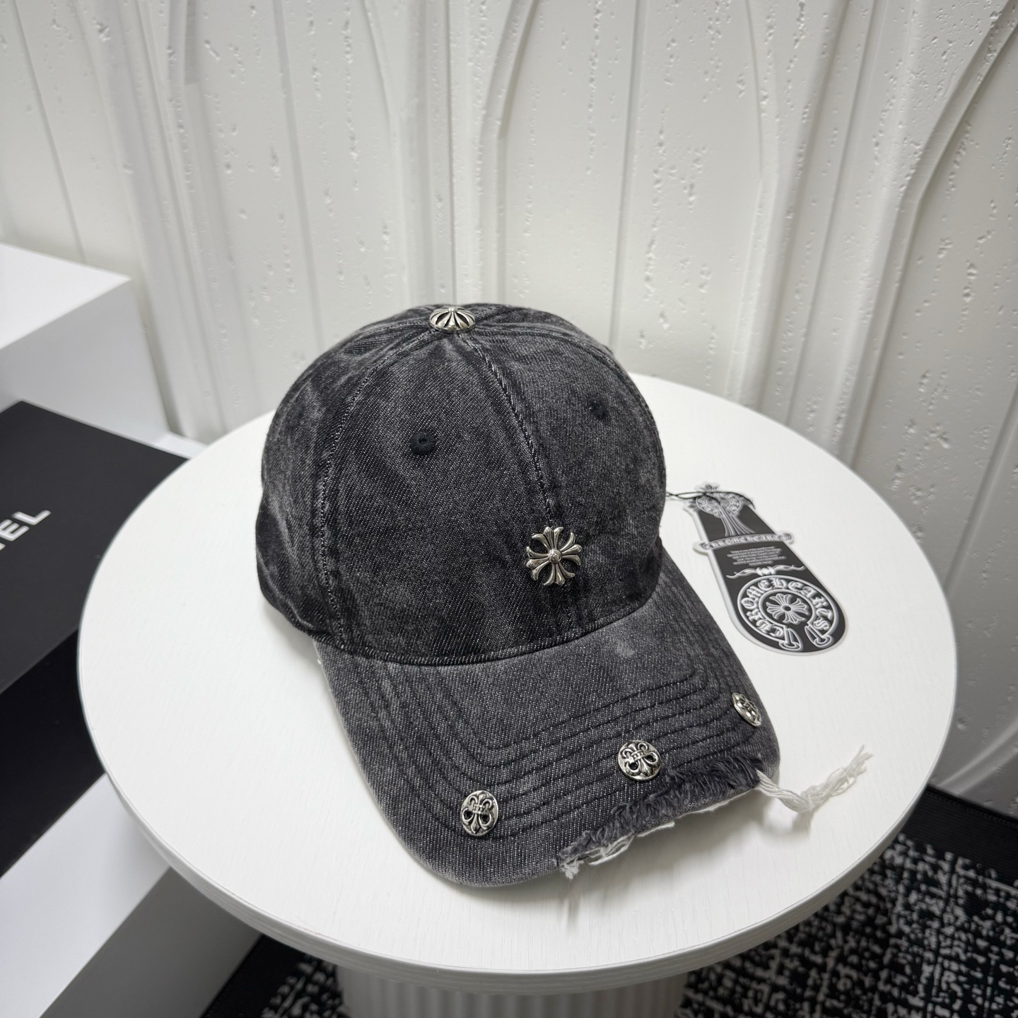 这款帽子是AAAAA 1:1 质量 (非常棒). 使用了和原版一模一样的材料. 商标部分也保持了和克罗心/Chrome Hearts一样. 图片拍摄是实物帽子拍摄, 您所收到的实物保证和我们图片一模一样.