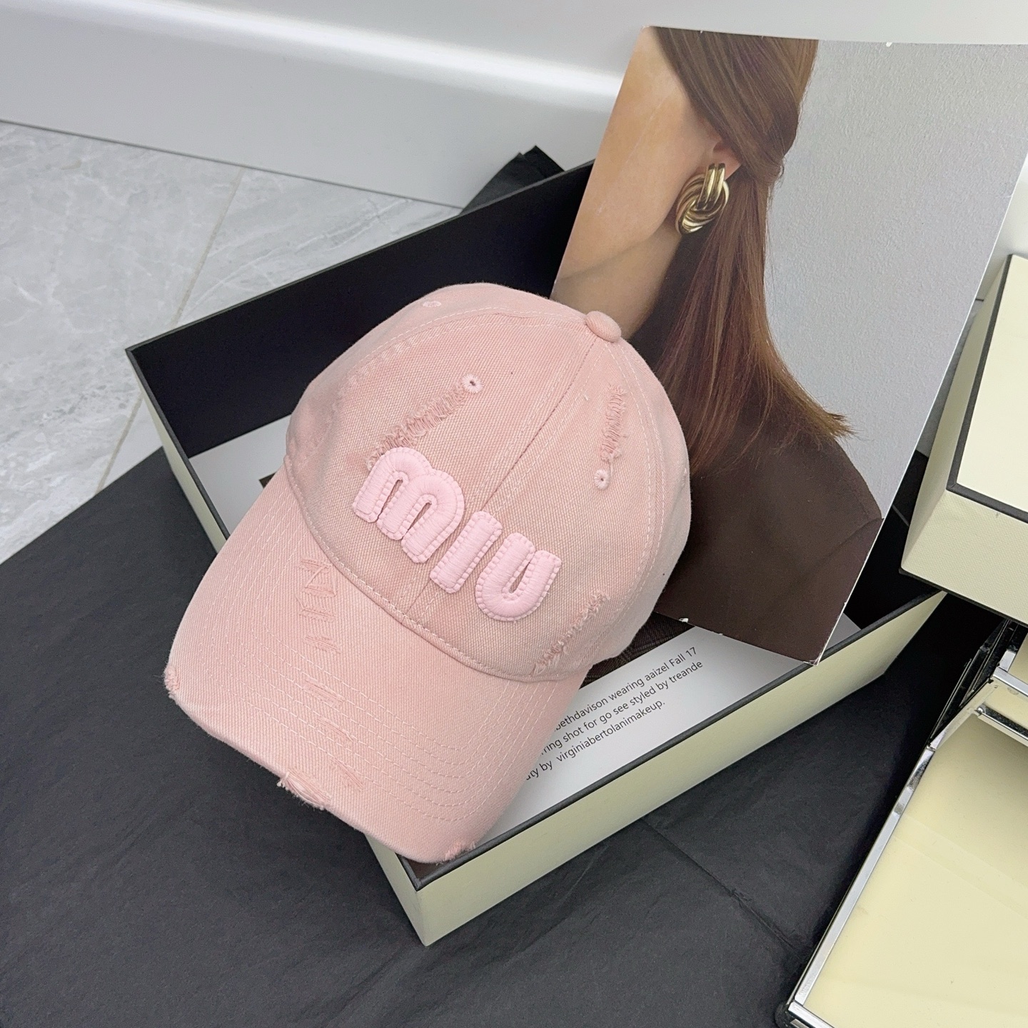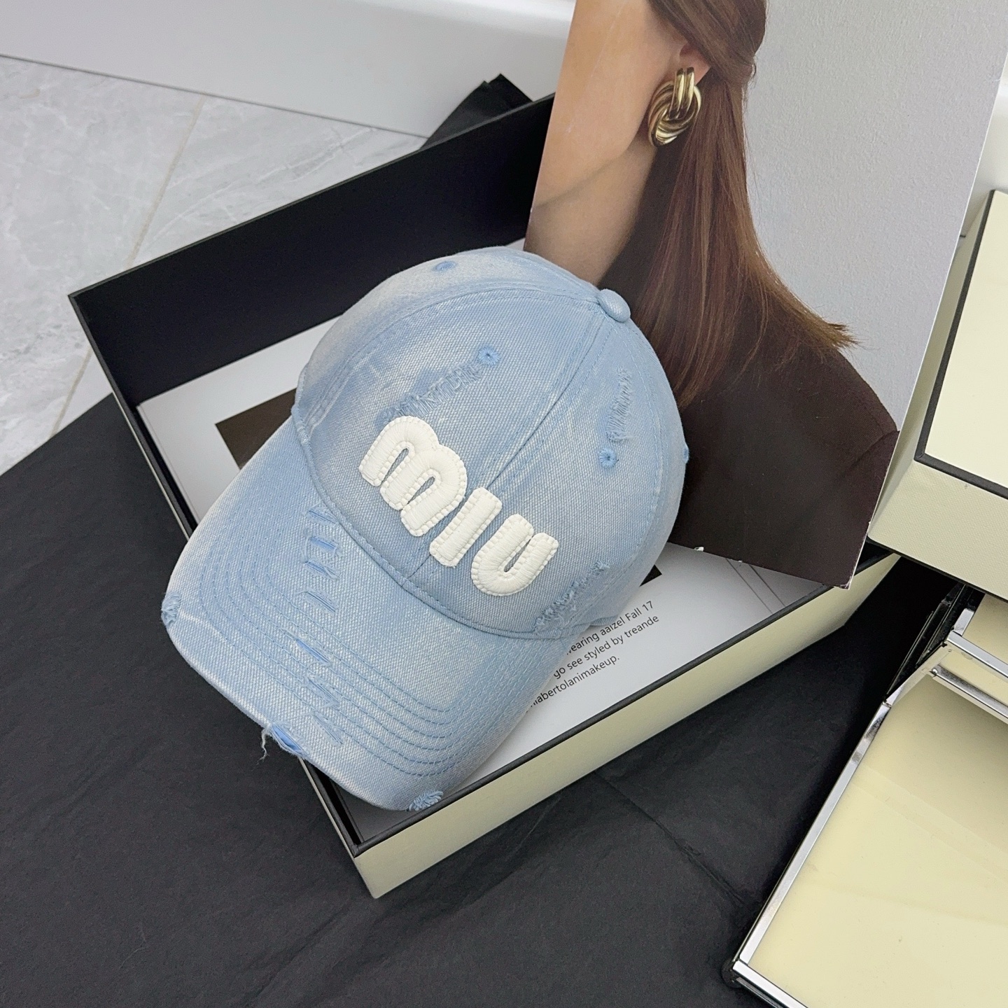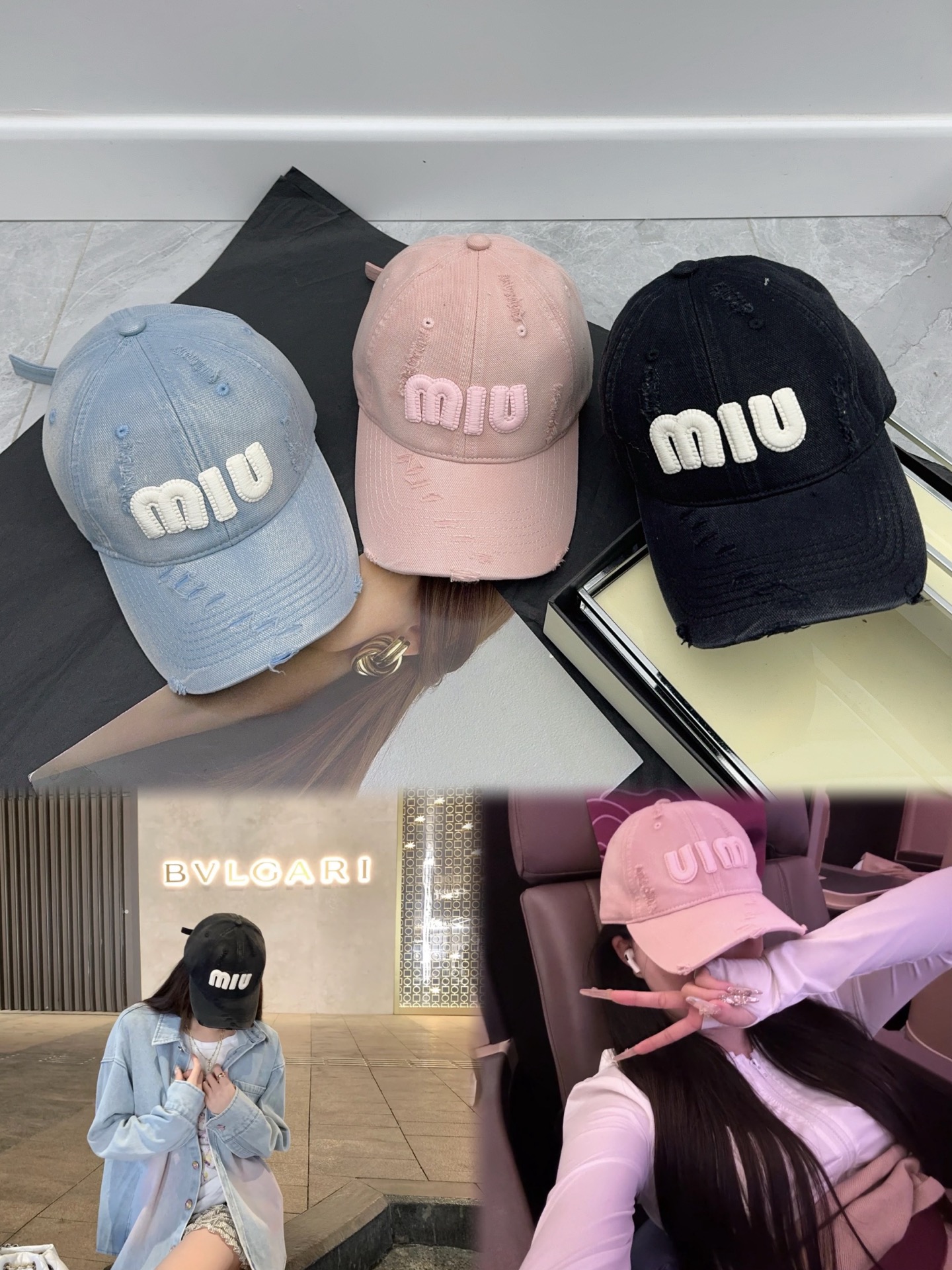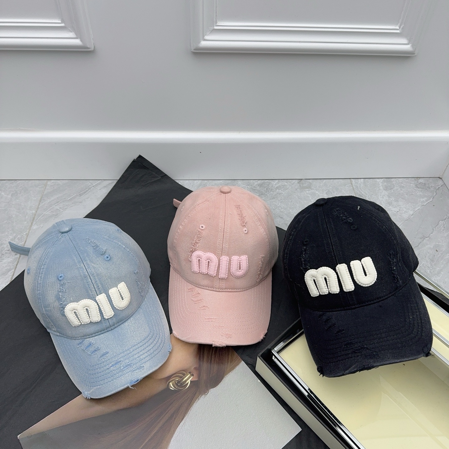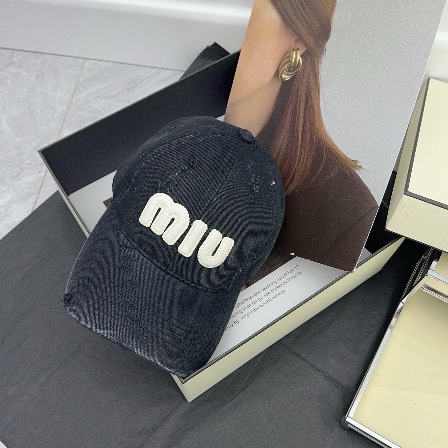 这款帽子是AAAAA 1:1 质量 (非常棒). 使用了和原版一模一样的材料. 商标部分也保持了和缪缪/Miu Miu一样. 图片拍摄是实物帽子拍摄, 您所收到的实物保证和我们图片一模一样.