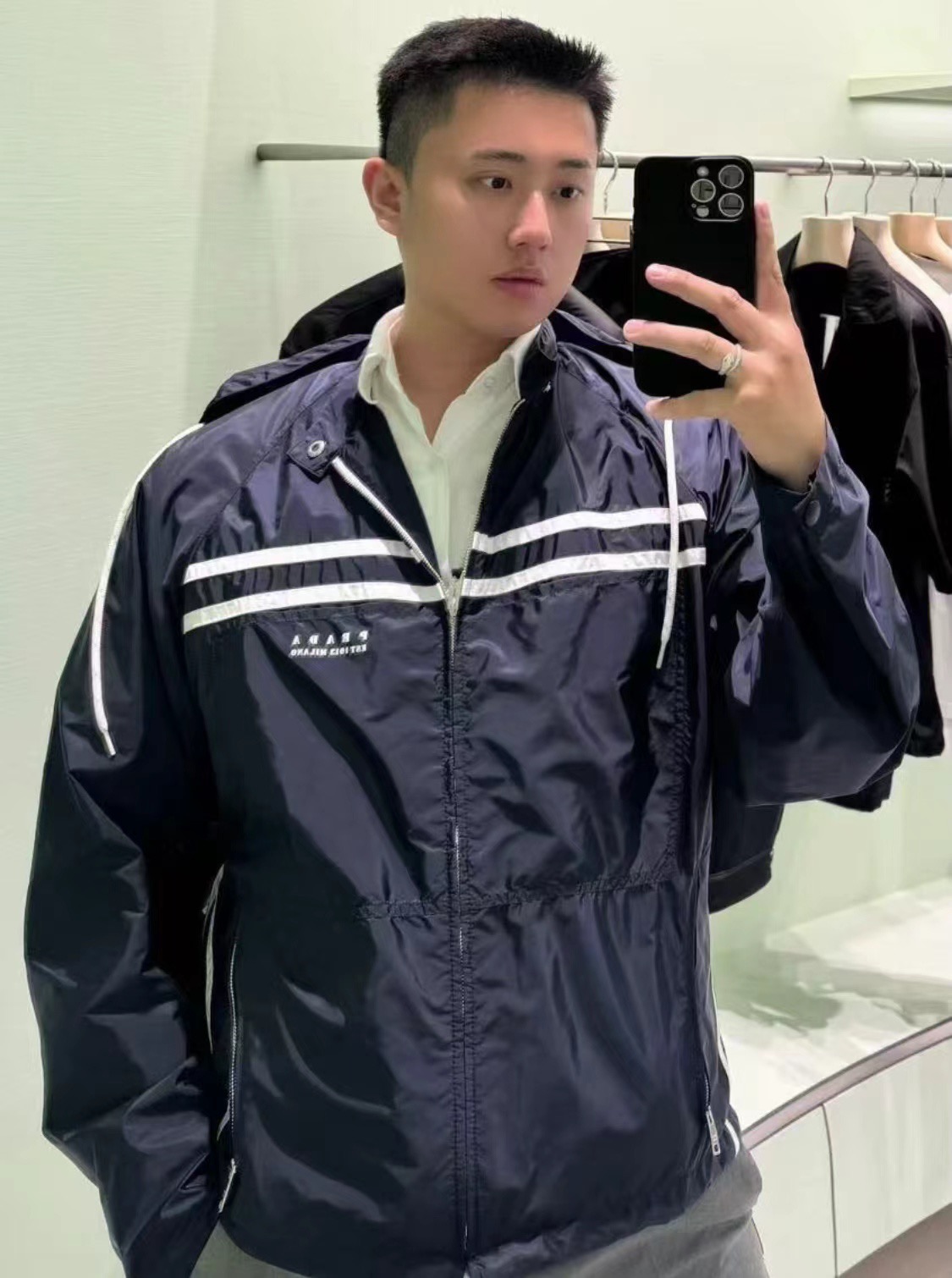 这款衣服是AAAAA 1:1 质量 (非常棒). 使用了和原版一模一样的材料. 商标部分也保持了和普拉达/Prada一样. 图片拍摄是实物衣服拍摄, 您所收到的实物保证和我们图片一模一样.