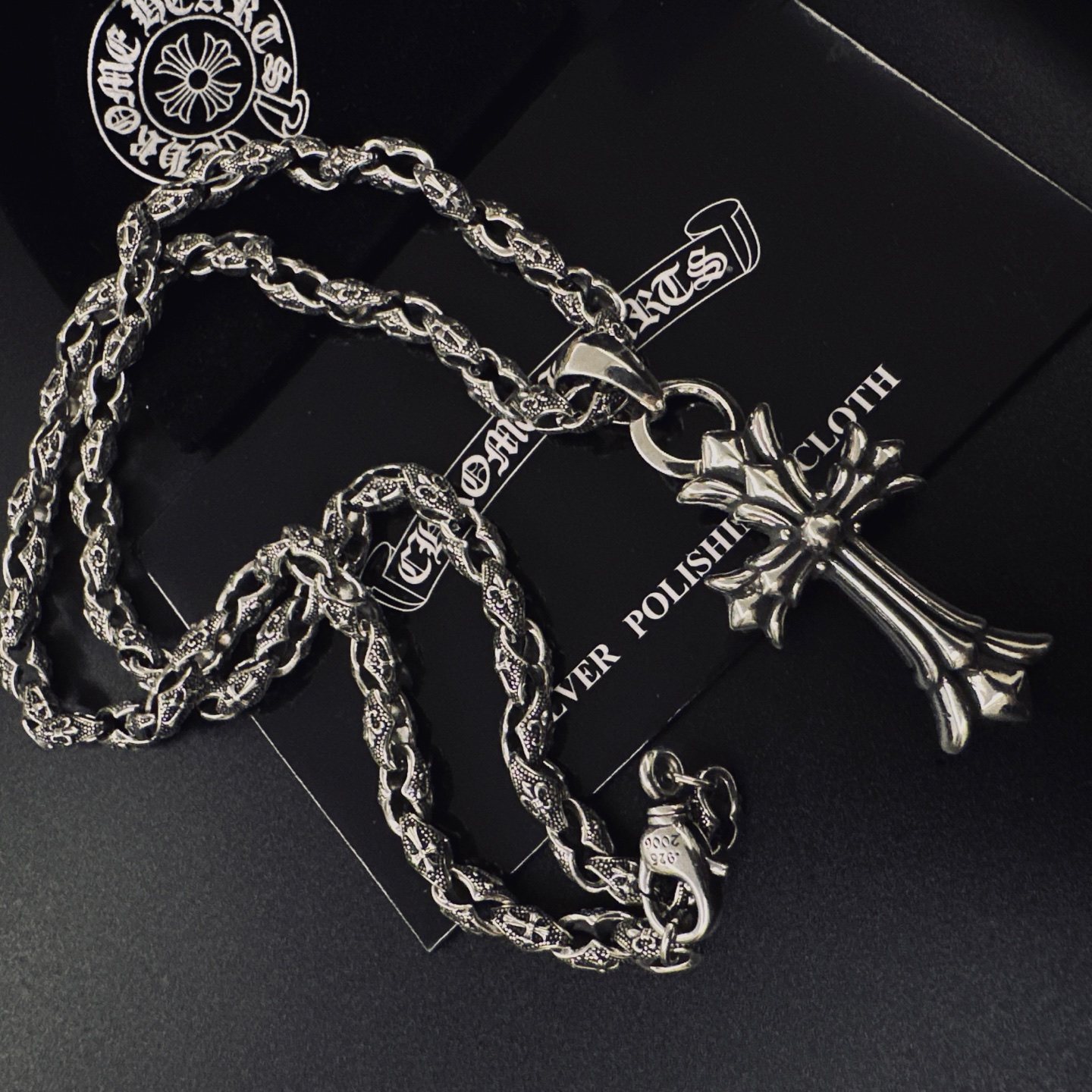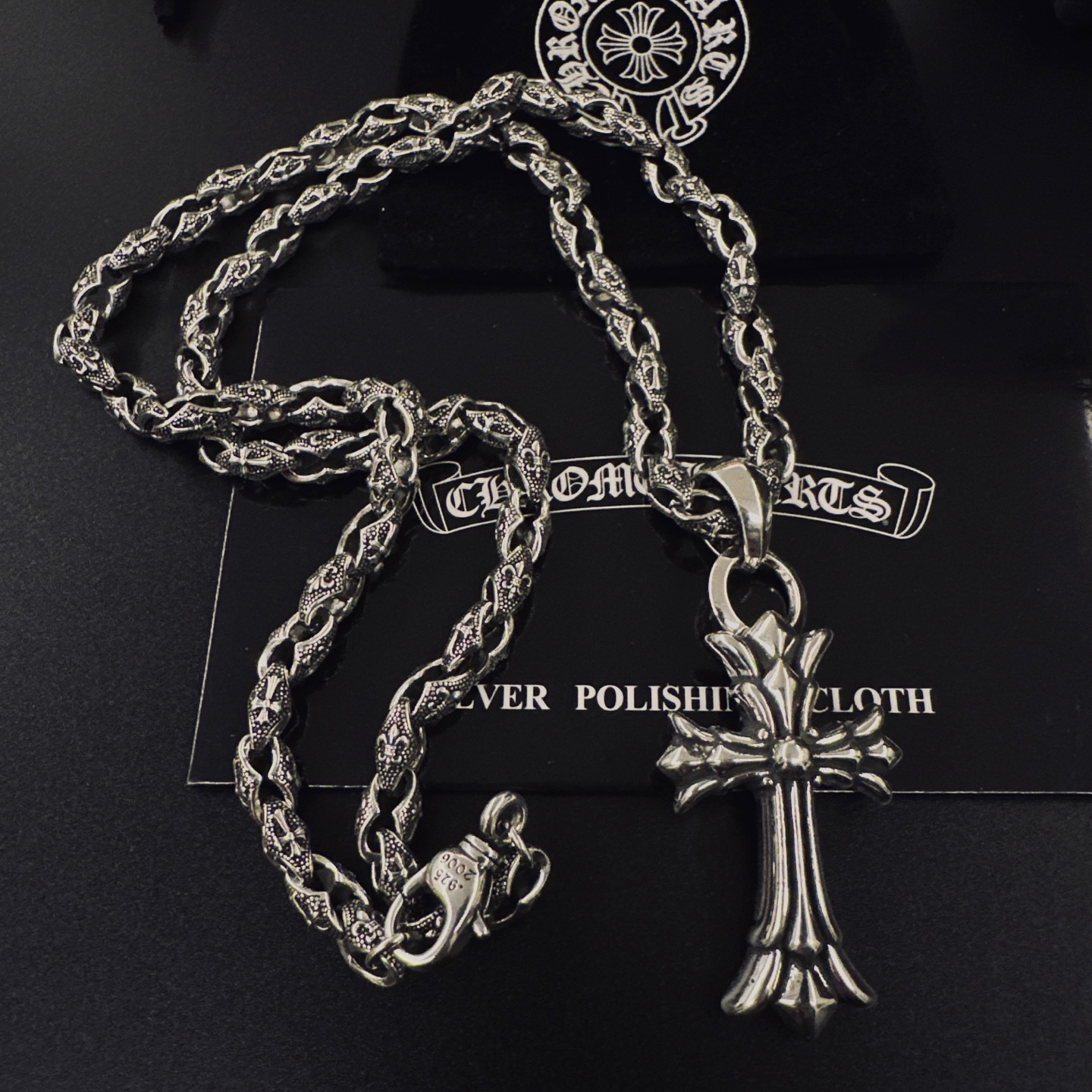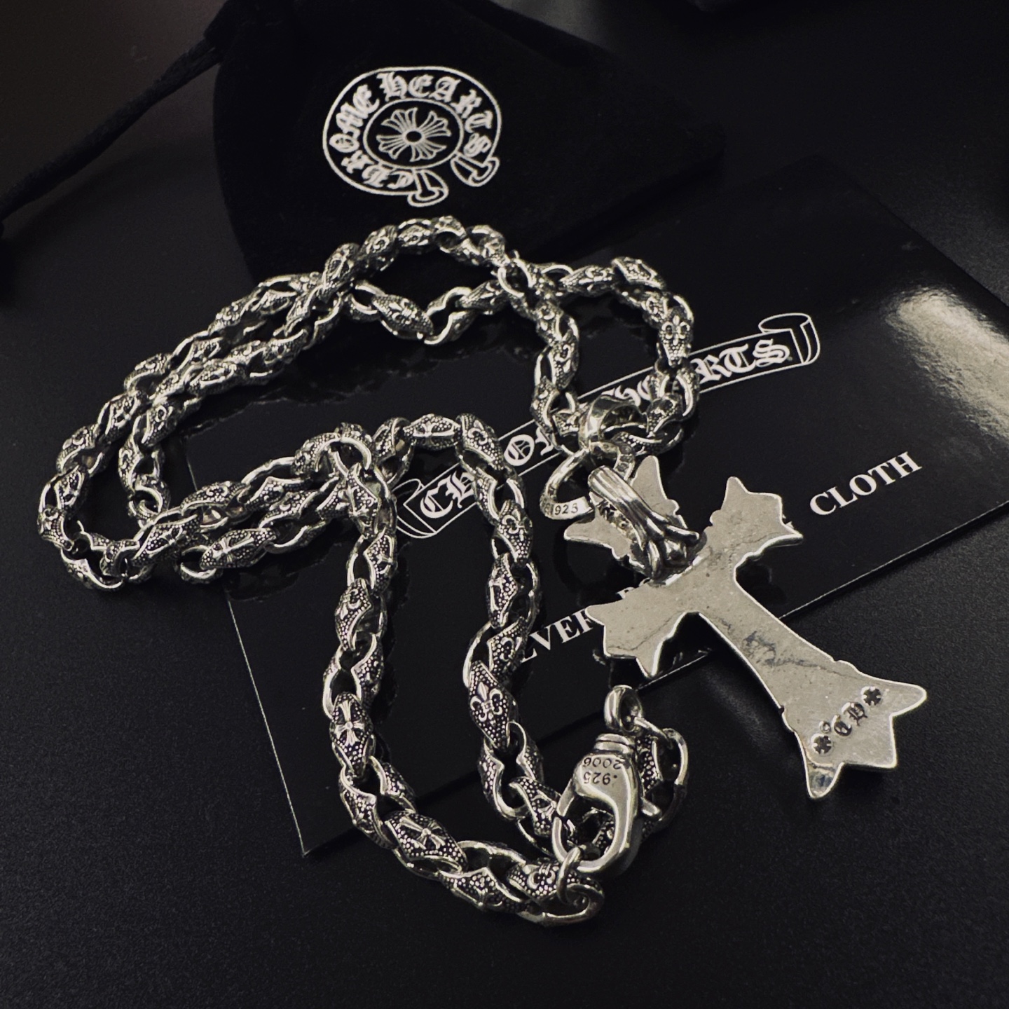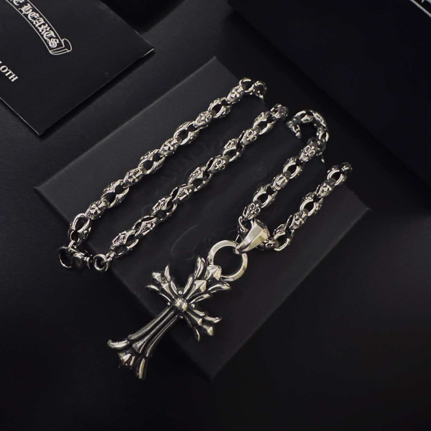 这款首饰是AAAAA 1:1 质量 (非常棒). 使用了和原版一模一样的材料. 商标部分也保持了和克罗心/Chrome Hearts一样. 图片拍摄是实物首饰拍摄, 您所收到的实物保证和我们图片一模一样.