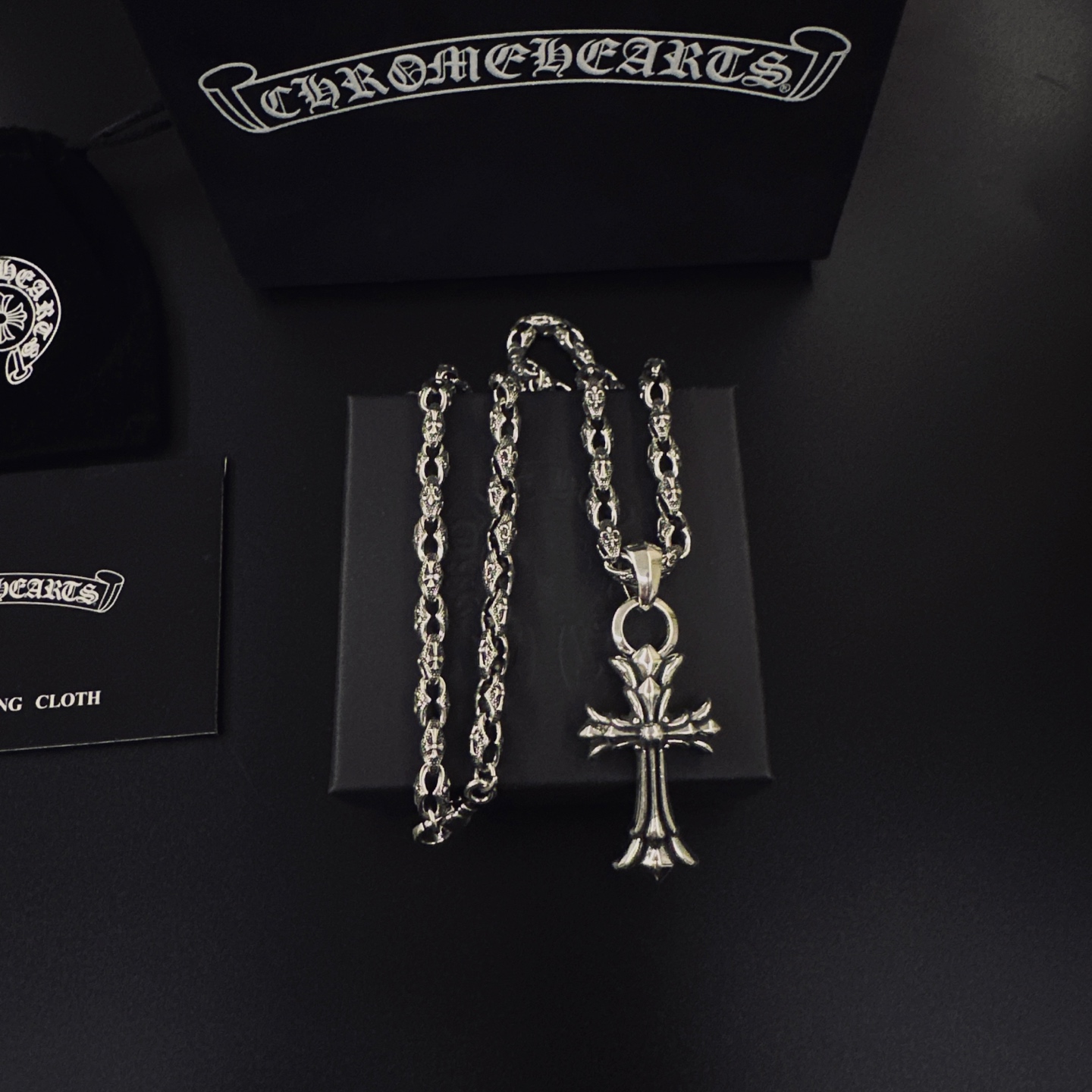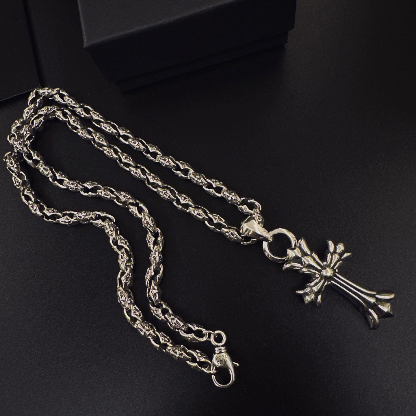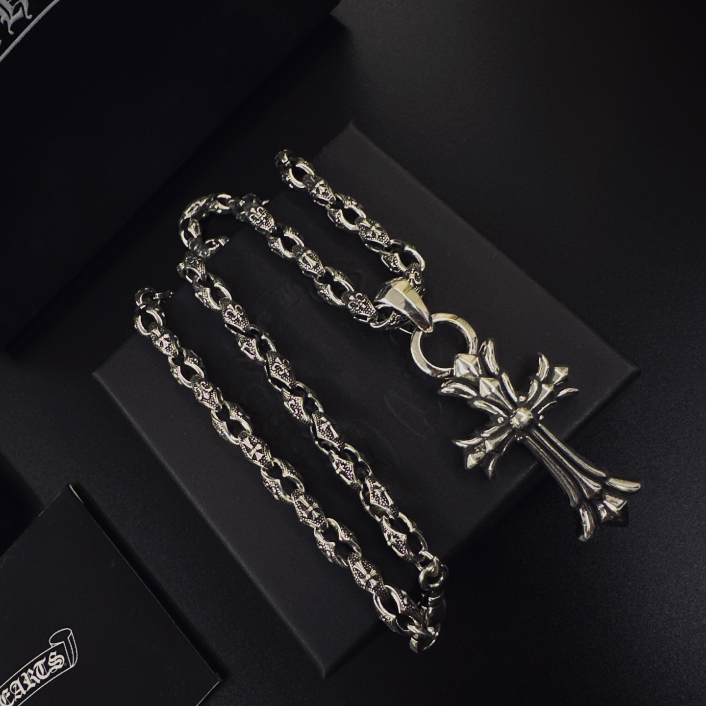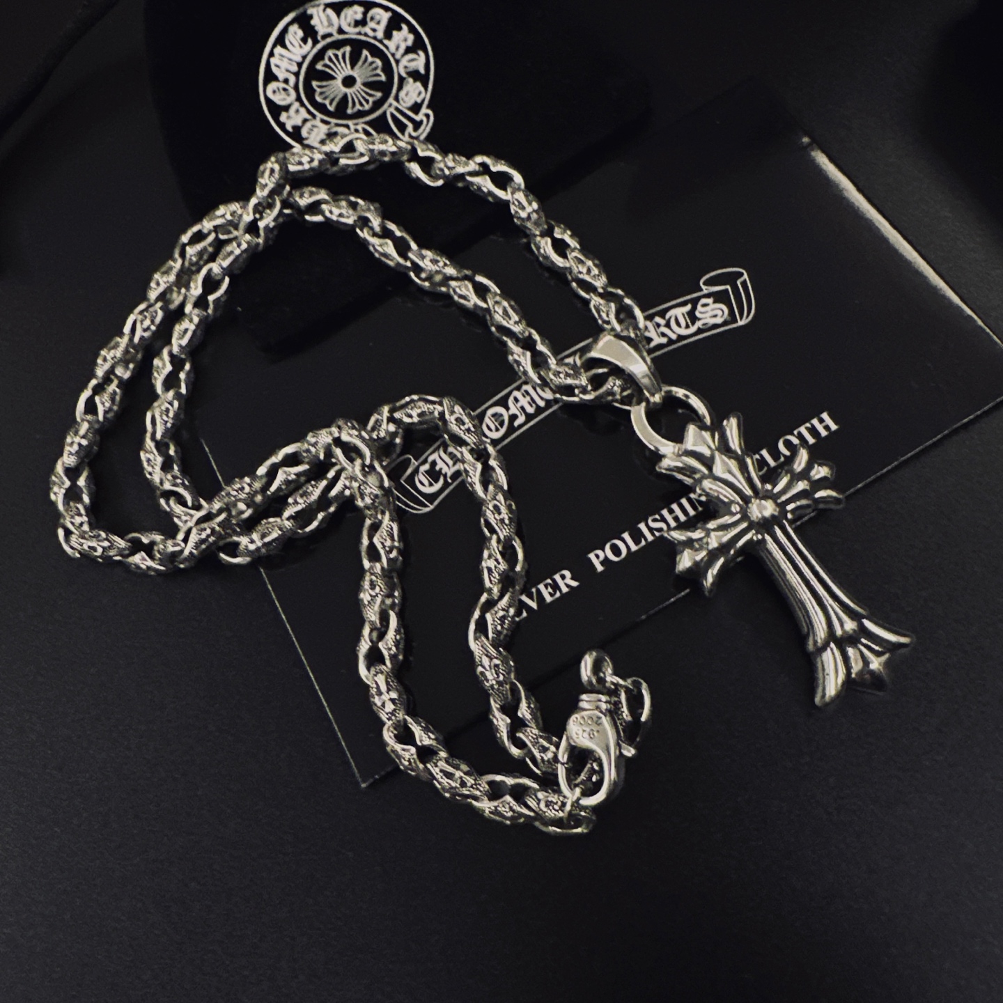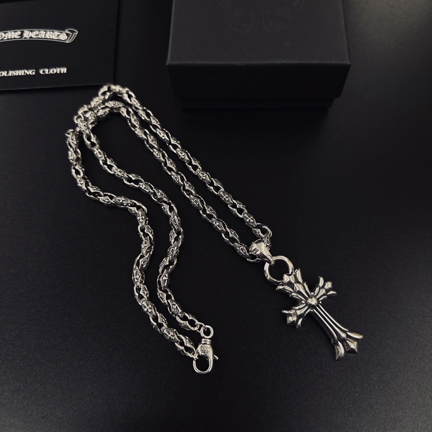 这款首饰是AAAAA 1:1 质量 (非常棒). 使用了和原版一模一样的材料. 商标部分也保持了和克罗心/Chrome Hearts一样. 图片拍摄是实物首饰拍摄, 您所收到的实物保证和我们图片一模一样.