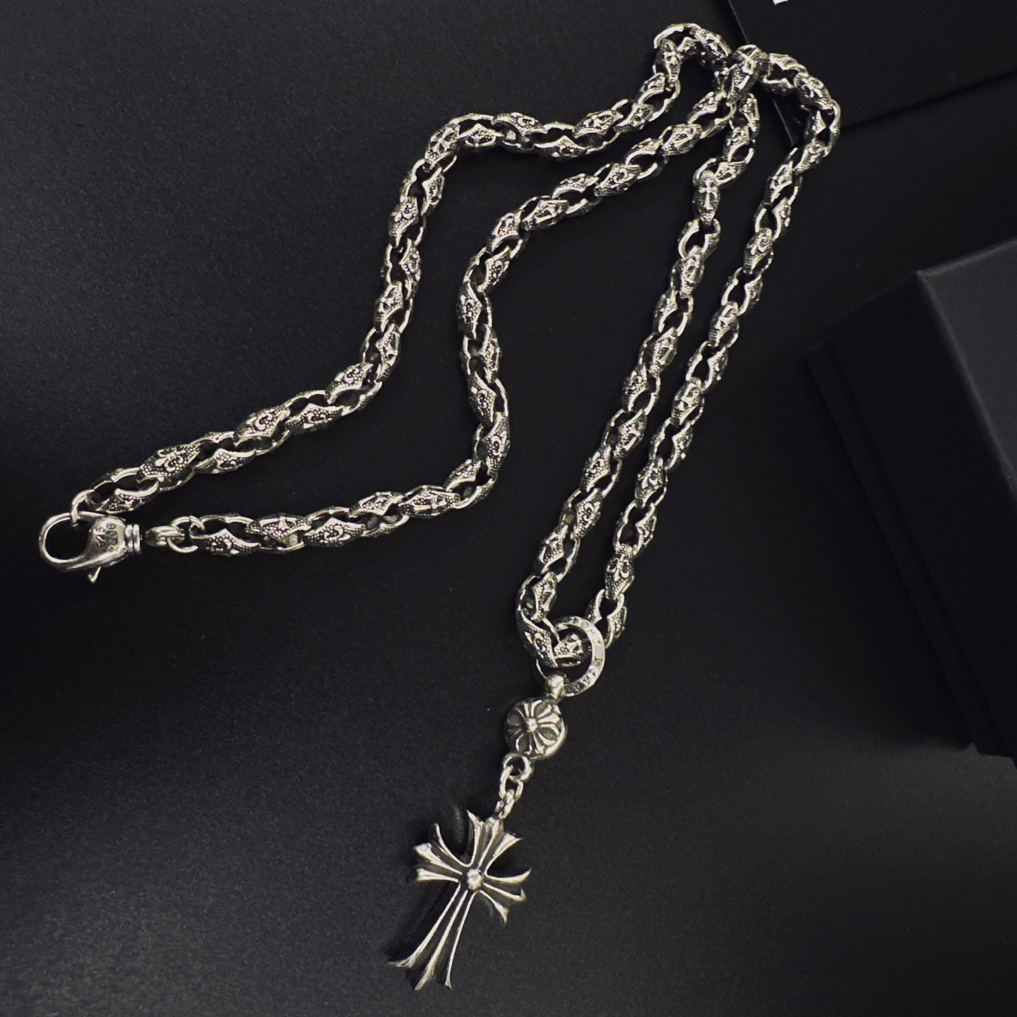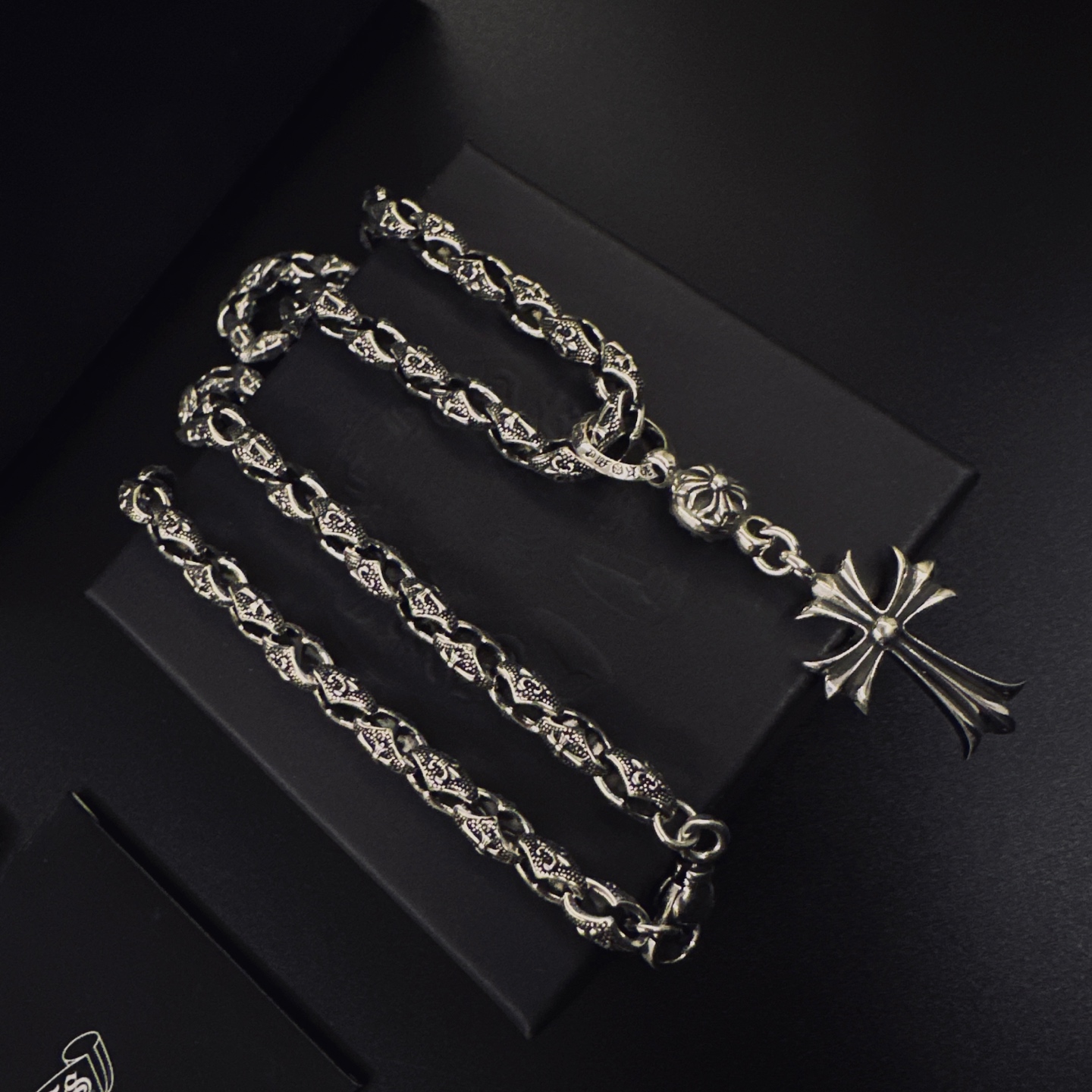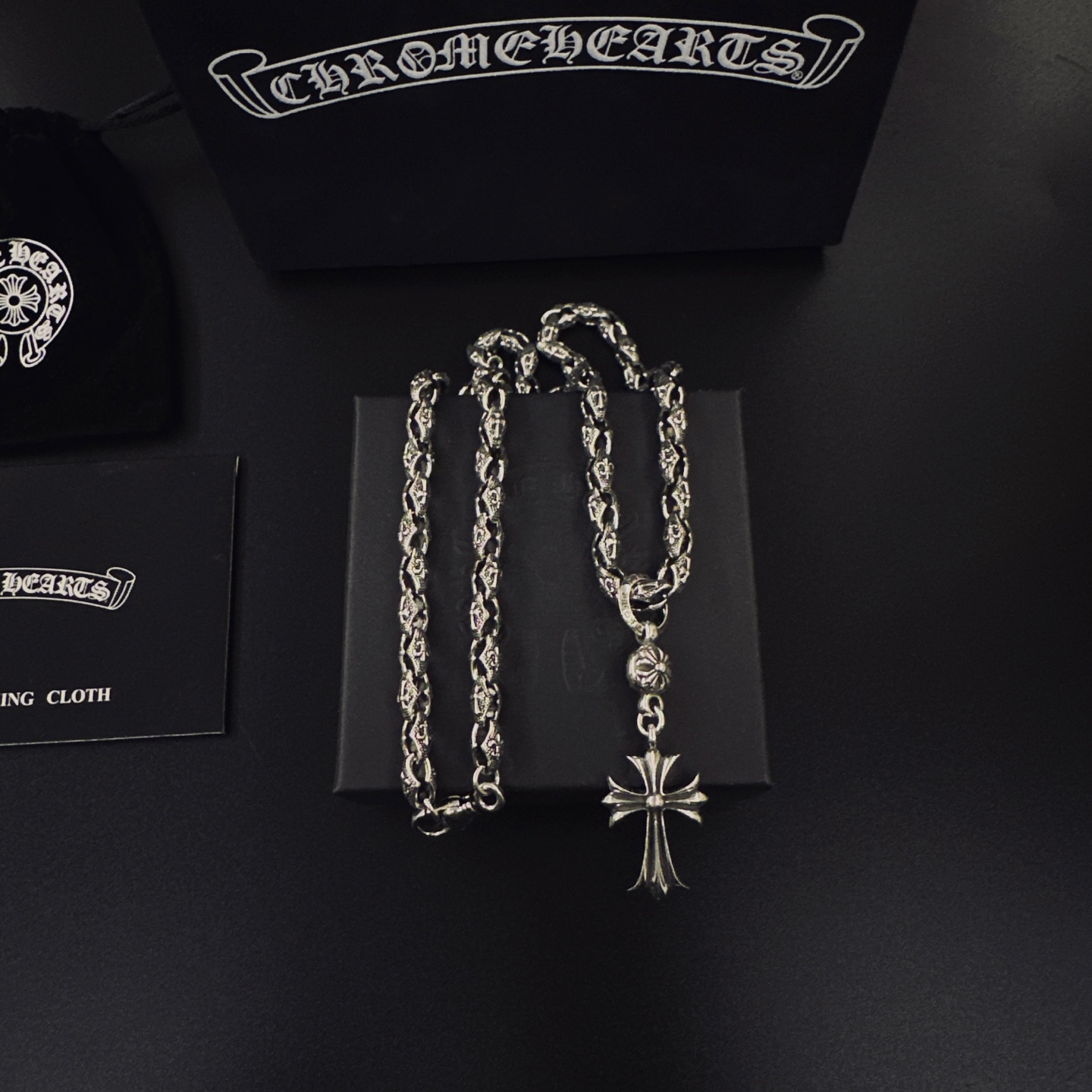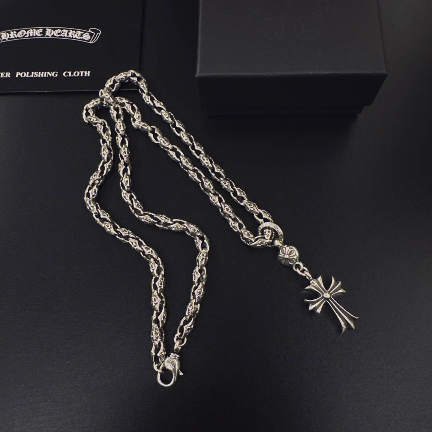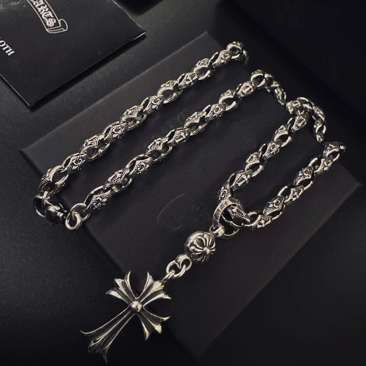 这款首饰是AAAAA 1:1 质量 (非常棒). 使用了和原版一模一样的材料. 商标部分也保持了和克罗心/Chrome Hearts一样. 图片拍摄是实物首饰拍摄, 您所收到的实物保证和我们图片一模一样.