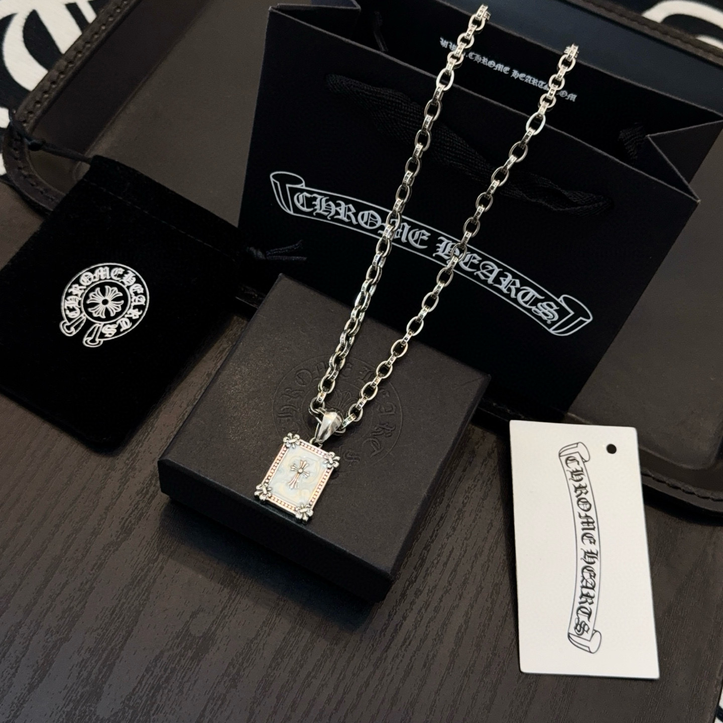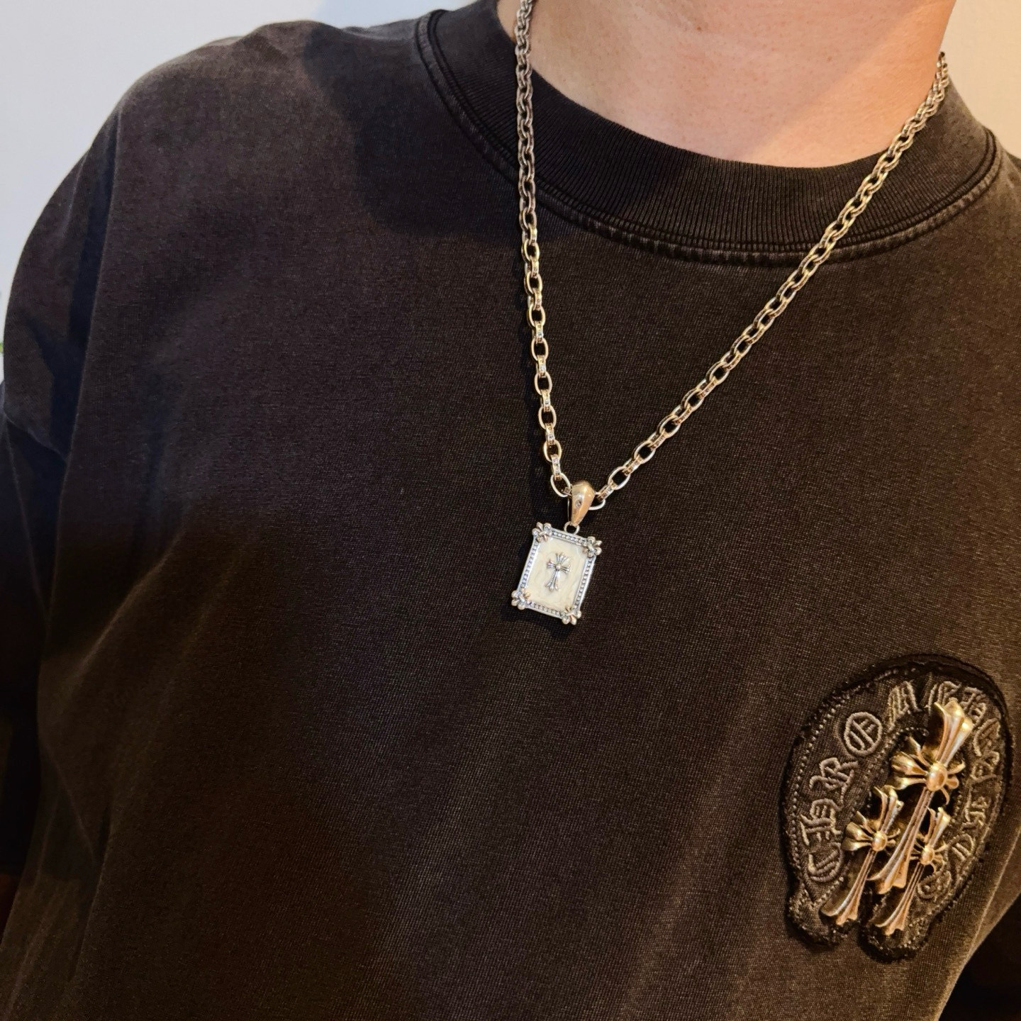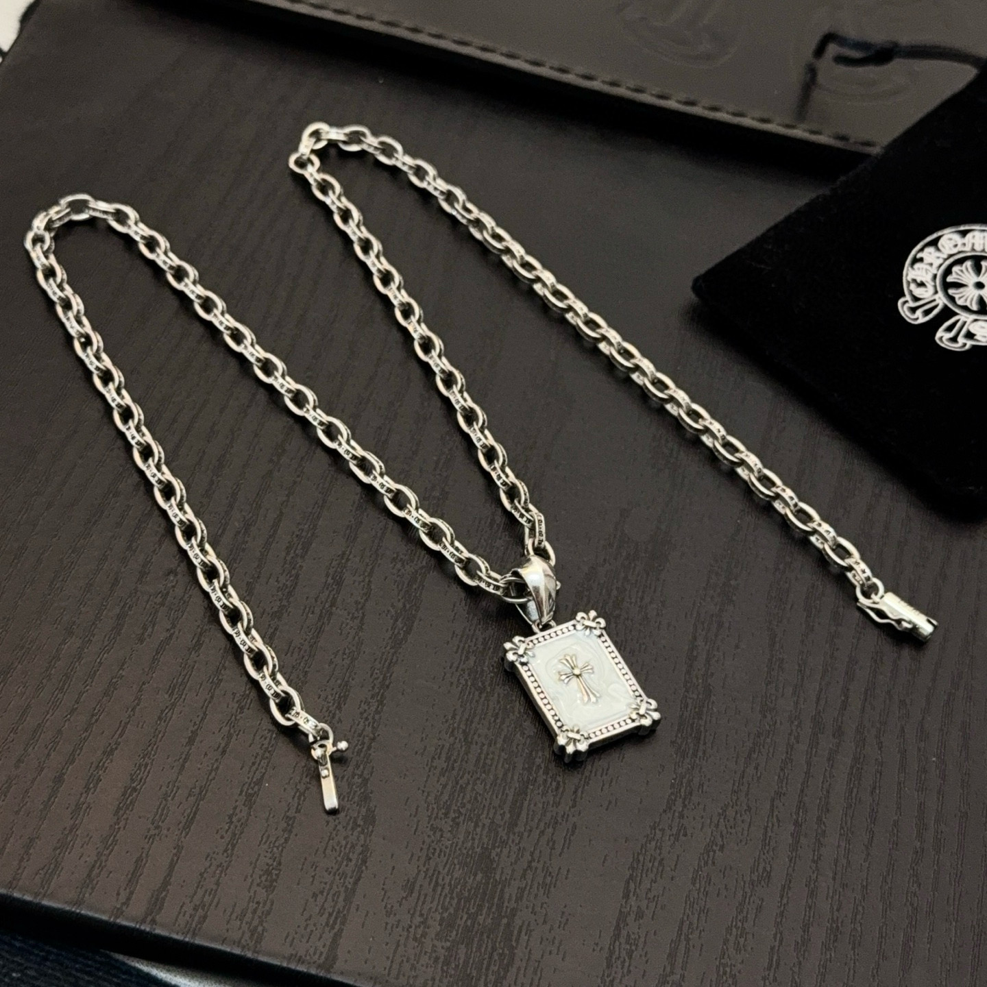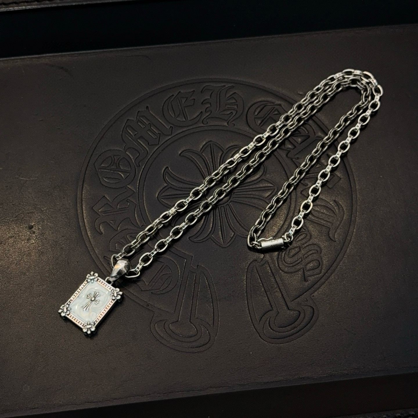 这款首饰是AAAAA 1:1 质量 (非常棒). 使用了和原版一模一样的材料. 商标部分也保持了和克罗心/Chrome Hearts一样. 图片拍摄是实物首饰拍摄, 您所收到的实物保证和我们图片一模一样.