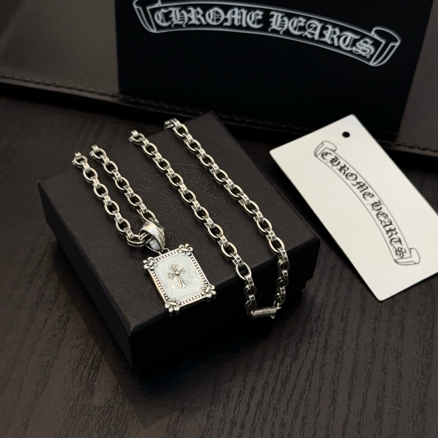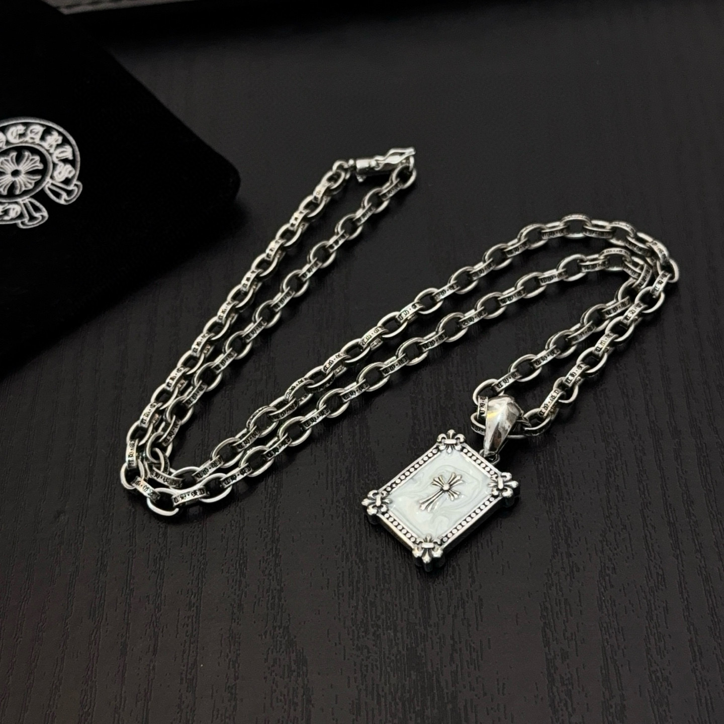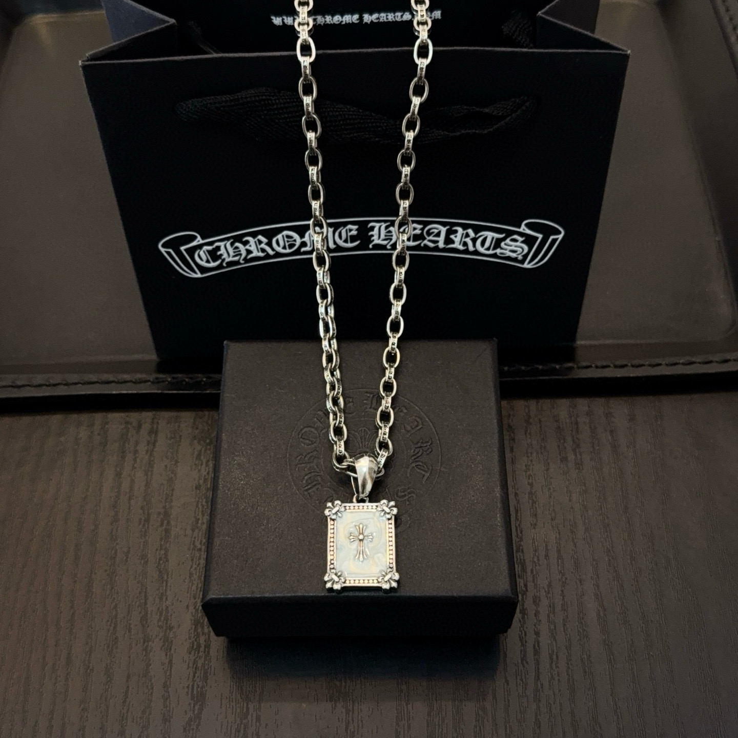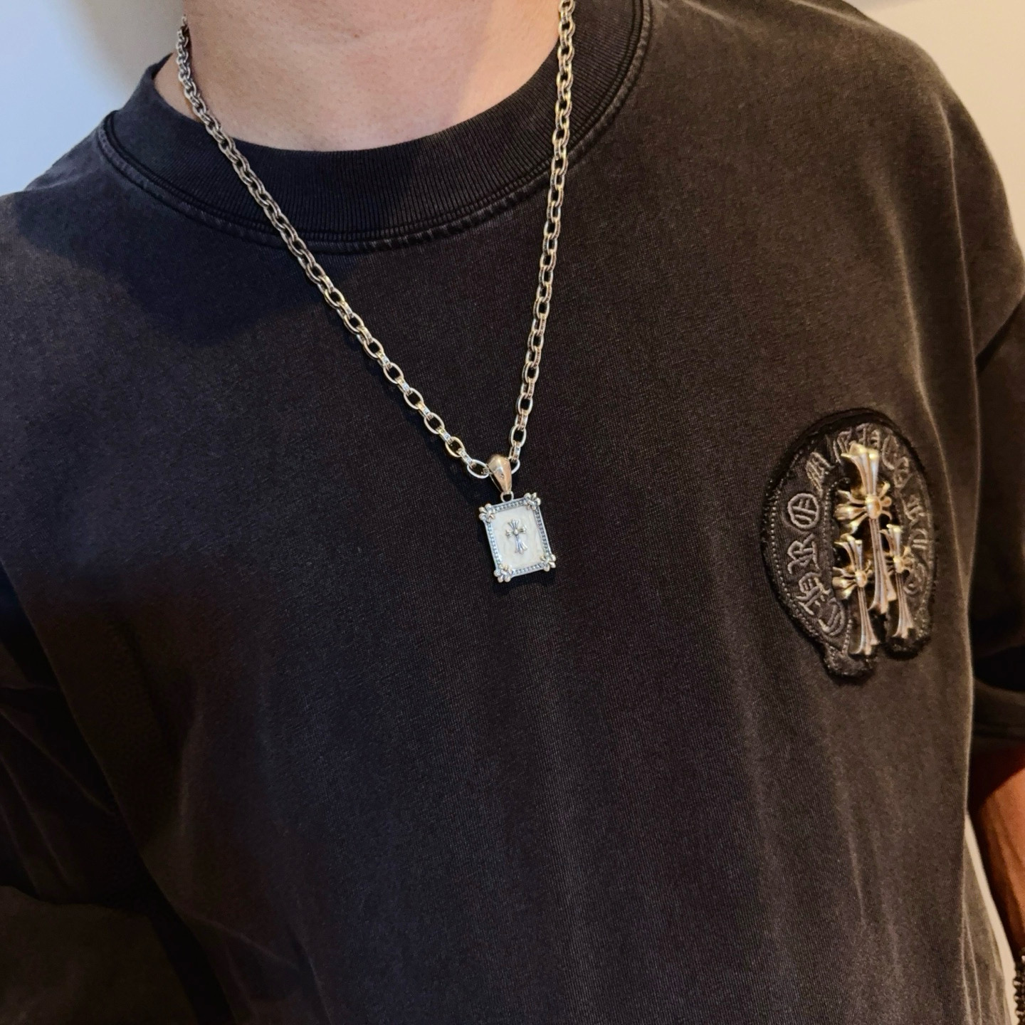 这款首饰是AAAAA 1:1 质量 (非常棒). 使用了和原版一模一样的材料. 商标部分也保持了和克罗心/Chrome Hearts一样. 图片拍摄是实物首饰拍摄, 您所收到的实物保证和我们图片一模一样.