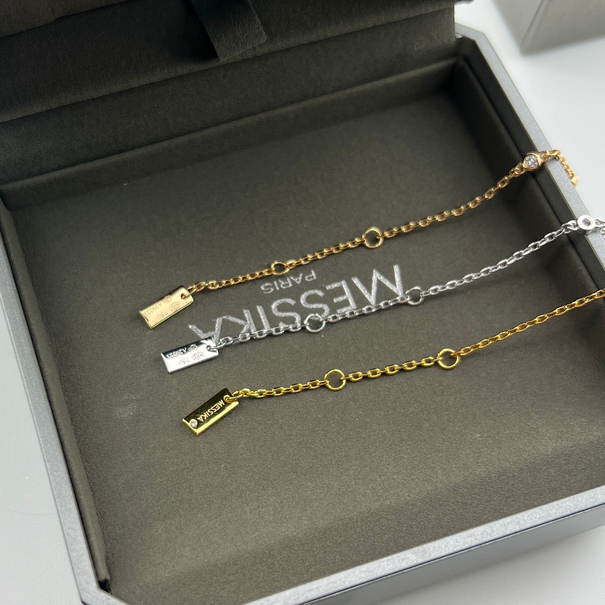 这款首饰是AAAAA 1:1 质量 (非常棒). 使用了和原版一模一样的材料. 商标部分也保持了和梅西卡/Messika一样. 图片拍摄是实物首饰拍摄, 您所收到的实物保证和我们图片一模一样.