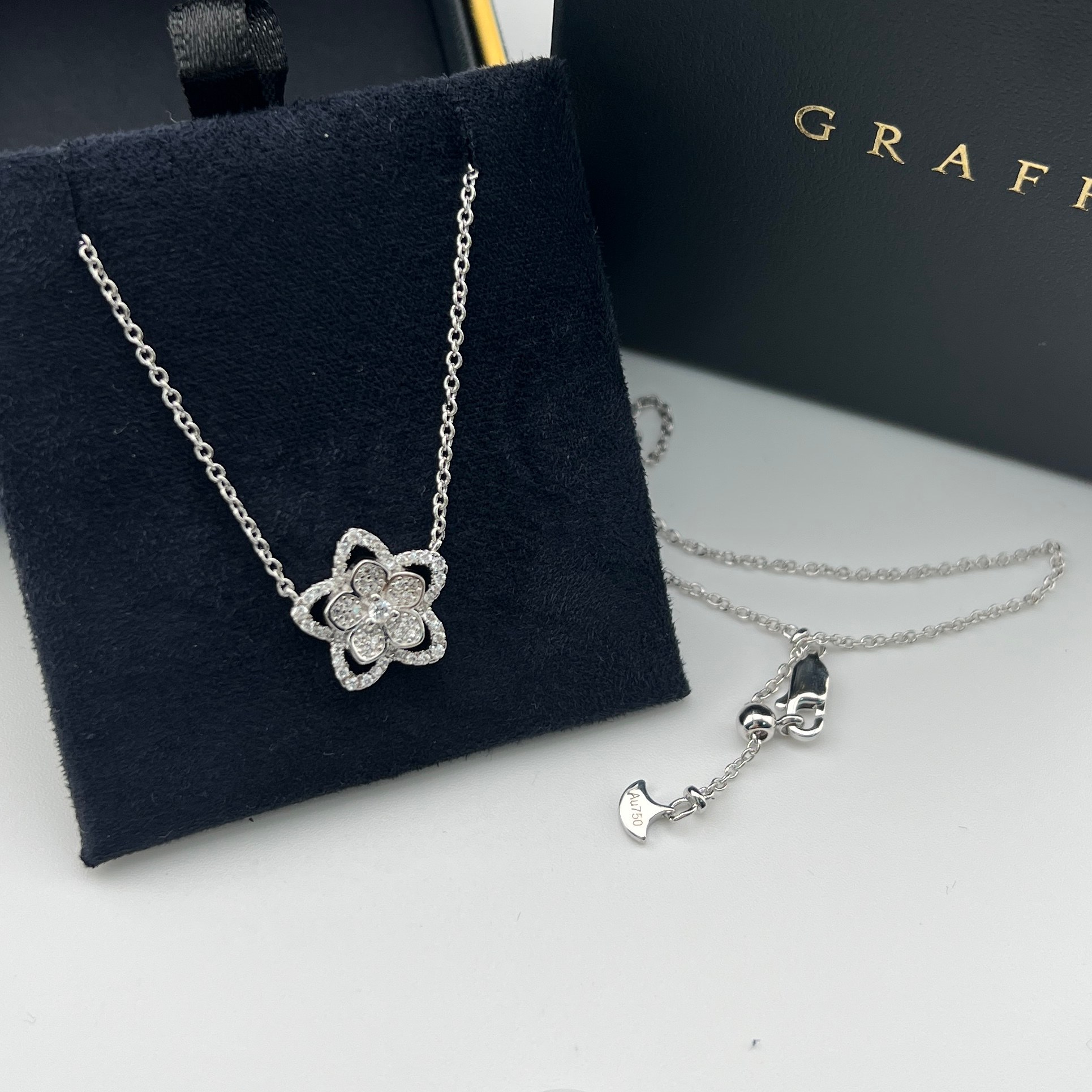 这款首饰是AAAAA 1:1 质量 (非常棒). 使用了和原版一模一样的材料. 商标部分也保持了和GRAFF一样. 图片拍摄是实物首饰拍摄, 您所收到的实物保证和我们图片一模一样.