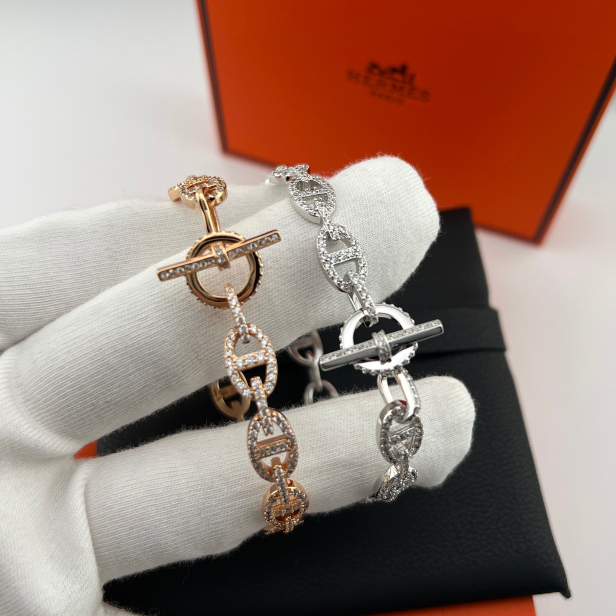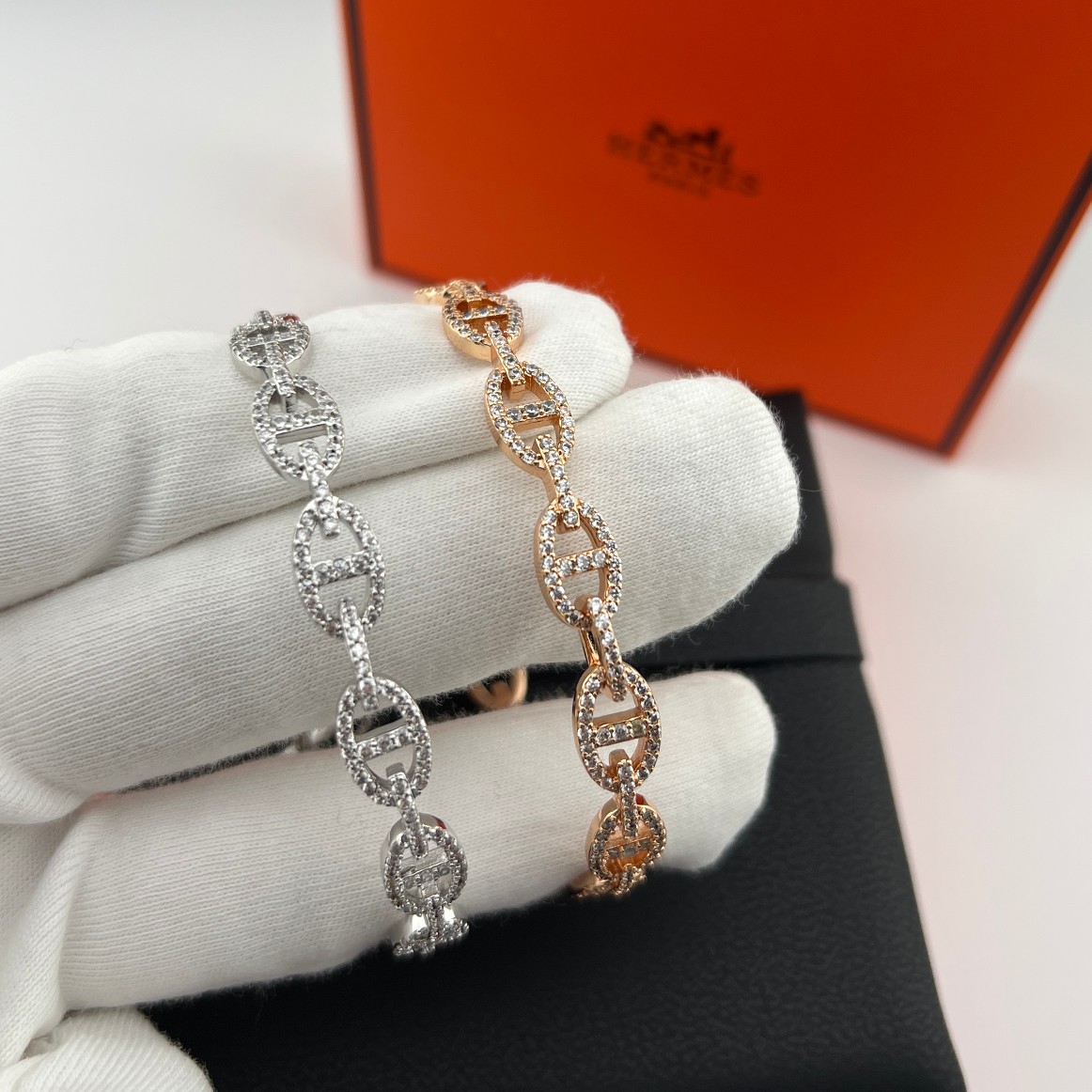 这款首饰是AAAAA 1:1 质量 (非常棒). 使用了和原版一模一样的材料. 商标部分也保持了和爱马仕/Hermes一样. 图片拍摄是实物首饰拍摄, 您所收到的实物保证和我们图片一模一样.