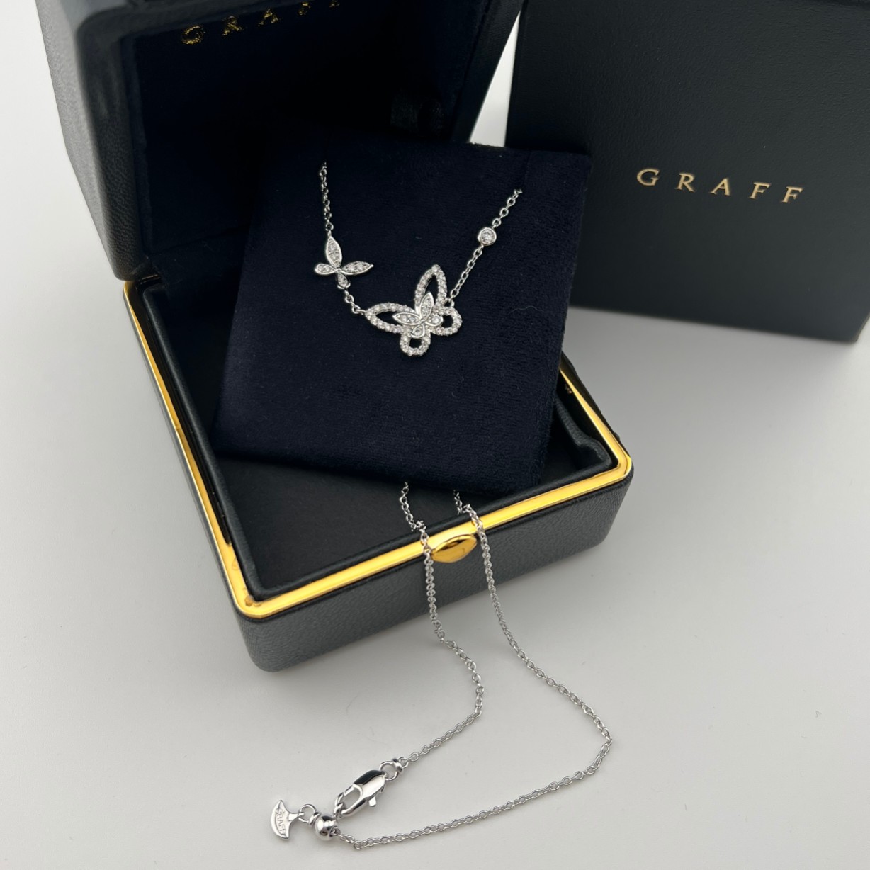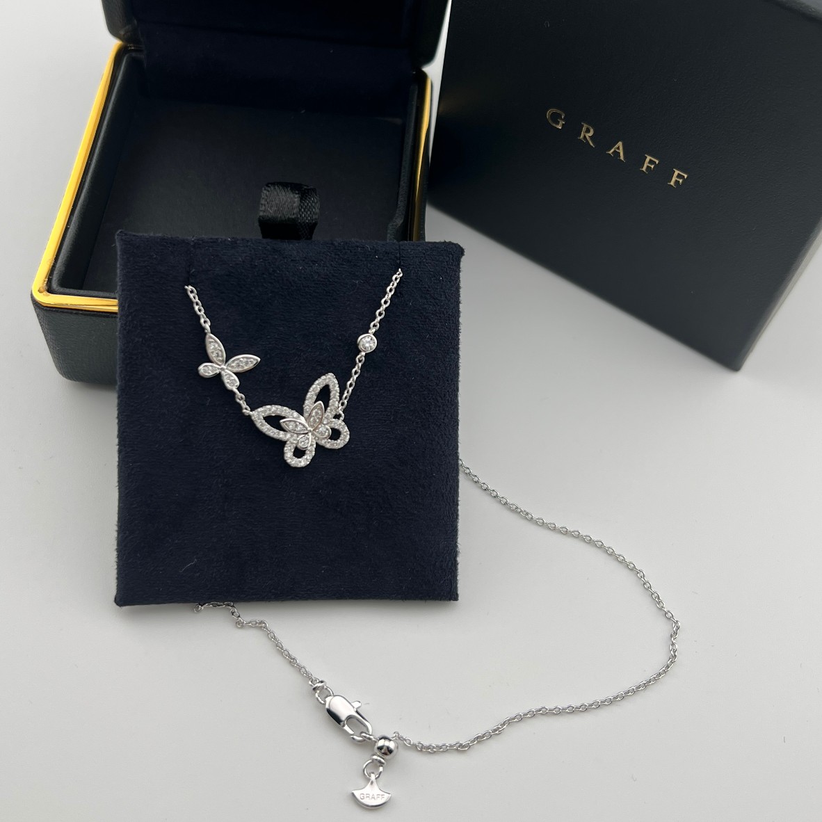 这款首饰是AAAAA 1:1 质量 (非常棒). 使用了和原版一模一样的材料. 商标部分也保持了和GRAFF一样. 图片拍摄是实物首饰拍摄, 您所收到的实物保证和我们图片一模一样.