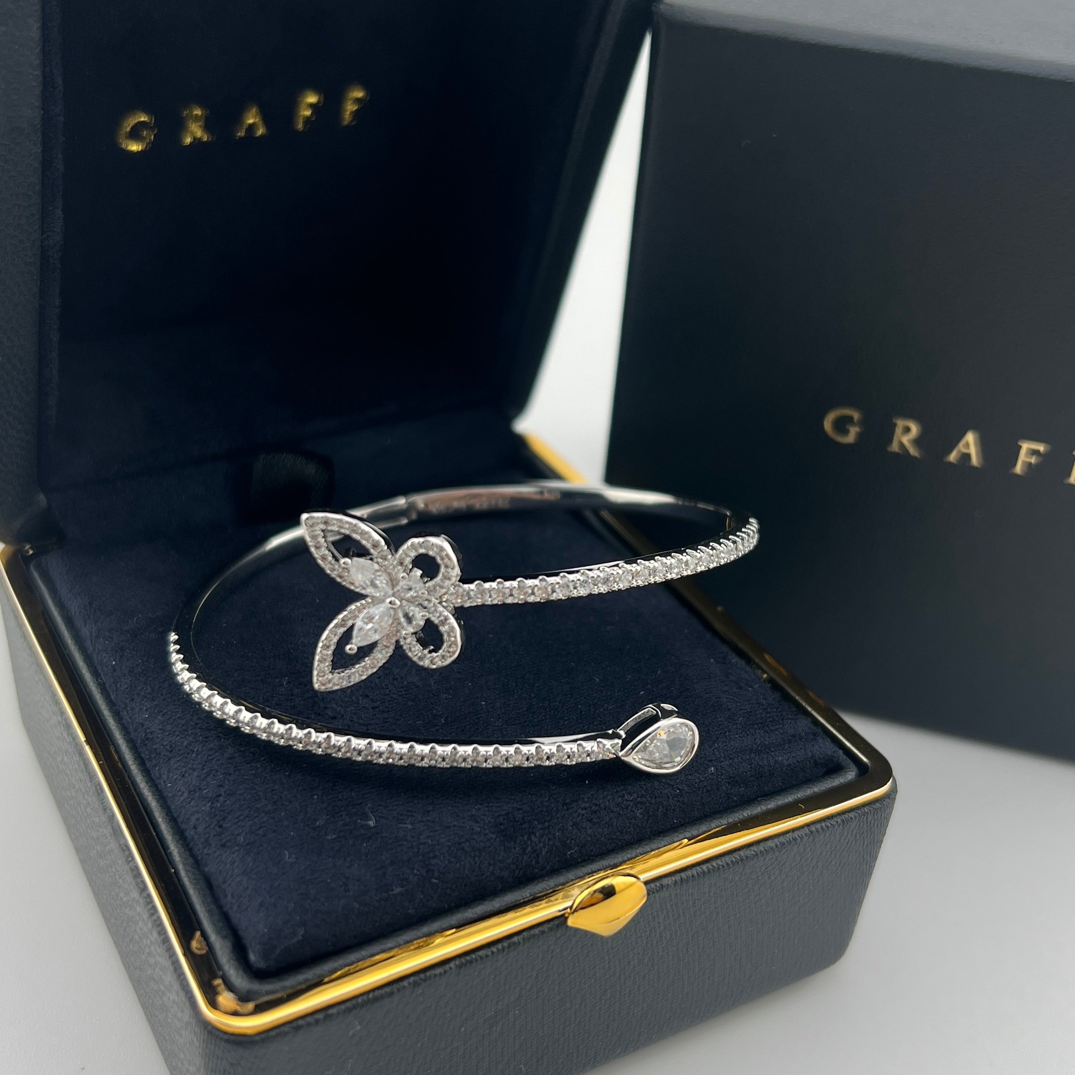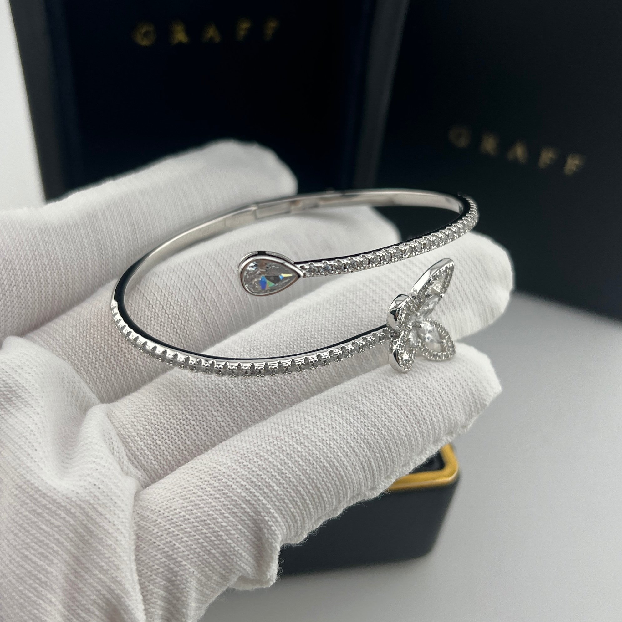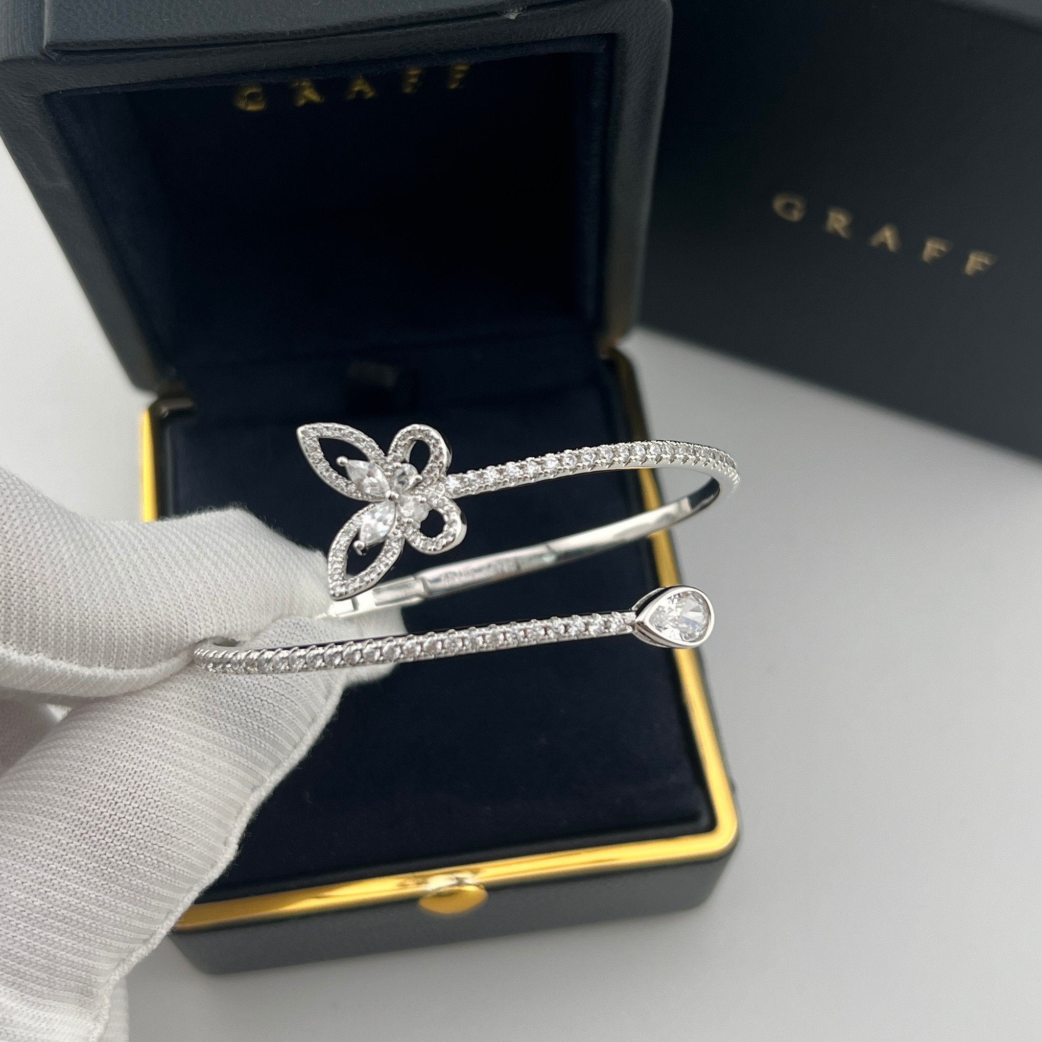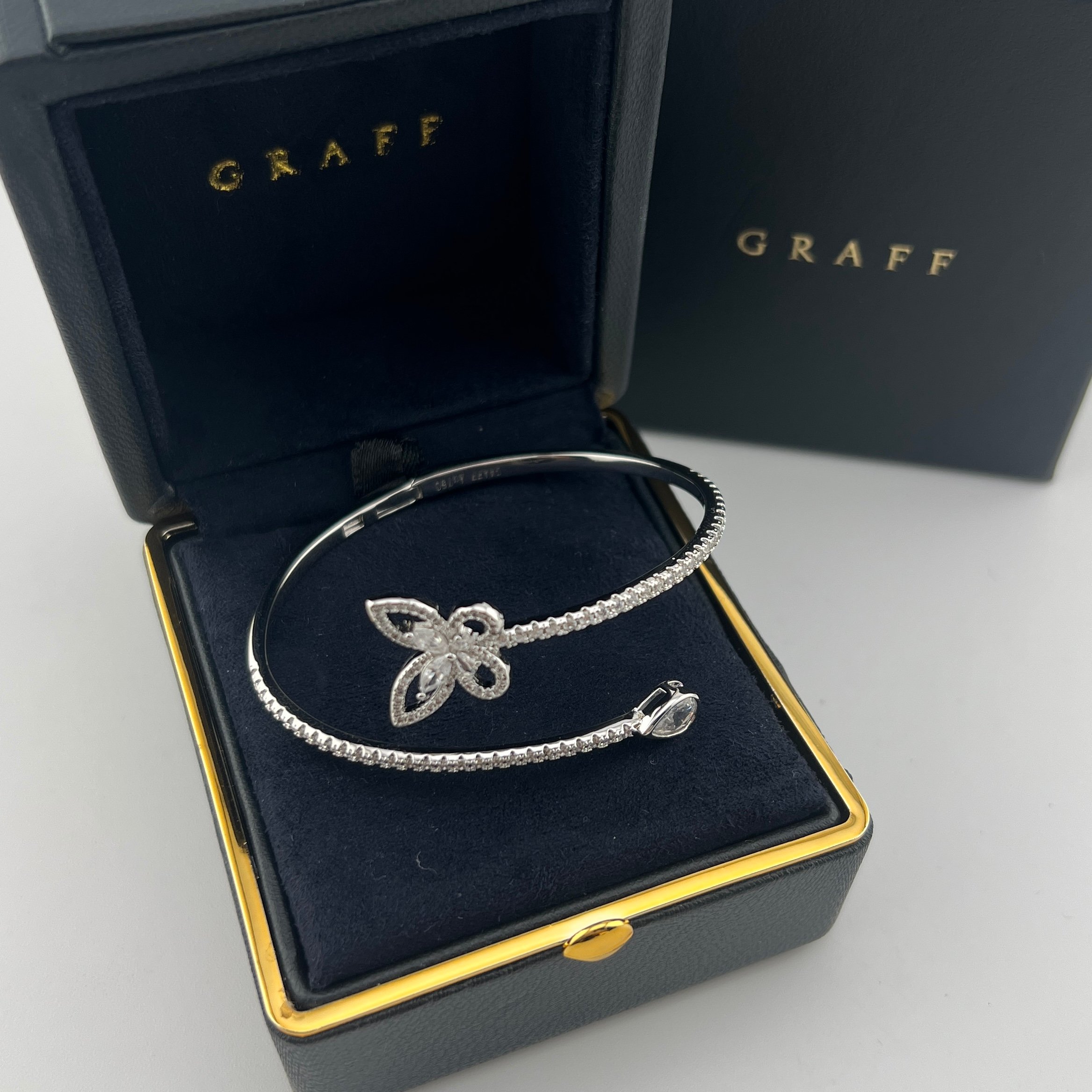 这款首饰是AAAAA 1:1 质量 (非常棒). 使用了和原版一模一样的材料. 商标部分也保持了和GRAFF一样. 图片拍摄是实物首饰拍摄, 您所收到的实物保证和我们图片一模一样.