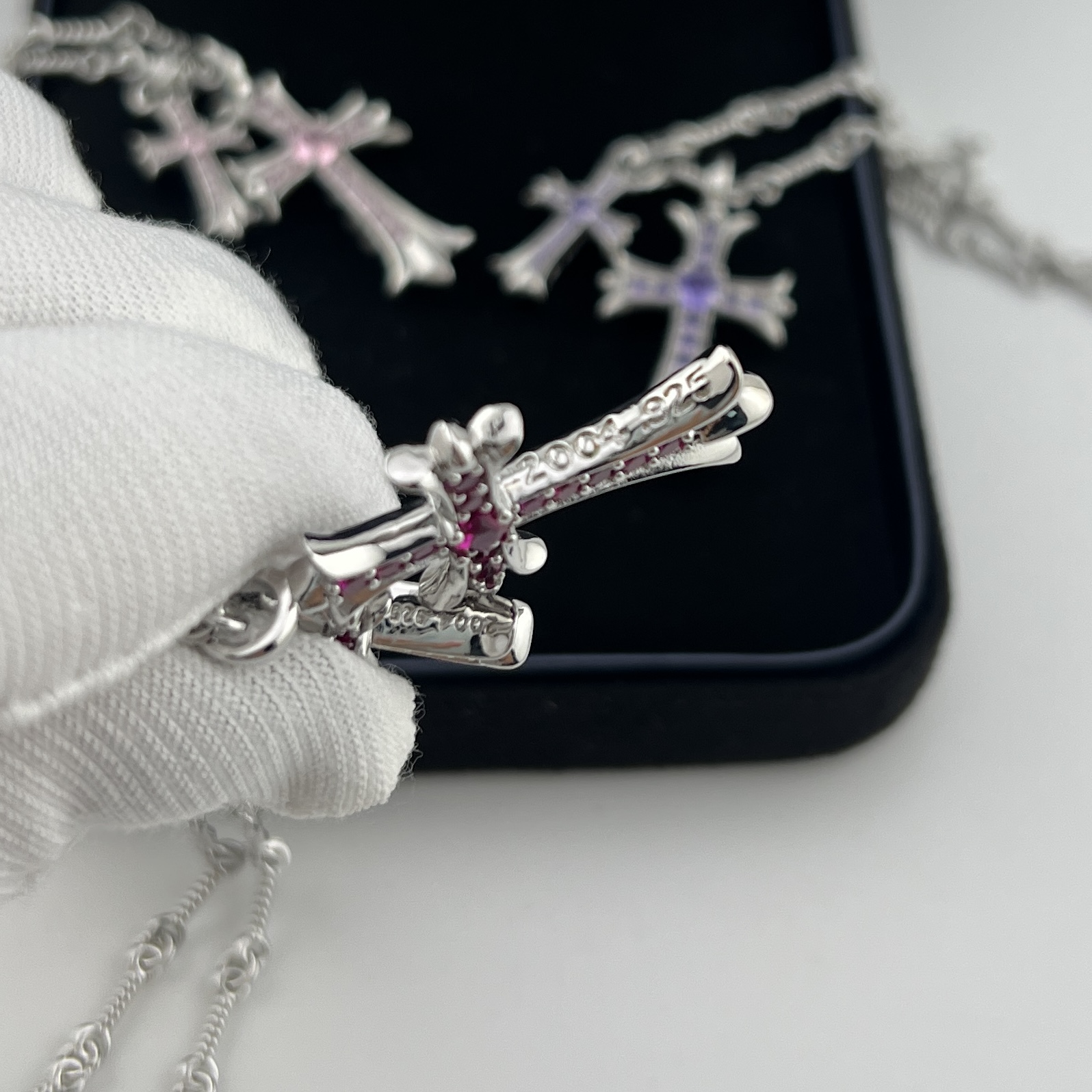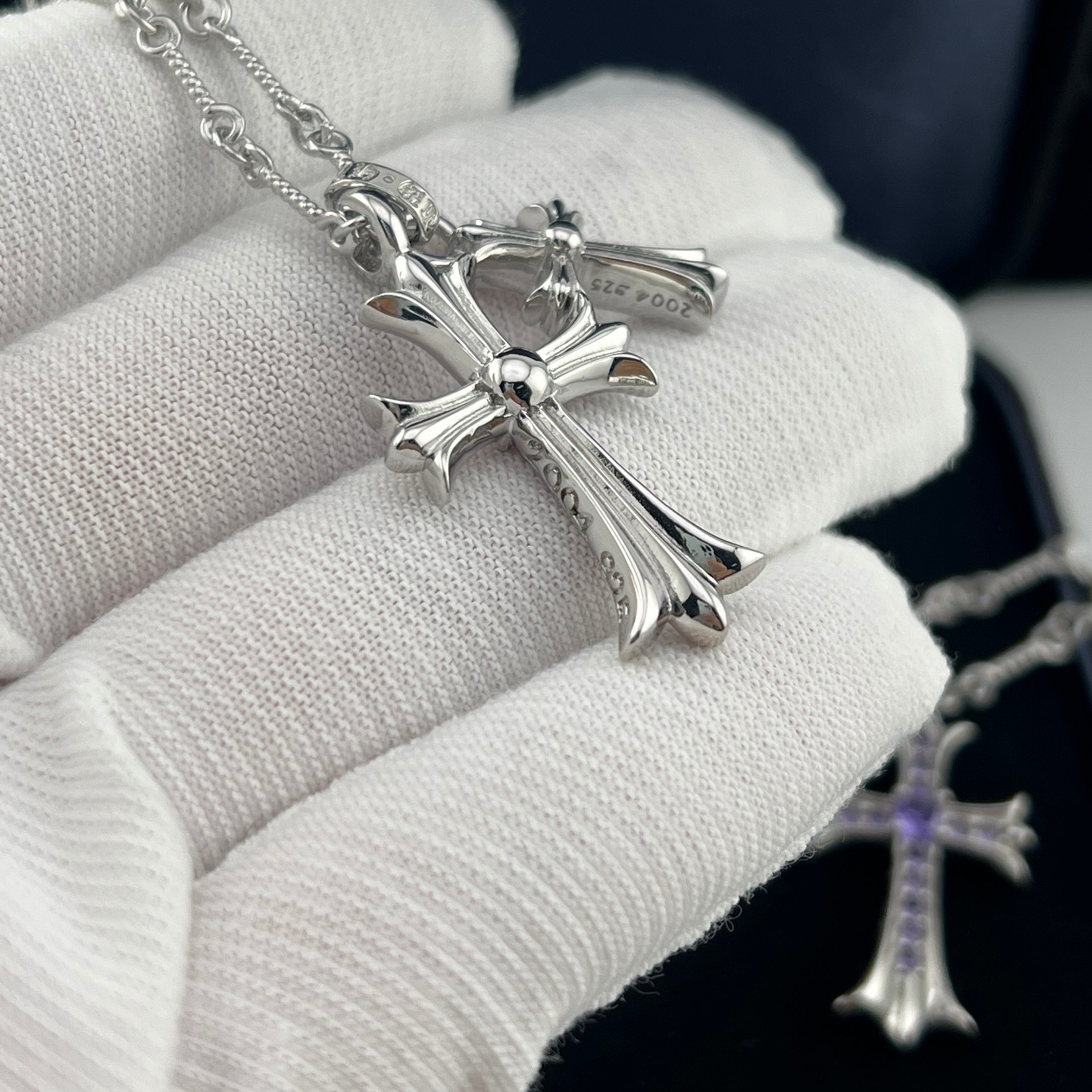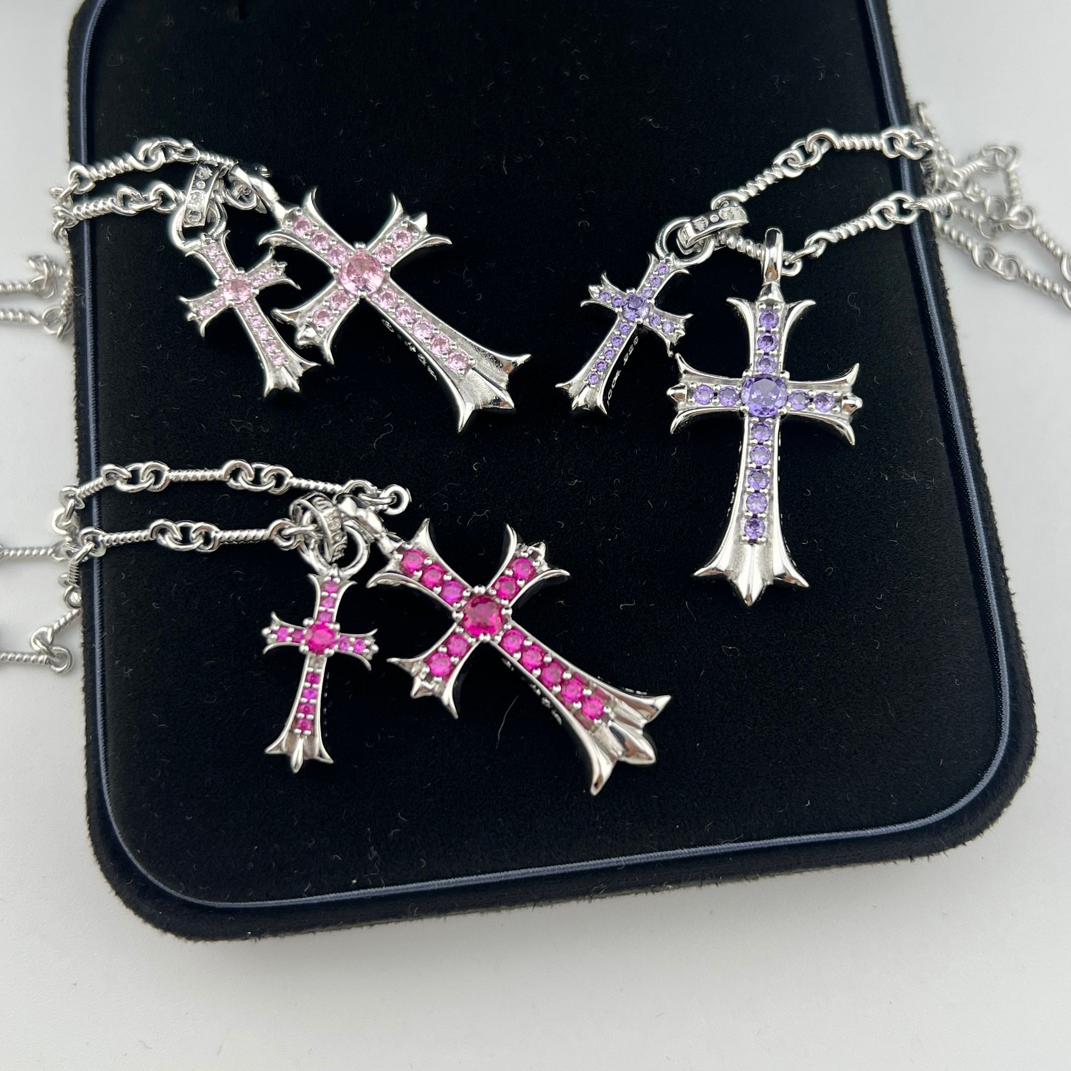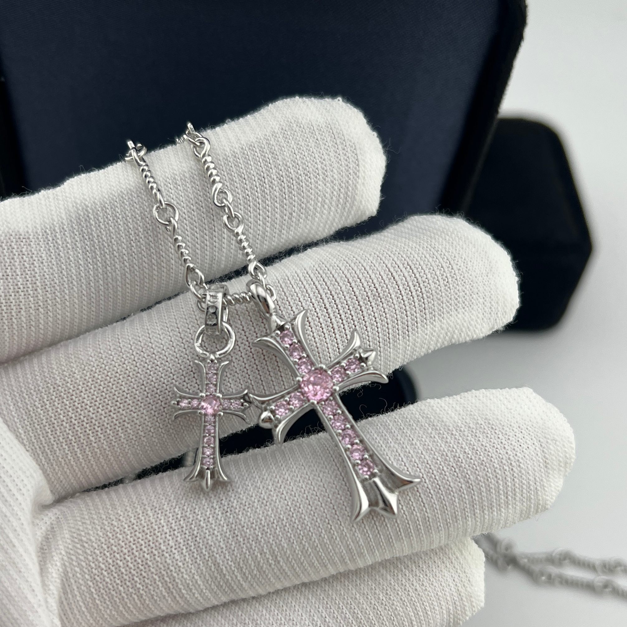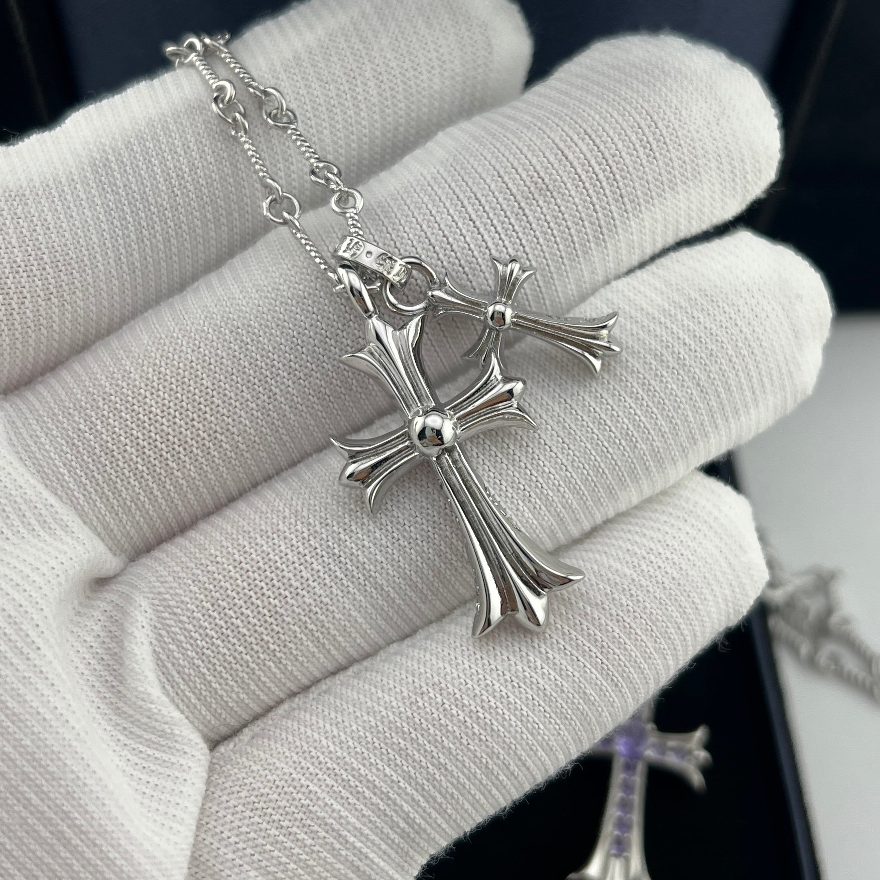 这款首饰是AAAAA 1:1 质量 (非常棒). 使用了和原版一模一样的材料. 商标部分也保持了和克罗心/Chrome Hearts一样. 图片拍摄是实物首饰拍摄, 您所收到的实物保证和我们图片一模一样.