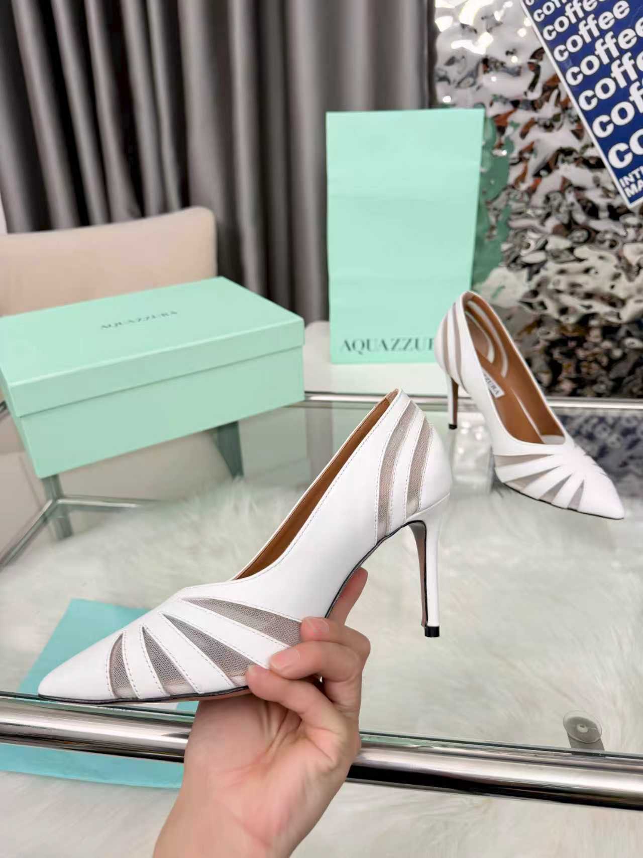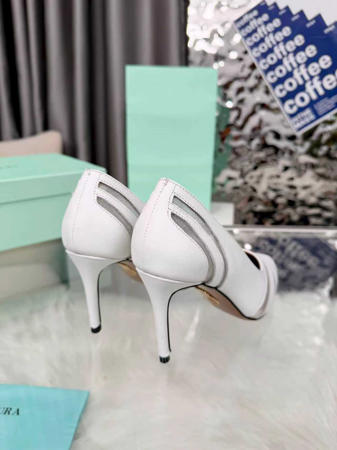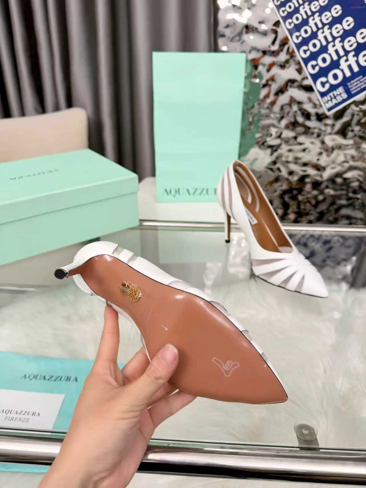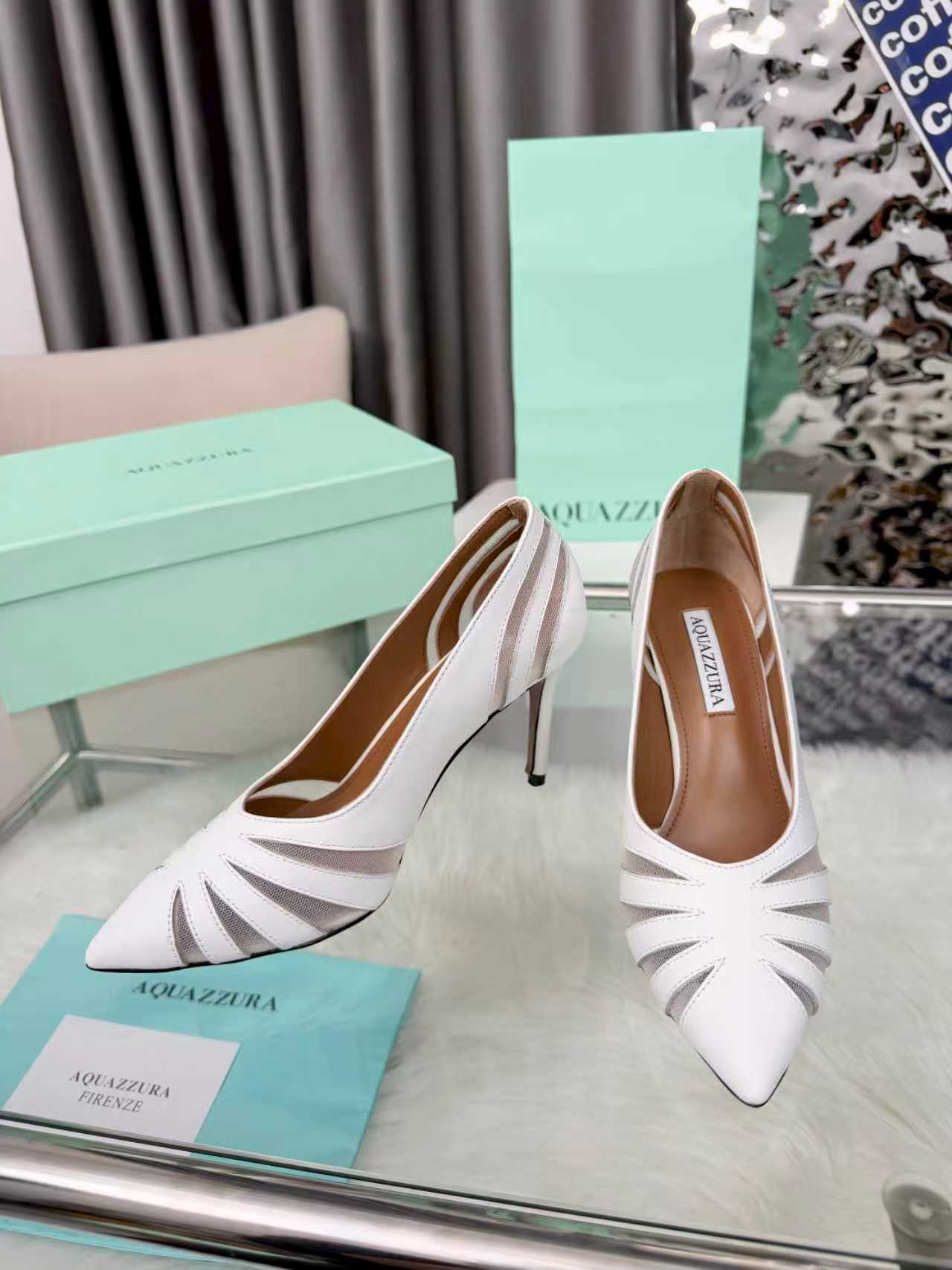 这款鞋子是AAAAA 1:1 质量 (非常棒). 使用了和原版一模一样的材料. 商标部分也保持了和Aquazzura一样. 图片拍摄是实物鞋子拍摄, 您所收到的实物保证和我们图片一模一样.