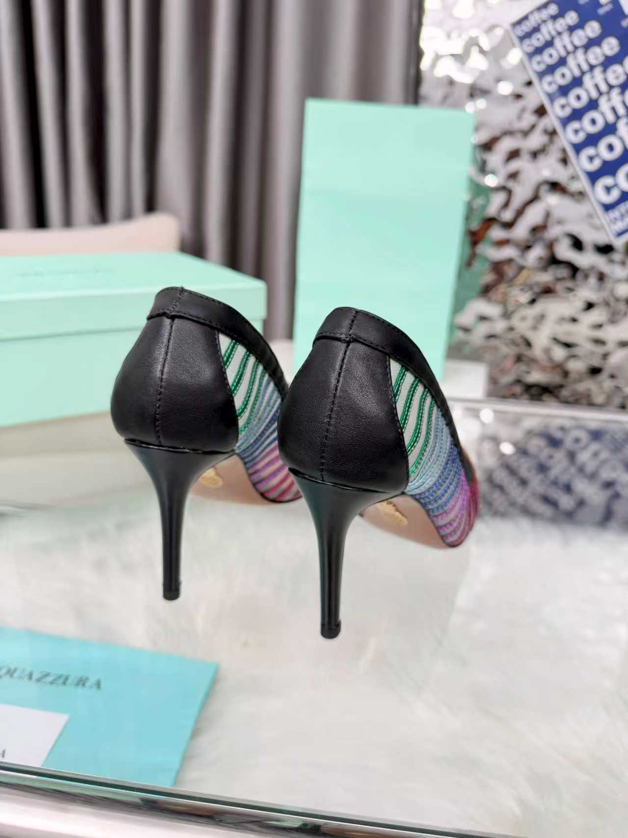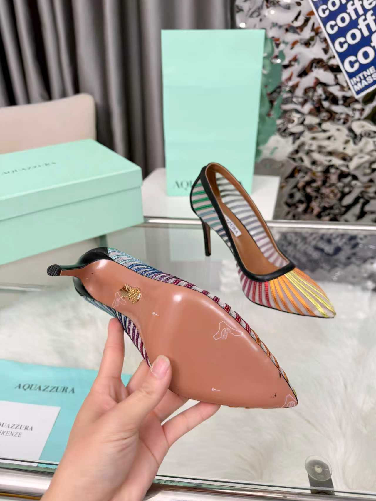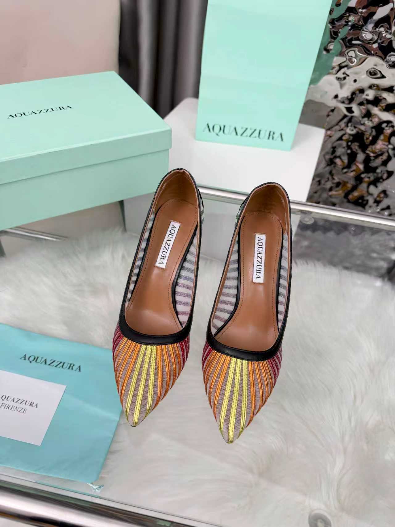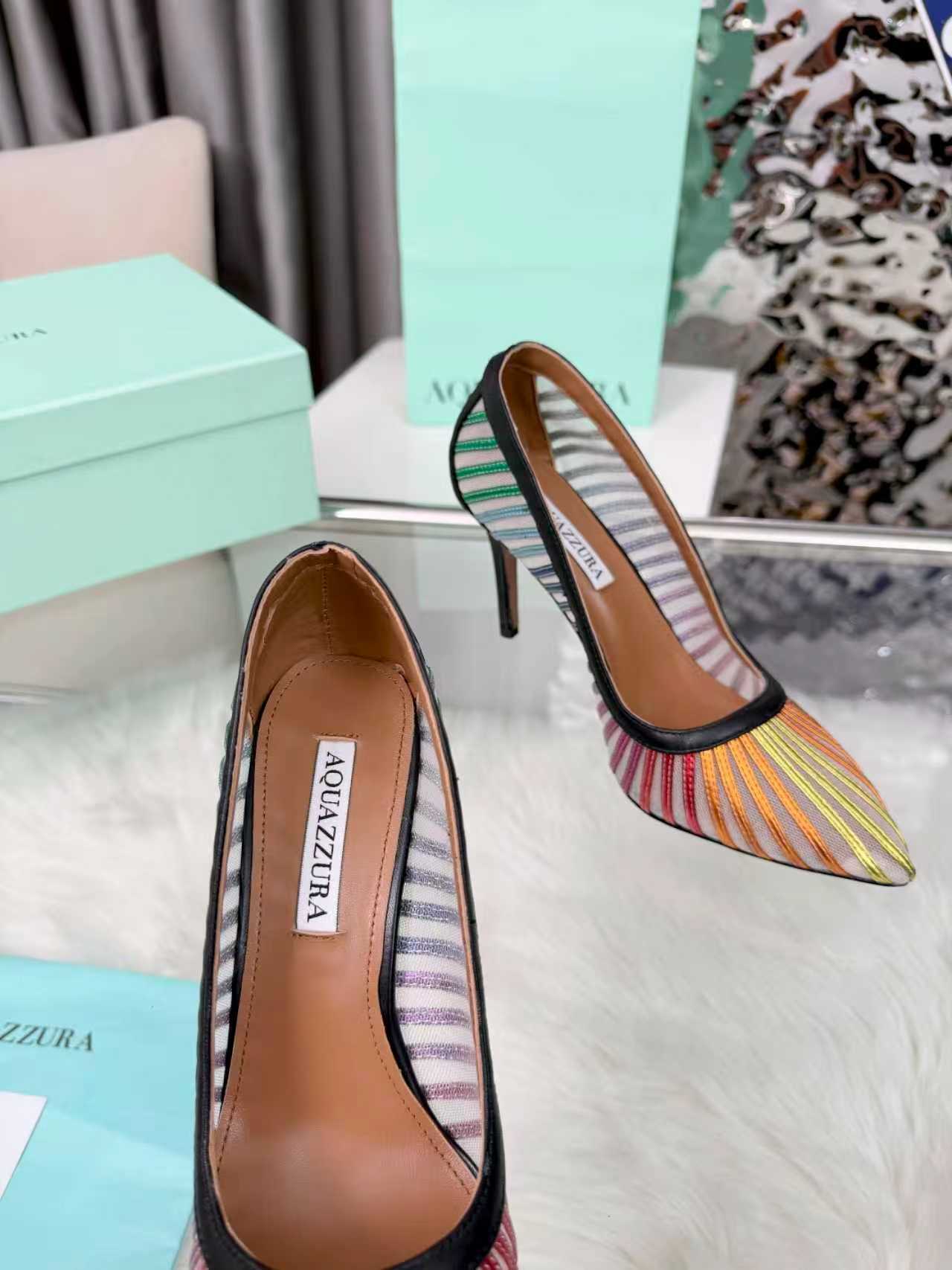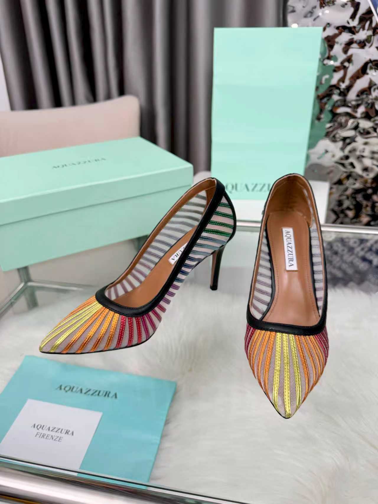 这款鞋子是AAAAA 1:1 质量 (非常棒). 使用了和原版一模一样的材料. 商标部分也保持了和Aquazzura一样. 图片拍摄是实物鞋子拍摄, 您所收到的实物保证和我们图片一模一样.
