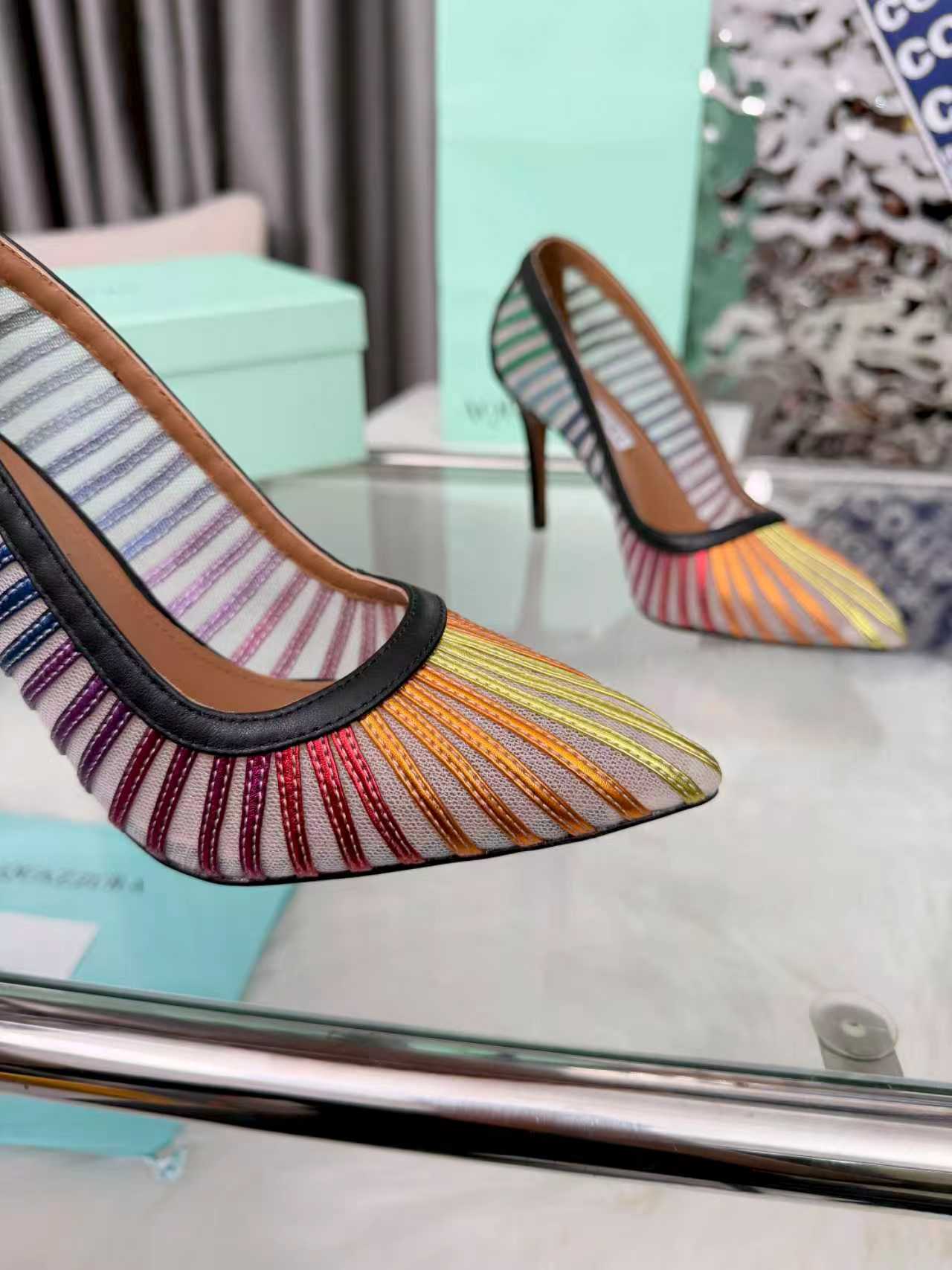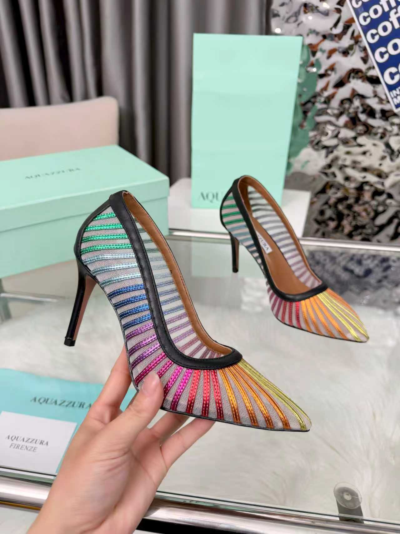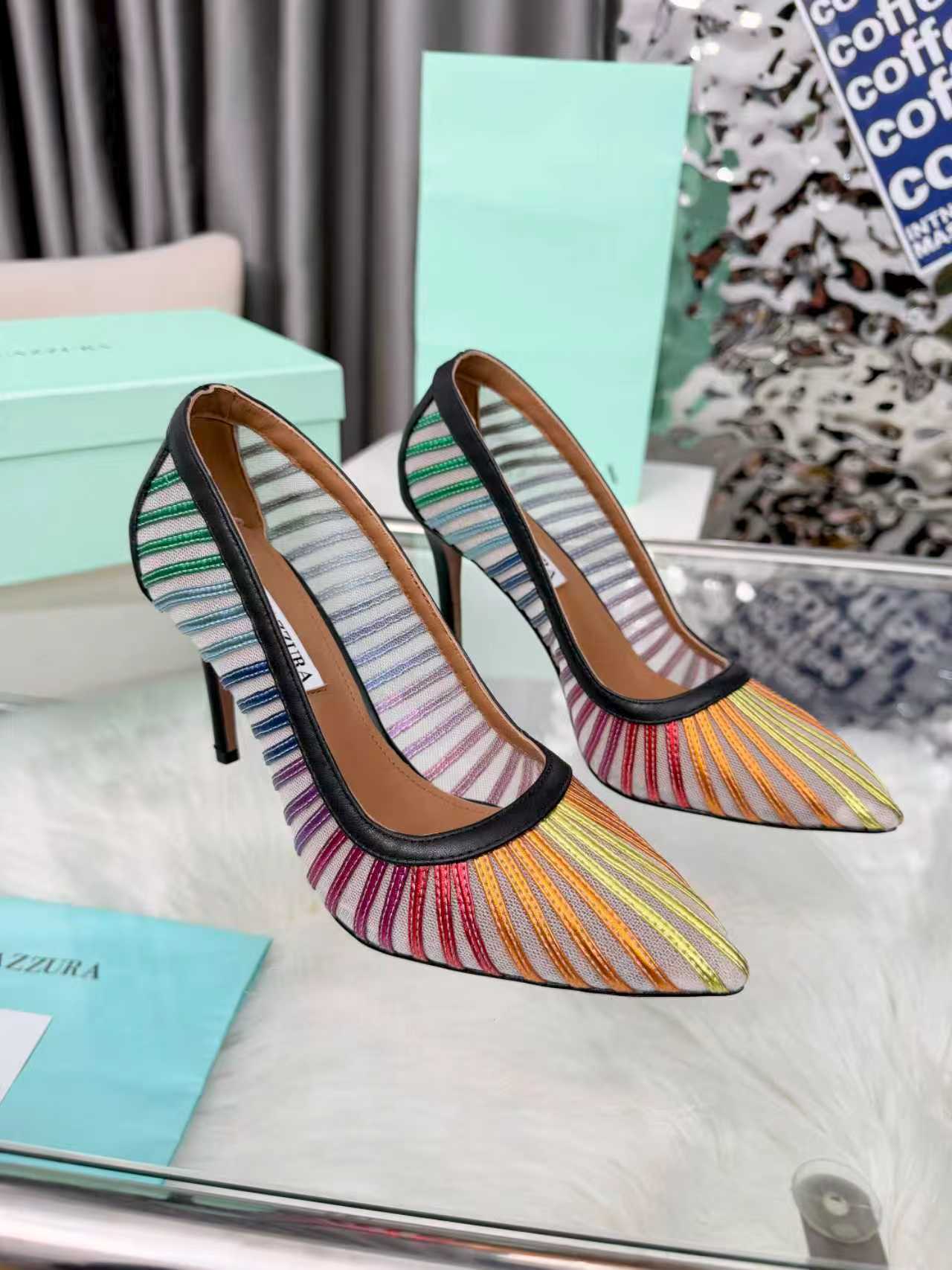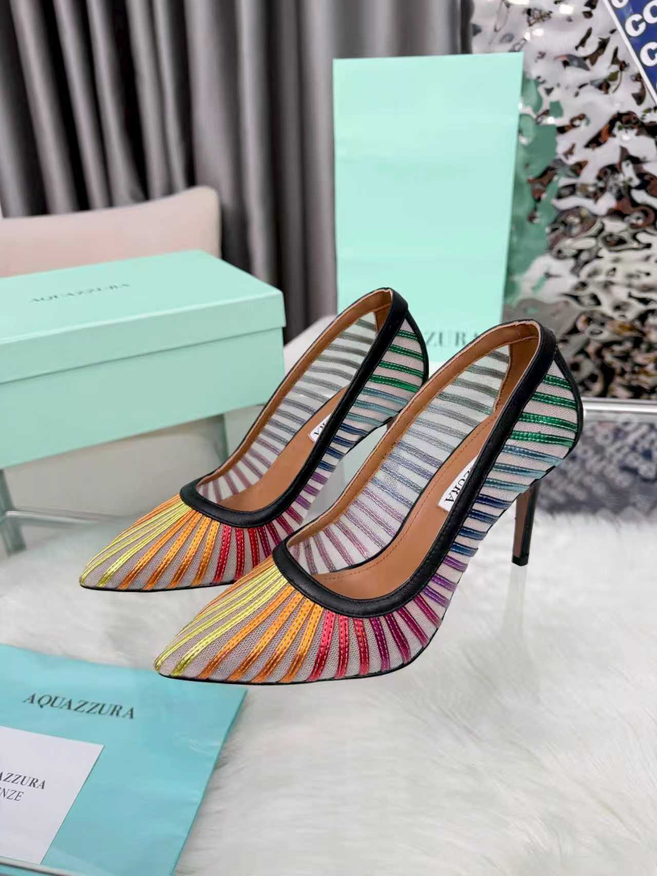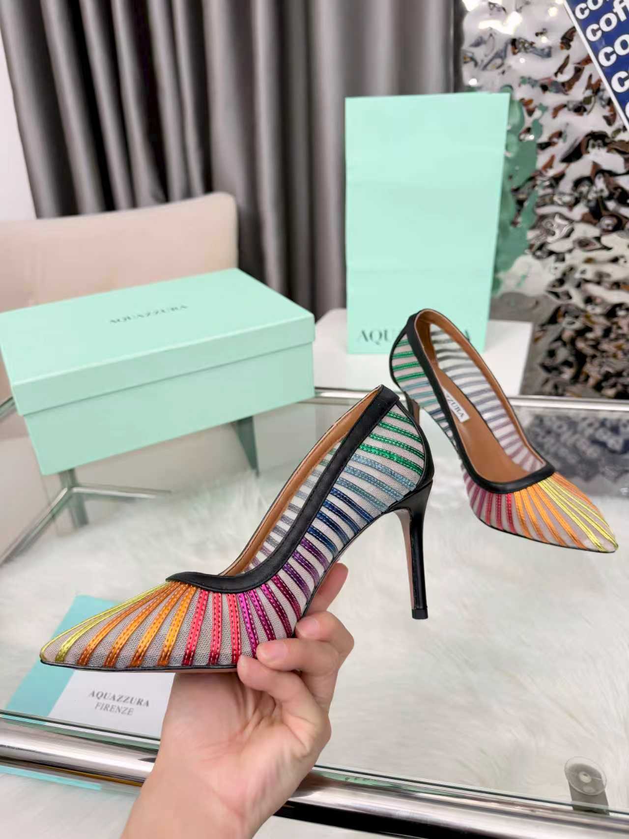 这款鞋子是AAAAA 1:1 质量 (非常棒). 使用了和原版一模一样的材料. 商标部分也保持了和Aquazzura一样. 图片拍摄是实物鞋子拍摄, 您所收到的实物保证和我们图片一模一样.