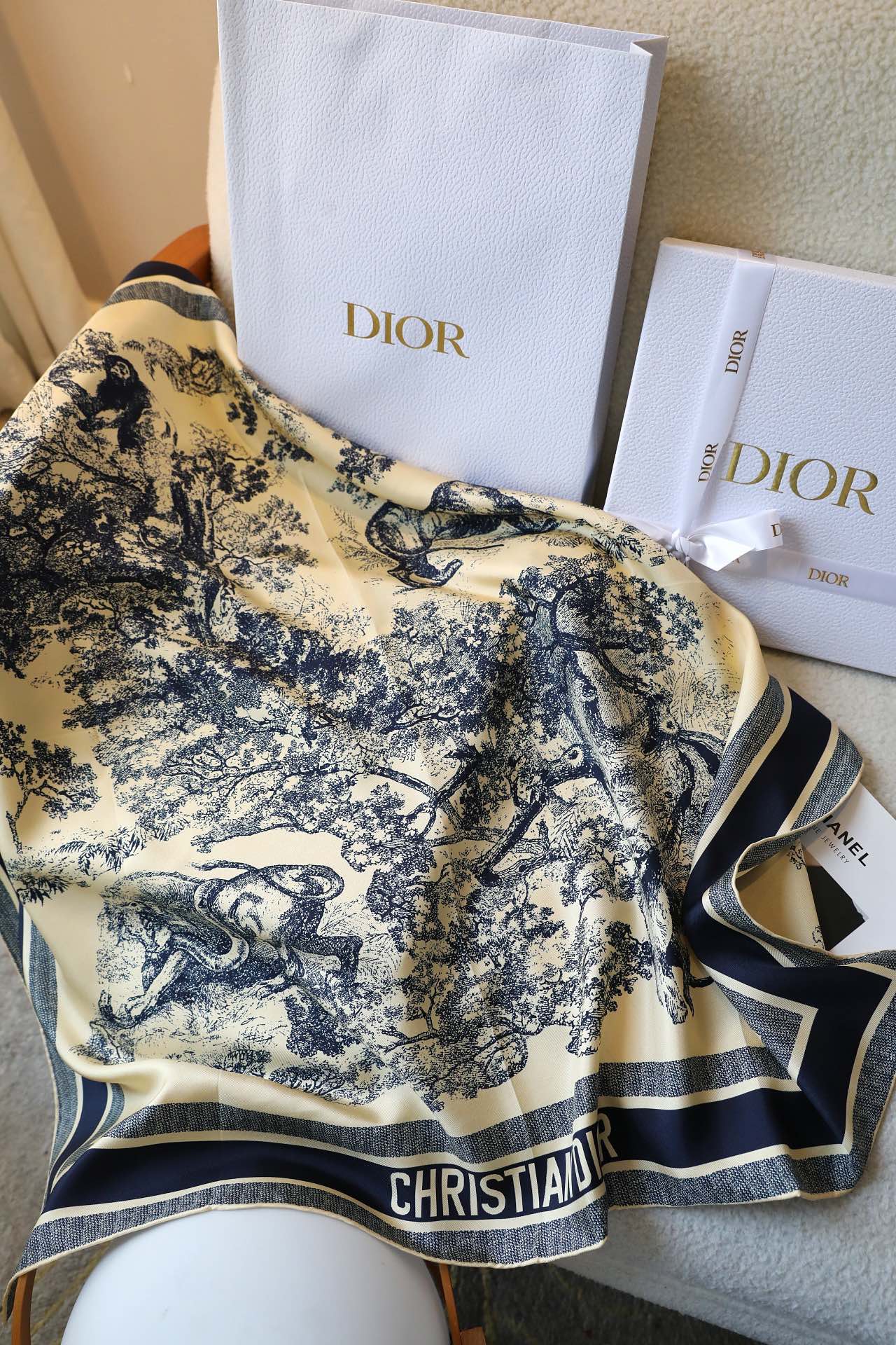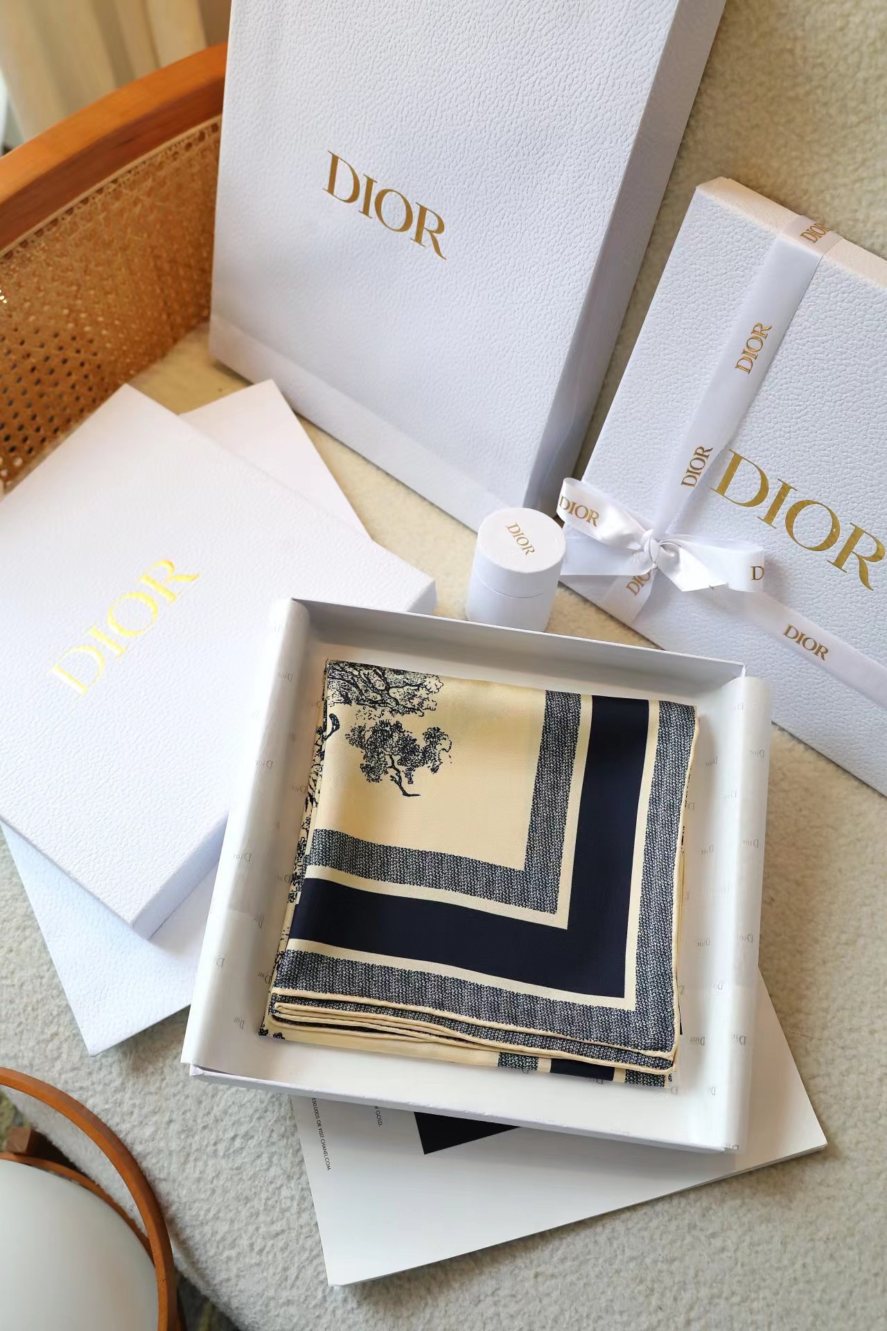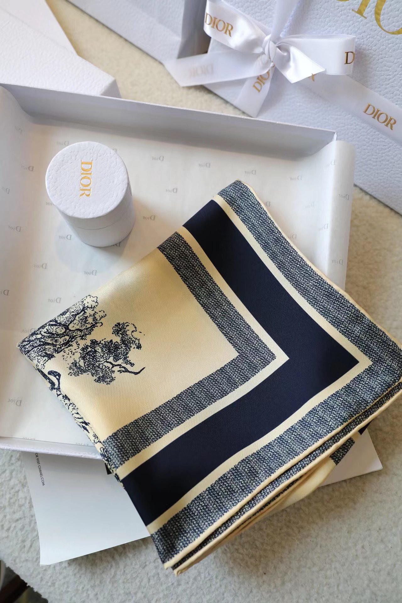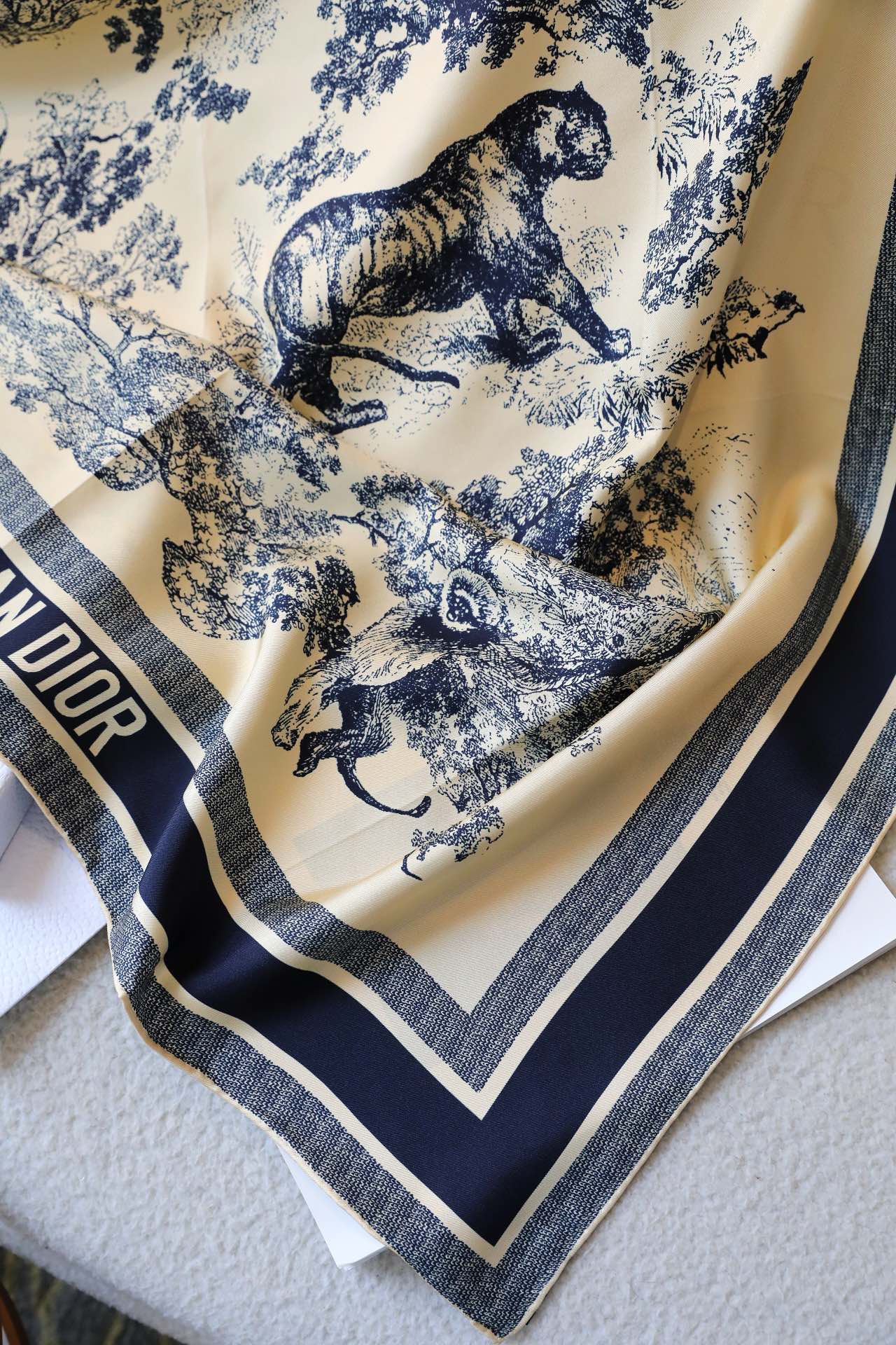 这款围巾是AAAAA 1:1 质量 (非常棒). 使用了和原版一模一样的材料. 商标部分也保持了和迪奥/Dior一样. 图片拍摄是实物围巾拍摄, 您所收到的实物保证和我们图片一模一样.